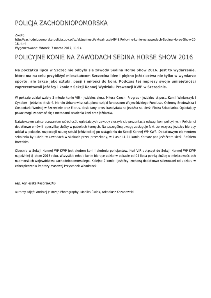 POLICJA ZACHODNIOPOMORSKA Źródło: http://zachodniopomorska.policja.gov.pl/sz/aktualnosci/aktualnosci/4948,Policyjne-konie-na-zawodach-Sedina-Horse-Show-20 16.html Wygenerowano: Wtorek, 7 marca 2017, 11:14 POLICYJNE KONIE NA ZAWODACH SEDINA HORSE SHOW 2016 Na początku lipca w Szczecinie odbyły się zawody Sedina Horse Show 2016. Jest to wydarzenie, które ma na celu przybliżyć mieszkańcom Szczecina idee i piękno jeździectwa nie tylko w wymiarze sportu, ale także jako sztuki, pasji i miłości do koni. Podczas tej imprezy swoje umiejętności zaprezentowali jeźdźcy i konie z Sekcji Konnej Wydziału Prewencji KWP w Szczecinie. W pokazie udział wzięły 3 młode konie VIR - jeździec sierż. Miłosz Czech, Progres - jeździec st.post. Kamil Winiarczyk i Cynober - jeździec st.sierż. Marcin Urbanowicz zakupione dzięki funduszom Wojewódzkiego Funduszu Ochrony Środowiska i Gospodarki Wodnej w Szczecinie oraz Elbrus, dosiadany przez kandydata na jeźdźca st. sierż. Piotra Szkudlarka. Oglądający pokaz mogli zapoznać się z metodami szkolenia koni oraz jeźdźców. Największym zainteresowaniem wśród osób oglądających zawody cieszyła się prezentacja odwagi koni policyjnych. Policjanci dodatkowo omówili specyfikę służby w patrolach konnych. Na szczególną uwagę zasługuje fakt, że wszyscy jeźdźcy biorący udział w pokazie, rozpoczęli naukę sztuki jeździeckiej po wstąpieniu do Sekcji Konnej WP KWP. Dodatkowym elementem szkolenia był udział w zawodach w skokach przez przeszkody, w klasie LL i L konia Korsarz pod jeźdźcem sierż. Rafałem Boreckim. Obecnie w Sekcji Konnej WP KWP jest siedem koni i siedmiu policjantów. Koń VIR dołączył do Sekcji Konnej WP KWP najpóźniej tj latem 2015 roku. Wszystkie młode konie biorące udział w pokazie od 04 lipca pełnią służbę w miejscowościach nadmorskich województwa zachodniopomorskiego. Kolejne 2 konie i jeźdźcy, zostaną dodatkowo skierowani od udziału w zabezpieczeniu imprezy masowej Przystanek Woodstock. asp. Agnieszka Kasprzak/AG autorzy zdjęć: Andrzej Jastrząb Photography, Monika Ćwiek, Arkadiusz Kozanowski Policyjne konie na zawodach Sedina Horse Show 2016 Policyjne konie na zawodach Sedina Horse Show 2016 Policyjne konie na zawodach Sedina Horse Show 2016 Policyjne konie na zawodach Sedina Horse Show 2016 Policyjne konie na zawodach Sedina Horse Show 2016 Policyjne konie na zawodach Sedina Horse Show 2016 Policyjne konie na zawodach Sedina Horse Show 2016 Policyjne konie na zawodach Sedina Horse Show 2016 Policyjne konie na zawodach Sedina Horse Show 2016 Policyjne konie na zawodach Sedina Horse Show 2016 Policyjne konie na zawodach Sedina Horse Show 2016 Policyjne konie na zawodach Sedina Horse Show 2016 Ocena: 1.5/5 (4) Tweetnij