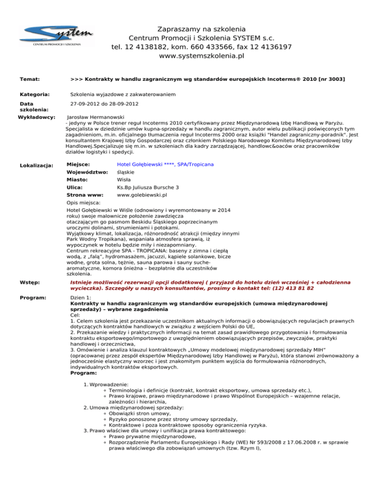 Zapraszamy na szkolenia Centrum Promocji i Szkolenia SYSTEM s.c. tel. 12 4138182, kom. 660 433566, fax 12 4136197 www.systemszkolenia.pl Temat: >>> Kontrakty w handlu zagranicznym wg standardów europejskich Incoterms® 2010 [nr 3003] Kategoria: Szkolenia wyjazdowe z zakwaterowaniem Data szkolenia: 27-09-2012 do 28-09-2012 Wykładowcy: Lokalizacja: Jarosław JarosławHermanowski Hermanowski - -jedyny jedynywwPolsce Polscetrener trenerreguł regułIncoterms Incoterms2010 2010certyfikowany certyfikowanyprzez przezMiędzynarodową MiędzynarodowąIzbę IzbęHandlową HandlowąwwParyżu. Paryżu. Specjalista Specjalistawwdziedzinie dziedzinieumów umówkupna-sprzedaży kupna-sprzedażywwhandlu handluzagranicznym, zagranicznym,autor autorwielu wielupublikacji publikacjipoświęconych poświęconychtym tym zagadnieniom, zagadnieniom,m.in. m.in.oficjalnego oficjalnegotłumaczenia tłumaczeniareguł regułIncoterms Incoterms2000 2000oraz orazksiążki książki"Handel "Handelzagraniczny-poradnik". zagraniczny-poradnik".Jest Jest konsultantem konsultantemKrajowej KrajowejIzby IzbyGospodarczej Gospodarczejoraz orazczłonkiem członkiemPolskiego PolskiegoNarodowego NarodowegoKomitetu KomitetuMiędzynarodowej MiędzynarodowejIzby Izby Handlowej.Specjalizuje Handlowej.Specjalizujesię sięm.in. m.in.wwszkoleniach szkoleniachdla dlakadry kadryzarządzającej, zarządzającej,handlowc&oaców handlowc&oacóworaz orazpracowników pracowników działów działówlogistyki logistykii ispedycji. spedycji. Miejsce: Hotel Gołębiewski ****, SPA/Tropicana Miejsce: Hotel Gołębiewski ****, SPA/Tropicana Województwo: Województwo: śląskie śląskie Miasto: Wisła Miasto: Wisła Ulica: Ulica: Strona www: Strona www: Ks.Bp Juliusza Bursche 33 Ks.Bp Juliusza Bursche www.golebiewski.pl www.golebiewski.pl Opis miejsca: Opis miejsca: Hotel Gołębiewski ww Wiśle (odnowiony i wyremontowany ww 2014 Hotel Gołębiewski Wiśle (odnowiony i wyremontowany 2014 roku) swoje malownicze położenie zawdzięcza roku) swoje malownicze położenie zawdzięcza otaczającym gogo pasmom Beskidu Śląskiego poprzecinanym otaczającym pasmom Beskidu Śląskiego poprzecinanym uroczymi dolinami, strumieniami i potokami. uroczymi dolinami, strumieniami i potokami. Wyjątkowy klimat, lokalizacja, różnorodność atrakcji (między innymi Wyjątkowy klimat, lokalizacja, różnorodność atrakcji (między innymi Park Wodny Tropikana), wspaniała atmosfera sprawią, iż iż Park Wodny Tropikana), wspaniała atmosfera sprawią, wypoczynek ww hotelu będzie miły i niezapomniany. wypoczynek hotelu będzie miły i niezapomniany. Centrum rekreacyjne SPA - TROPICANA: baseny z zimna i ciepłą Centrum rekreacyjne SPA - TROPICANA: baseny z zimna i ciepłą wodą, z „falą”, hydromasażem, jacuzzi, kąpiele solankowe, bicze wodą, z „falą”, hydromasażem, jacuzzi, kąpiele solankowe, bicze wodne, grota solna, tężnie, sauna parowa i sauny suchewodne, grota solna, tężnie, sauna parowa i sauny suchearomatyczne, komora śnieżna – bezpłatnie dla uczestników aromatyczne, komora śnieżna – bezpłatnie dla uczestników szkolenia. szkolenia. Wstęp: Istnieje możliwość rezerwacji opcji dodatkowej ( przyjazd do hotelu dzień wcześniej + całodzienna wycieczka). Szczegóły u naszych konsultantów, prosimy o kontakt tel: (12) 413 81 82 Program: Dzien 1: Kontrakty w handlu zagranicznym wg standardów europejskich (umowa międzynarodowej sprzedaży) – wybrane zagadnienia Cel: 1. Celem szkolenia jest przekazanie uczestnikom aktualnych informacji o obowiązujących regulacjach prawnych dotyczących kontraktów handlowych w związku z wejściem Polski do UE, 2. Przekazanie wiedzy i praktycznych informacji na temat zasad prawidłowego przygotowania i formułowania kontraktu eksportowego/importowego z uwzględnieniem obowiązujących przepisów, zwyczajów, praktyki handlowej i orzecznictwa, 3. Omówienie i analiza klauzul kontraktowych „Umowy modelowej międzynarodowej sprzedaży MIH” (opracowanej przez zespół ekspertów Międzynarodowej Izby Handlowej w Paryżu), która stanowi zrównoważony a jednocześnie elastyczny wzorzec i jest znakomitym punktem wyjścia do formułowania różnorodnych, indywidualnych kontraktów eksportowych. Program: 1. Wprowadzenie: Terminologia i definicje (kontrakt, kontrakt eksportowy, umowa sprzedaży etc.), Prawo krajowe, prawo międzynarodowe i prawo Wspólnot Europejskich – wzajemne relacje, zależności i hierarchia, 2. Umowa międzynarodowej sprzedaży: Obowiązki stron umowy, Ryzyko ponoszone przez strony umowy sprzedaży, Kontraktowe i poza kontraktowe sposoby ograniczenia ryzyka. 3. Prawo właściwe dla umowy i unifikacja prawa kontraktowego: Prawo prywatne międzynarodowe, Rozporządzenie Parlamentu Europejskiego i Rady (WE) Nr 593/2008 z 17.06.2008 r. w sprawie prawa właściwego dla zobowiązań umownych (tzw. Rzym I), Konwencja NZ o umowach międzynarodowej sprzedaży (konwencja wiedeńska), Kodyfikacje prywatne (soft law) – Zasady Międzynarodowych Umów Handlowych UNIDROIT i Zasady Europejskiego Prawa Kontraktów (PECL). 4. Rozstrzyganie sporów z kontraktów międzynarodowych: Arbitraż, Sądownictwo powszechne. 5. Jurysdykcja i wykonalność wyroków: Konwencje brukselska i lugańska o jurysdykcji i wykonywaniu orzeczeń sądowych w sprawach cywilnych i handlowych, Rozporządzenie Rady (WE) nr 44/2001 w sprawie jurysdykcji i uznawania orzeczeń sądowych oraz ich wykonywania w sprawach cywilnych i handlowych, Konwencja nowojorska o uznawaniu i wykonywaniu zagranicznych orzeczeń arbitrażowych, 6. Analiza klauzul kontraktowych „Umowy modelowej międzynarodowej sprzedaży MIH”: Ogólna charakterystyka umowy modelowej MIH (zakres stosowania, zależność między Częścią Szczególną (A) i Ogólnymi Warunkami (B), zmiany i uzupełnienia), Prawo właściwe, Cena, Warunki płatności, Warunki wysyłki i dostawy, Termin dostawy, Zastrzeżenie własności, Ograniczenie wysokośc