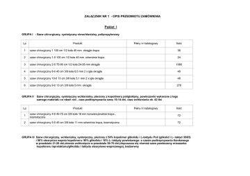 ZALĄCZNIK NR 1 - OPIS PRZEDMIOTU ZAMÓWIENIA Pakiet I GRUPA I - Szew chirurgiczny, syntetyczny niewchłanialny, polipropylenowy Lp Produkt Pełny nr katalogowy Ilość 1 szew chirurgiczny 1 100 cm 1/2 koła 45 mm okrągło-tnąca 36 2 szew chirurgiczny 1-0 100 cm 1/2 koła 40 mm odwrotnie tnąca 24 3 szew chirurgiczny 2-0 75-90 cm 1/2 koła 24-26 mm okrągła 4 szew chirurgiczny 8-0 45 cm 3/8 koła 6,5 mm 2 x igła okrągła 48 5 szew chirurgiczny 10-0 13 cm 3/8 koła 5,1 mm 2 x igła okrągła 48 6 szew chirurgiczny 9-0 13 cm 3/8 koła 5 mm okrągła 276 GRUPA II Lp 1080 Szew chirurgiczny, syntetyczny wchłanialny, pleciony z kopolimeru poliglaktyny, powleczenie wykonane z tego samego materiału co rdzeń nici , czas podtrzymywania szwu 10-14 dni, czas wchłaniania ok. 42 dni Produkt Pełny nr katalogowy Ilość 1 szew chirurgiczny 4-0 45-75 cm 3/8 koła 16 mm konwencjonalnie tnąca , kosmetyczna 72 2 szew chirurgiczny 5-0 45 cm 3/8 koła 11 mm odwrotnie tnąca, kosmetyczna 72 GRUPA III Szew chirurgiczny, wchłanialny, syntetyczny, pleciony z 50% kopolimer glikolidu i L-laktydu Poli (glikolid i L- laktyd 35/65) i 50% stearynian wapnia kopolimeru: 90% glikolidu i 10% L- laktydy powlekanego: o czasie podtrzymywania tkankowego w przedziale 21-28 dni,okresie wchłonięcia w przedziale 56-70 dni.(dopuszcza się również szew powleczony mieszanka kopolimeru laprolaktonu/glikolidu i laktydu stearylowo-wapniowego), bezbarwny Lp Produkt Pełny nr katalogowy Ilość 1 szew chirurgiczny 3-0 45-70 cm 3/8 koła 17-19 mm odwrotnie tnaca 384 2 szew chirurgiczny 3-0 45-70 cm 3/8 koła 24-26 mm odwrotnie tnaca 600 5 szew chirurgiczny 4-0 45 cm 3/8 koła 16-17 mm konwencjonalnie tnącakosmetyczna 900 3 szew chirurgiczny 5-0 45-70 cm 1/2 koła 11-13 mm okrągła 180 4 szew chirurgiczny 6-0 45-70 cm 1/2 koła 11-13 mm okrągła 108 5 szew chirurgiczny 1 "J" 45-75 cm 30-32 mm okrągło-tnaca 48 GRUPA IV - Szew niewchłaniany, syntetyczny, pleciony, nylonowy Lp Produkt Pełny nr katalogowy Ilość saszetek 1 szew chirurgiczny 1 75-100 cm ½ koła 40 mm okrągła z krótkim tnącym końcem / okrągło-tnąca 24 2 szew chirurgiczny 1 75-90 cm ½ koła 21-23 mm odwrotnie tnąca wzmocniona 576 3 szew chirurgiczny 1-0 75-100 cm ½ koła 40 mm okrągła z krótkim tnącym końcem / okrągło-tnąca 60 4 szew chirurgiczny 1-0 10 x 75 cm 60 5 szew chirurgiczny 2-0 10 x 75 cm 60 Pakiet II - Nici Okulistyczne Szew chirurgiczny, wchłanialny, syntetyczny, pleciony z 50% kopolimer tearynowo i L-laktydu Poli (glikolid i L- tearyn 35/65) i 50% stearynian wapnia kopolimeru: 90% tearynowo i 10% L- laktydy powlekanego: o czasie podtrzymywania tkankowego w przedziale 21-28 dni,okresie wchłonięcia w przedziale 56-70 dni.(dopuszcza się również szew powleczony mieszanka kopolimeru laprolaktonu/ tearynowo i tearyn tearynowo-wapniowego) Produkt Pełny nr katalogowy Ilość saszetek 7-0 30 cm 3/8 koła 6-6,6 mm szpatułka 96 8-0 30 cm 3/8 koła 6-6,5 mm szpatułka 120 WYMAGANIA DLA PAKIETU 1 i 2 KODY KRESKOWE NA OPAKOWANIACH ZBIORCZYCH KODY KRESKOWE LUB MATRYCOWE NA POJEDYNCZYCH SASZETKACH Pakiet III PRODUKT ROZMIAR RODZAJ OP. ILOŚĆ OP. 6 cm x 11 cm siatka płaska szt. 25 1 Siatki częściowo wchłanialne, monofilamentowe z kompozytu polipropylenu i poliglekapronu- 25, o gramaturze 28 g/m2, średnicy porów 3-4 mm, grubości filamentów do 1 mm, z nikskim odsetkiem kurczenia po implantacji - do 2 % i czasem absorbcji części wchłanialnej do 84 dni 10 cm x 15 cm siatka płaska szt. 10 2 Siatki częściowo wchłanialne, monofilamentowe z kompozytu polipropylenu i poliglekapronu- 25, o gramaturze 28 g/m2, średnicy porów 3-4 mm, grubości filamentów wymiary siatki zewnętrznej 6 x do 1 mm, z nikskim odsetkiem kurczenia po implantacji - do 2 % 12 cm i średnicy siatki i czasem absorbcji części wchłanialnej do 84 dni. siatka wewnętrznej 7-12 cm przestrzenna (dwie siatki płaskie trwale połączone łącznikiem do zaopatrywania przepuklin pachwinowych) szt. 5
