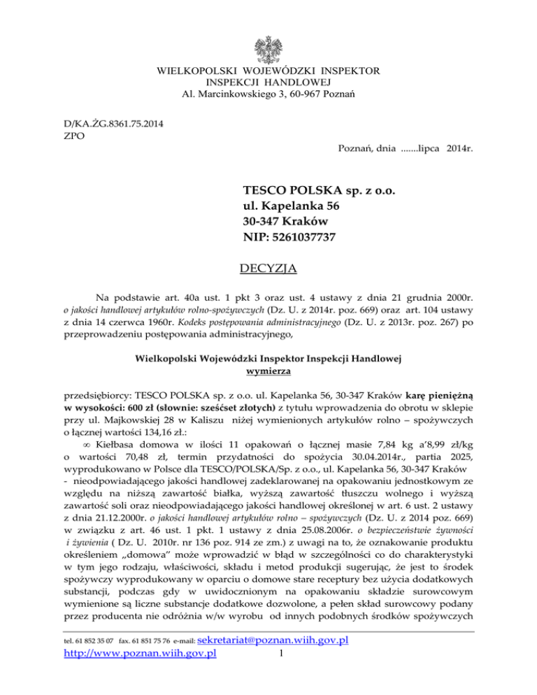 WIELKOPOLSKI WOJEWÓDZKI INSPEKTOR INSPEKCJI HANDLOWEJ Al. Marcinkowskiego 3, 60-967 Poznań D/KA.ŻG.8361.75.2014 ZPO Poznań, dnia .......lipca 2014r. TESCO POLSKA sp. z o.o. ul. Kapelanka 56 30-347 Kraków NIP: 5261037737 DECYZJA Na podstawie art. 40a ust. 1 pkt 3 oraz ust. 4 ustawy z dnia 21 grudnia 2000r. o jakości handlowej artykułów rolno-spożywczych (Dz. U. z 2014r. poz. 669) oraz art. 104 ustawy z dnia 14 czerwca 1960r. Kodeks postępowania administracyjnego (Dz. U. z 2013r. poz. 267) po przeprowadzeniu postępowania administracyjnego, Wielkopolski Wojewódzki Inspektor Inspekcji Handlowej wymierza przedsiębiorcy: TESCO POLSKA sp. z o.o. ul. Kapelanka 56, 30-347 Kraków karę pieniężną w wysokości: 600 zł (słownie: sześćset złotych) z tytułu wprowadzenia do obrotu w sklepie przy ul. Majkowskiej 28 w Kaliszu niżej wymienionych artykułów rolno – spożywczych o łącznej wartości 134,16 zł.: • Kiełbasa domowa w ilości 11 opakowań o łącznej masie 7,84 kg a’8,99 zł/kg o wartości 70,48 zł, termin przydatności do spożycia 30.04.2014r., partia 2025, wyprodukowano w Polsce dla TESCO/POLSKA/Sp. z o.o., ul. Kapelanka 56, 30-347 Kraków - nieodpowiadającego jakości handlowej zadeklarowanej na opakowaniu jednostkowym ze względu na niższą zawartość białka, wyższą zawartość tłuszczu wolnego i wyższą zawartość soli oraz nieodpowiadającego jakości handlowej określonej w art. 6 ust. 2 ustawy z dnia 21.12.2000r. o jakości handlowej artykułów rolno – spożywczych (Dz. U. z 2014 poz. 669) w związku z art. 46 ust. 1 pkt. 1 ustawy z dnia 25.08.2006r. o bezpieczeństwie żywności i żywienia ( Dz. U. 2010r. nr 136 poz. 914 ze zm.) z uwagi na to, że oznakowanie produktu określeniem „domowa” może wprowadzić w błąd w szczególności co do charakterystyki w tym jego rodzaju, właściwości, składu i metod produkcji sugerując, że jest to środek spożywczy wyprodukowany w oparciu o domowe stare receptury bez użycia dodatkowych substancji, podczas gdy w uwidocznionym na opakowaniu składzie surowcowym wymienione są liczne substancje dodatkowe dozwolone, a pełen skład surowcowy podany przez producenta nie odróżnia w/w wyrobu od innych podobnych środków spożywczych tel. 61 852 35 07 fax. 61 851 75 76 e-mail: [email protected] http://www.poznan.wiih.gov.pl 1 WIELKOPOLSKI WOJEWÓDZKI INSPEKTOR INSPEKCJI HANDLOWEJ Al. Marcinkowskiego 3, 60-967 Poznań występujących na rynku. • Konserwa tyrolska a’300 g w ilości 32 opakowania a’199 zł wartość 63,68 zł, data minimalnej trwałości: 12.2015, partia 16 BB 454 3, wyprodukowano w Polsce dla TESCO/POLSKA/Sp. z o.o., ul. Kapelanka 56, 30-347 Kraków - nieodpowiadającego jakości handlowej zadeklarowanej na opakowaniu jednostkowym ze względu na wyższą zawartość białka i niższą zawartość tłuszczu wolnego. Art. 40a ust. 1 pkt 3 ustawy z dnia 21.12.2000 r. o jakości handlowej artykułów rolno – spożywczych (Dz. U. z 2014, poz. 669), każdy kto wprowadza do obrotu artykuły rolnospożywcze nieodpowiadające jakości handlowej określonej w przepisach o jakości handlowej lub deklarowanej przez producenta w oznakowaniu tych artykułów, podlega karze pieniężnej w wysokości do pięciokrotnej wartości korzyści majątkowej uzyskanej lub która mogłaby zostać uzyskana przez wprowadzenie tych artykułów rolno-spożywczych do obrotu, nie niższej jednak niż 500 zł. UZASADNIENIE W dniach od 11,14,17.04.2014r. na podstawie upoważnienia Wielkopolskiego Wojewódzkiego Inspektora Inspekcji Handlowej nr D/KA.ŻG.8361.75.2014 z dnia 11 kwietnia 2014r. inspektorzy Wojewódzkiego Inspektoratu Inspekcji Handlowej w Poznaniu Delegatura w Kaliszu przeprowadzili kontrolę u przedsiębiorcy w hipermarkecie w Kaliszu, ul. Majkowska 28 na podstawie przepisów: art. 3 ust. 1-3 rozporządzenia Parlamentu Europejskiego i Rady (WE) Nr 882/2004 z dnia 29 kwietnia 2004r. w sprawie kontroli urzędowych przeprowadzanych w celu sprawdzenia zgodności z prawem paszowym i żywnościowym oraz regułami dotyczącymi zdrowia zwierząt i dorastaniu zwierząt (Dz. Urz. UE L 165 z 30.04.2004r. ze zm.) art. 17 ust. 3 ustawy z dnia 21 grudnia 2000r. o jakości handlowej artykułów rolno – spożywczych (Dz. U. 2014 poz. 669), art. 3 ust. 1 pkt 1,2 i 6 ustawy z dnia 15 grudnia 2000r. o Inspekcji Handlowej (Dz. U. z 2014 poz. 148). W toku czynności kontrolnych sprawdzono prawidłowość oznakowania oraz pobrano do badań laboratoryjnych próbki niżej wymienionych produktów: • Kiełbasa domowa w ilości 11 opakowań o łącznej masie 7,84 kg a’8,99 zł/kg o wartości 70,48 zł, termin przydatności do spożycia 30.04.2014r., partia 2025, wyprodukowano w Polsce dla TESCO/POLSKA/Sp. z o.o., ul. Kapelanka 56, 30-347 Kraków • Konserwa tyrolska a’300 g w ilości 32 opakowania a’199 zł wartość 63,68 zł, data minimalnej trwałości: 12.2015, partia 16 BB 454 3, wyprodukowano w Polsce dla TESCO/POLSKA/Sp. z o.o., ul. Kapelanka 56, 30-347 Kraków Równocześnie z pobraniem próbek produktów pobrano i zabezpieczono próbki kontrolne w ilości i asortymencie takim samym jaki przekazano do badań. Badania laboratoryjne przeprowadzono w Laboratorium Kontrolno – Analitycznym z siedzibą w Poznaniu Urzędu Ochrony Konkurencji i konsumentów z siedzibą w Warszawie. Na podstawie sprawozdania z badań nr 110/2014 stwierdzono w badanej próbce produktu Kiełbasa domowa, kiełbasa średniorozdrobniona, wędzona, parzona w porównaniu z wymaganiami określonymi w informacji Producenta na opakowaniu tel. 61 852 35 07 fax. 61 851 75 76 e-mail: [email protected] http://www.poznan.wiih.gov.pl 1 WIELKOPOLSKI WOJEWÓDZKI INSPEKTOR INSPEKCJI HANDLOWEJ Al. Marcinkowskiego 3, 60-967 Poznań jednostkowym niższą zawartość netto, niższą zawartość białka, wyższą zawartość tłuszczu wolnego i wyższą zawartość soli kuchennej. Na podstawie sprawozdania z badań nr 111/2014 stwierdzono w badan