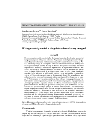 CHEMISTRY, ENVIRONMENT, BIOTECHNOLOGY 2010, XIV, 121–138 Kamila Anna Jochyma,b, Janusz Kapuśniaka a Instytut Chemii, Ochrony Środowiska i Biotechnologii, Akademia im. Jana Długosza, 42-200 Częstochowa, Armii Krajowej 13/15, Polska b Instytut Chemicznej Technologii Żywności, Wydział Biotechnologii i Nauk o Żywności, Politechnika Łódzka, 90-924 Łódź, Stefanowskiego 4/10, Polska e-mail: [email protected] Wzbogacanie żywności w długołańcuchowe kwasy omega-3 Abstrakt Nowoczesna żywność ma nie tylko dostarczać energii, ale również poprawiać lub podtrzymywać dobry stan zdrowia. Przykładem może być żywność wzbogacona długołańcuchowymi wielonienasyconymi kwasami tłuszczowymi (LC PUFA) z rodziny omega-3, szczególnie kwasem dokozaheksaenowym (DHA) oraz eikozapentaenowym (EPA). Kwasy te bardzo korzystnie oddziałują na układ krążenia oraz nerwowy. Niestety ich wytwarzanie w organizmie zachodzi z niewielką wydajnością. Dlatego głównym źródłem LC PUFA powinna być spożywana żywność. Najbogatsze w te dobroczynne kwasy są ryby i inne organizmy morskie, które niestety w większości krajów z tzw. zachodnim typem diety, w tym w Polsce, nie są spożywane w dostatecznej ilości. Dla uzupełnienia niedoborów można stosować suplementy diety oraz żywność wzbogaconą w omega-3. Wytwarzanie żywności z dodatkiem oleju rybiego wymaga pokonania wielu trudności technologicznych, przede wszystkim związanych z występowaniem „rybiego” posmaku i zapachu, a także z ochroną wielonienasyconych kwasów przed utlenianiem. Możliwym sposobem rozwiązania tych problemów jest dodawanie do żywności oleju rybiego w formie mikrokapsułek. Do enkapsulacji olejów bogatych w omega-3 LC PUFA stosuje się takie metody, jak: suszenie rozpyłowe, ekstruzję i koacerwację. Dla osiągnięcia jak najlepszej stabilności oksydatywnej LC PUFA istotny jest również odpowiedni dobór materiałów osłonkowych do mikrokapsułkowania. Zastosowanie substancji odpornych na trawienie w górnym odcinku przewodu pokarmowego stwarza nadzieję na kontrolowane dostarczanie kwasów omega-3 do jelita grubego. Słowa kluczowe: mikrokapsułkowanie, kwas eikozapentaenowy (EPA), kwas dokozaheksaenowy (DHA), olej rybi, wzbogacanie żywności Wprowadzenie W skład nowoczesnej żywności poza tradycyjnymi składnikami zapewniającymi jej wartość odżywczą, a więc białkami, cukrami czy tłuszczami, wchodzą również substancje zapewniające prozdrowotne działanie takiej żywności. K.A. Jochym, J. Kapuśniak 122 Obecność w żywności składników bioaktywnych czyni z niej żywność funkcjonalną, a zatem zgodnie z definicją ustaloną w 1999 r. w ramach programu FUFOSE (Functional Food Science in Europe), finansowanego przez Komisję Europejską: żywność o udokumentowanym korzystnym wpływie na jedną lub więcej funkcji organizmu ponad efekt odżywczy1. Produkcja takiej żywności może polegać na zwiększeniu lub zmniejszeniu w produkcie naturalnym zawartości określonego pozytywnego lub negatywnego składnika czynnego, bądź na dodaniu do produktu żywnościowego określonego składnika bioaktywnego2. Wśród biologicznie aktywnych składników żywności należy wymienić przede wszystkim: błonnik pokarmowy, probiotyki, prebiotyki, wielonienasycone kwasy tłuszczowe omega-3, poliole, witaminy, składniki mineralne, cholinę i lecytynę oraz fitozwiązki (polifenole, karotenoidy, flawonoidy)3,4. Ze względu na dużą nietrwałość niektórych składników bioaktywnych przy produkcji żywności funkcjonalnej istotne jest zastosowanie warunków, które pozwolą na zachowanie ich biologicznej aktywności. Do najbardziej nietrwałych i ze względu na swoją budowę chemiczną szczególnie narażonych na utlenianie związków bioaktywnych należą wielonienasycone kwasy tłuszczowe (polyunsaturated fatty acid, PUFA). Związki te ze względu na położenie pierwszego wiązania nienasyconego od metylowego końca łańcucha węglowego podzielono na trzy grupy: omega-3 (n-3), omega-6 (n6) i omega-9 (n-9). Największe znaczenie biologiczne mają kwasy należące do dwóch pierwszych rodzin. Do rodziny kwasów omega-3 należą: kwas αlinolenowy (ALA C18:3), kwas eikozapentaenowy (EPA C20:5) oraz kwas dokozaheksaenowy (DHA C22:6). W rodzinie kwasów omega-6 na uwagę zasługują przede wszystkim kwasy: linolowy (LA C18:2), γ-linolenowy (GLA C18:3) oraz arachidonowy (AA C20:4). Tradycyjnie, od lat 30-tych ubiegłego stulecia, kwasy α-linolenowy i linolowy uważa się za niezbędne nienasycone kwasy tłuszczowe (NNKT). Oznacza to, że kwasy takie są niezbędnym składnikiem diety ze względu na ważną rolę, jaką pełnią w procesach metabolicznych i nie mogą być syntetyzowane w organizmie człowieka. Znacznie później okazało się, że termin ten stosowany wyłącznie do tych dwóch kwasów jest nieodpowiedni, bo nie obserwuje się jednoznacznych objawów niedoboru kwasów linolowego i α-linolenowego wśród ludzi5. Ponadto kwasy te mogą powstawać w organizmie ssaków poprzez elongację obecnych w diecie kwasów heksadienowego C16:2 (prekursor LA) oraz heksadekatrienowego C16:3 (prekursor ALA). Przede wszystkim jednak zmiana rozumienia pojęcia NNKT związana jest z odkryciem, jak istotną rolę w prawidłowym funkcjonowaniu organizmu pełnią wielonienasycone kwasy o dłuższych łańcuchach. Zasadnicze funkcje fizjologiczne pełnią kwasy wielonienasycone o 20- i 22-węglowych łańcuchach, nazywane kwasami długołańcuchowymi – long chain polyunsaturated fatty acid (LC PUFA), przede wszystkim zaś należące do rodziny omega-3 EPA 123 Wzbogacanie żywności w długołańcuchowe kwasy omega-3 i DHA6. Kwas eikozapentaenowy może być wytwarzany w odpowiednim szlaku metabolicznym ze swojego prekursora (ALA), jednak wydajność jego przemiany jest niewielka. Znacznie mniejsza jest wydajność syntezy w organizmie DHA, który powstaje z EPA7. Ze względu na wie