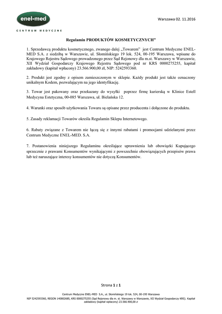 Warszawa 02. 11.2016 Regulamin PRODUKTÓW KOSMETYCZNYCH” 1. Sprzedawcą produktu kosmetycznego, zwanego dalej „Towarem” jest Centrum Medyczne ENELMED S.A. z siedzibą w Warszawie, ul. Słomińskiego 19 lok. 524, 00-195 Warszawa, wpisane do Krajowego Rejestru Sądowego prowadzonego przez Sąd Rejonowy dla m.st. Warszawy w Warszawie, XII Wydział Gospodarczy Krajowego Rejestru Sądowego pod nr KRS 0000275255, kapitał zakładowy (kapitał wpłacony) 23.566.900,00 zł, NIP: 5242593360. 2. Produkt jest zgodny z opisem zamieszczonym w sklepie. Każdy produkt jest także oznaczony unikalnym Kodem, pozwalającym na jego identyfikację. 3. Towar jest pakowany oraz przekazany do wysyłki poprzez firmę kurierską w Klinice Estell Medycyna Estetyczna, 00-085 Warszawa, ul. Bielańska 12. 4. Warunki oraz sposób użytkowania Towaru są opisane przez producenta i dołączone do produktu. 5. Zasady reklamacji Towarów określa Regulamin Sklepu Internetowego. 6. Rabaty związane z Towarem nie łączą się z innymi rabatami i promocjami udzielanymi przez Centrum Medyczne ENEL-MED. S.A. 7. Postanowienia niniejszego Regulaminu określające uprawnienia lub obowiązki Kupującego sprzecznie z prawami Konsumentów wynikającymi z powszechnie obowiązujących przepisów prawa lub też naruszające interesy konsumentów nie dotyczą Konsumentów. Strona 1 z 1 Centrum Medyczne ENEL-MED S.A., ul. Słomińskiego 19 lok. 524, 00-195 Warszawa NIP 5242593360, REGON 140802685, KRS 0000275255 (Sąd Rejonowy dla m. st. Warszawy w Warszawie, XII Wydział Gospodarczy KRS). Kapitał zakładowy (kapitał wpłacony) 23.566.900,00 zł
