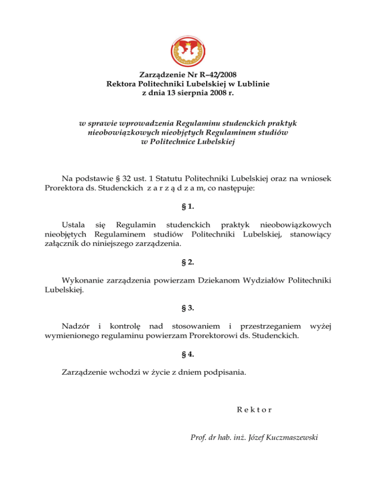 Zarządzenie Nr R–42/2008 Rektora Politechniki Lubelskiej w