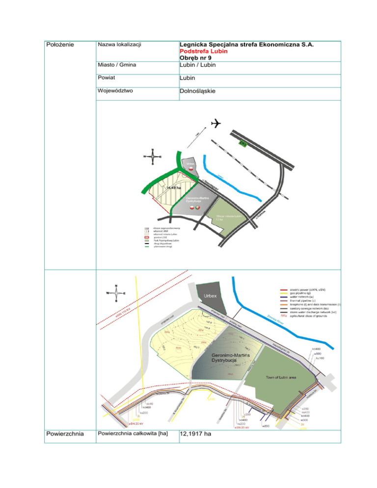 Położenie Powierzchnia Nazwa lokalizacji Miasto / Gmina Legnicka Specjalna strefa Ekonomiczna S.A. Podstrefa Lubin Obręb nr 9 Lubin / Lubin Powiat Lubin Województwo Dolnośląskie Powierzchnia całkowita [ha] 12,1917 ha nieruchomości Informacje dotyczące nieruchomości Powierzchnie poszczególnych działek ha 136/43 – 2,0986 136/13 – 1,9947 134/34 – 6,1748 136/15 – 0,7867 144/2 – 0,1682 146/468 – 0,9687 Możliwości powiększenia terenu (krótki opis) N Właściciel / właściciele Miasto Lubin – 134/34, 144/2, 146/468 ANR – 136/43, 136/13, 136/15 Uchwała nr LI/308/2001 Rady Miejskiej w Lubinie z dnia 20 marca 2001 r. (1) Uchwała nr V/38/2003 Rady Miejskiej w Lubinie z dnia 14 stycznia 2003 r. (2) Przeznaczenie w miejscowym 12PU – funkcja produkcyjno-usługowa (1) planie zagospodarowania PU – lokalizacja obiektów prowadzących działalność przestrzennego usługową, usługowo-produkcyjną, naprawczej, magazynowej, wytwórczej i przetwórczej (2) Aktualny plan zagospodarowania przestrzennego (T/N) Charakterystyka Klasa gruntów wraz z powierzchnią działki Różnica poziomów terenu [m] b.d Zanieczyszczenia wód powierzchniowych i gruntowych (T/N) N Odpady znajdujące się na terenie (T/N) N Badania geologiczne (T/N) T Poziom wód gruntowych m b.d Ryzyko wystąpienia zalań lub obsunięć terenu (T/N) N Przeszkody podziemne (T/N) N Przeszkody występujące na powierzchni terenu (T/N) N Ograniczenia budowlane Połączenia transportowe Istniejące ograniczenia ekologiczne (T/N) N Budynki i zabudowania na terenie (T/N) N Procent dopuszczalnej zabudowy 85% (1) N (2) Ograniczenia wysokości budynków m Max 3 kondygnacyjne budynki lub 13,5 m powyżej poziomu terenu (1) Max 18 m wysokość budynku (2) Strefa buforowa m 10 m od pasa drogi (1) 5, 6, 8 m od dróg (2) Inne, jeśli występują wskaźnik powierzchni biologicznej czynnej min. 15% (1) minimalna wielkość działki 1ha, renta planistyczna 30,% (2) Droga dojazdowa do terenu (rodzaj drogi i jej szerokość) Droga asfaltowa o szerokości 7 m Autostrada / droga krajowa km Autostrada A4 w odległości ok. 25 km Droga krajowa E65 – 800 m Kolej km 2 km Bocznica kolejowa km 2 km Najbliższe lotnisko międzynarodowe km Międzynarodowy Port Lotniczy we Wrocławiu w odległości ok. 80 km Najbliższe miasto wojewódzkie Wrocław km Istniejąca infrastruktura Energia elektryczna na terenie T/N Napięcie N 20/0.4 kV Odległość przyłącza od granicy działki 300 m Dostępna moc Do 2MW z wykorzystaniem istniejącej linii eSN. Powyżej 2 MW konieczność wybudowania GPZ Ustronie. N Gaz na terenie (T/N) Odległość przyłącza od granicy działki 100 m od gazociągu wysokiego ciśnienia, konieczność wybudowania SRP I stopnia Dostępna objętość 1500 m3/h Woda na terenie (T/N) T Odległość przyłącza od granicy terenu Bezpośrednio przy działce Dostępna objętość 150 m3/h Kanalizacja na terenie (T/N) T Odległość przyłącza od granicy terenu Bezpośrednio przy działce Dostępna objętość 150 m3/h Ograniczenie zrzutu ścieków T – brak możliwości przyjmowania ścieków przemysłowych Odprowadzenie wód deszczowych na terenie (T/N) T Oczyszczalnia ścieków na terenie bądź w bezpośrednim sąsiedztwie T – miejska oczyszczalnia ścieków w odległości ok. 3 km Telefony (T/N) N Odległość przyłącza od granicy terenu 300 m