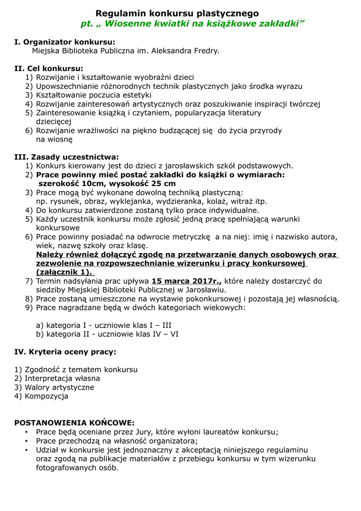 Regulamin konkursu plastycznego pt. „ Wiosenne kwiatki na książkowe zakładki” I. Organizator konkursu: Miejska Biblioteka Publiczna im. Aleksandra Fredry. II. Cel konkursu: 1) Rozwijanie i kształtowanie wyobraźni dzieci 2) Upowszechnianie różnorodnych technik plastycznych jako środka wyrazu 3) Kształtowanie poczucia estetyki 4) Rozwijanie zainteresowań artystycznych oraz poszukiwanie inspiracji twórczej 5) Zainteresowanie książką i czytaniem, popularyzacja literatury dziecięcej 6) Rozwijanie wrażliwości na piękno budzącącej się do życia przyrody na wiosnę III. Zasady uczestnictwa: 1) Konkurs kierowany jest do dzieci z jarosławskich szkół podstawowych. 2) Prace powinny mieć postać zakładki do książki o wymiarach: szerokość 10cm, wysokość 25 cm 3) Prace mogą być wykonane dowolną techniką plastyczną: np. rysunek, obraz, wyklejanka, wydzieranka, kolaż, witraż itp. 4) Do konkursu zatwierdzone zostaną tylko prace indywidualne. 5) Każdy uczestnik konkursu może zgłosić jedną pracę spełniającą warunki konkursowe 6) Prace powinny posiadać na odwrocie metryczkę a na niej: imię i nazwisko autora, wiek, nazwę szkoły oraz klasę. Należy również dołączyć zgodę na przetwarzanie danych osobowych oraz zezwolenie na rozpowszechnianie wizerunku i pracy konkursowej (załącznik 1). 7) Termin nadsyłania prac upływa 15 marca 2017r., które należy dostarczyć do siedziby Miejskiej Biblioteki Publicznej w Jarosławiu. 8) Prace zostaną umieszczone na wystawie pokonkursowej i pozostają jej własnością. 9) Prace nagradzane będą w dwóch kategoriach wiekowych: a) kategoria I - uczniowie klas I – III b) kategoria II - uczniowie klas IV – VI IV. Kryteria oceny pracy: 1) 2) 3) 4) Zgodność z tematem konkursu Interpretacja własna Walory artystyczne Kompozycja POSTANOWIENIA KOŃCOWE: • Prace będą oceniane przez Jury, które wyłoni laureatów konkursu; • Prace przechodzą na własność organizatora; • Udział w konkursie jest jednoznaczny z akceptacją niniejszego regulaminu oraz zgodą na publikacje materiałów z przebiegu konkursu w tym wizerunku fotografowanych osób.