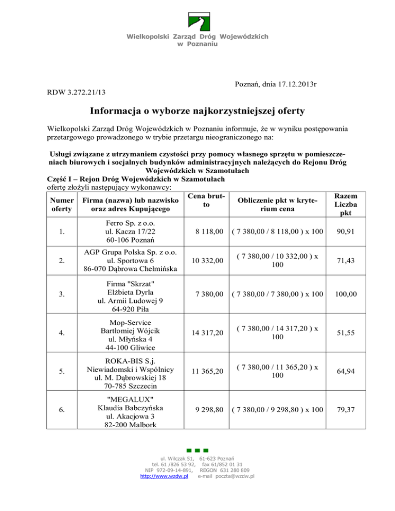 Wielkopolski Zarząd Dróg Wojewódzkich w Poznaniu Poznań, dnia 17.12.2013r RDW 3.272.21/13 Informacja o wyborze najkorzystniejszej oferty Wielkopolski Zarząd Dróg Wojewódzkich w Poznaniu informuje, że w wyniku postępowania przetargowego prowadzonego w trybie przetargu nieograniczonego na: Usługi związane z utrzymaniem czystości przy pomocy własnego sprzętu w pomieszczeniach biurowych i socjalnych budynków administracyjnych należących do Rejonu Dróg Wojewódzkich w Szamotułach Część I – Rejon Dróg Wojewódzkich w Szamotułach ofertę złożyli następujący wykonawcy: Cena brutRazem Numer Firma (nazwa) lub nazwisko Obliczenie pkt w kryteto Liczba oferty oraz adres Kupującego rium cena pkt Ferro Sp. z o.o. 1. ul. Kacza 17/22 8 118,00 ( 7 380,00 / 8 118,00 ) x 100 90,91 60-106 Poznań 2. AGP Grupa Polska Sp. z o.o. ul. Sportowa 6 86-070 Dąbrowa Chełmińska 10 332,00 ( 7 380,00 / 10 332,00 ) x 100 71,43 3. Firma "Skrzat" Elżbieta Dyrla ul. Armii Ludowej 9 64-920 Piła 7 380,00 ( 7 380,00 / 7 380,00 ) x 100 100,00 4. Mop-Service Bartłomiej Wójcik ul. Młyńska 4 44-100 Gliwice 14 317,20 ( 7 380,00 / 14 317,20 ) x 100 51,55 5. ROKA-BIS S.j. Niewiadomski i Wspólnicy ul. M. Dąbrowskiej 18 70-785 Szczecin 11 365,20 ( 7 380,00 / 11 365,20 ) x 100 64,94 6. "MEGALUX" Klaudia Babczyńska ul. Akacjowa 3 82-200 Malbork 9 298,80 ( 7 380,00 / 9 298,80 ) x 100 79,37 ▀ ▀ ▀ ul. Wilczak 51, 61-623 Poznań tel. 61 /826 53 92, fax 61/852 01 31 NIP 972-09-14-891, REGON 631 280 809 http://www.wzdw.pl e-mail [email protected] - 2 - 7. TP Serwis Mateusz Łachut ul. Nowina 21 62-023 Robakowo 9 830,16 ( 7 380,00 / 9 830,16 ) x 100 75,08 8. Przedsiębiorstwo Robót Drogowo-Mostowych S.A. ul. Powstańców Wlkp. 75 64-500 Szamotuły 8 088,48 ( 7 380,00 / 8 088,48 ) x 100 91,24 9. SGP Poszwa i Wspólnicy Sp. j Al. Powstańców Wlkp. 164 64-920 Piła 8 848,62 ( 7 380,00 / 8 848,62 ) x 100 83,40 10. PSC Greta Poszwa Al. Poznańska 64 64-920 Piła 10 324,62 ( 7 380,00 / 10 324,62 ) x 100 71,48 11. Zakład Usług GospodarczoSocjalnych Antem Sp. z o.o. Aleja Jana Pawła II 8a 58-506 Jelenia Góra 11 986,60 ( 7 380,00 / 11 986,60 ) x 100 61,57 12. VIPMAX Renata Wawrzynowicz ul. Lusowska 1, Sady 62-080 Tarnowo Podgórne 41 328,00 ( 7 380,00 / 41 328,00 ) x 100 17,86 W wyniku postępowania wybrano ofertę firmy: Firma "Skrzat" Elżbieta Dyrla ul. Armii Ludowej 9 64-920 Piła za cenę brutto 7.380,00 zł słownie: siedem tysięcy trzysta osiemdziesiąt złotych, 00/100 Uzasadnienie wyboru oferty: Najtańsza ważna oferta złożona w przedmiotowym postępowaniu ▀ ▀ ▀ ul. Wilczak 51, 61-623 Poznań tel./fax 61 / 826 53 92, tel. 820 52 09, fax 852 01 31 NIP 972-09-14-891, REGON 631 280 809 http://www.wzdw.pl e-mail: [email protected] - 3 - Część II – Obwód Drogowy w Międzychodzie ofertę złożyli następujący wykonawcy: Obliczenie pkt w kryterium Cena brutto cena Razem Liczba pkt Numer oferty Firma (nazwa) lub nazwisko oraz adres Kupującego 1. Ferro Sp. z o.o. ul. Kacza 17/22 60-106 Poznań 9 599,90 ( 6 560,82 / 9 599,90 ) x 100 68,34 2. AGP Grupa Polska Sp. z o.o. ul. Sportowa 6 86-070 Dąbrowa Chełmińska 8 856,00 ( 6 560,82 / 8 856,00 ) x 100 74,08 3. Firma "Skrzat" Elżbieta Dyrla ul. Armii Ludowej 9 64-920 Piła 6 642,00 ( 6 560,82 /6 642,00 ) x 100 98,78 4. Mop-Service Bartłomiej Wójcik ul. Młyńska 4 44-100 Gliwice 14 317,20 ( 6 560,82 / 14 317,20 ) x 100 45,82 5. ROKA-BIS S.j. Niewiadomski i Wspólnicy ul. M. Dąbrowskiej 18 70-785 Szczecin 11 070,00 ( 6 560,82 / 11 070,00 ) x 100 59,27 6. "MEGALUX" Klaudia Babczyńska ul. Akacjowa 3 82-200 Malbork 9 889,20 ( 6 560,82 / 9 889,20 ) x 100 66,34 9. SGP Poszwa i Wspólnicy Sp. j Al. Powstańców Wlkp. 164 64-920 Piła 8 848,62 ( 6 560,82 / 8 848,62 ) x 100 74,15 10. PSC Greta Poszwa Al. Poznańska 64 64-920 Piła 10 324,62 ( 6 560,82 / 10 324,62 ) x 100 63,55 11. Zakład Usług GospodarczoSocjalnych Antem Sp. z o.o. Aleja Jana Pawła II 8a 58-506 Jelenia Góra 6 560,82 ( 6 560,82 / 6 560,82 ) x 100 100,00 ▀ ▀ ▀ ul. Wilczak 51, 61-623 Poznań tel./fax 61 / 826 53 92, tel. 820 52 09, fax 852 01 31 NIP 972-09-14-891, REGON 631 280 809 http://www.wzdw.pl e-mail: [email protected] - 4 - 12. VIPMAX Renata Wawrzynowicz ul. Lusowska 1, Sady 62-080 Tarnowo Podgórne 38 376,00 ( 6 560,82 / 38 376,00 ) x 100 W wyniku postępowania wybrano ofertę firmy: Zakład Usług Gospodarczo-Socjalnych Antem Sp. z o.o. Aleja Jana Pawła II 8a 58-506 Jelenia Góra za cenę brutto 6.560,82 zł słownie: sześć tysięcy pięćset sześćdziesiąt złotych, 82/100 Uzasadnienie wyboru oferty: Najtańsza ważna oferta złożona w przedmiotowym postępowaniu ▀ ▀ ▀ ul. Wilczak 51, 61-623 Poznań tel./fax 61 / 826 53 92, tel. 820 52 09, fax 852 01 31 NIP 972-09-14-891, REGON 631 280 809 http://www.wzdw.pl e-mail: [email protected] 17,10