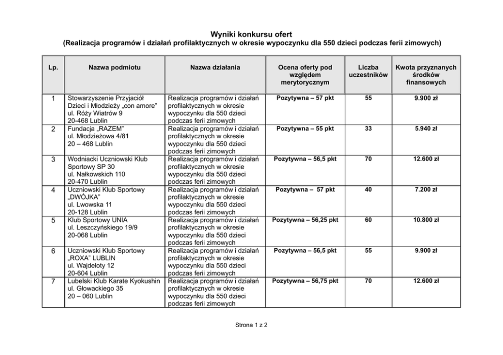 Wyniki konkursu ofert (Realizacja programów i działań profilaktycznych w okresie wypoczynku dla 550 dzieci podczas ferii zimowych) Lp. 1 2 3 4 5 6 7 Nazwa podmiotu Stowarzyszenie Przyjaciół Dzieci i Młodzieży „con amore” ul. Róży Wiatrów 9 20-468 Lublin Fundacja „RAZEM” ul. Młodzieżowa 4/81 20 – 468 Lublin Wodniacki Uczniowski Klub Sportowy SP 30 ul. Nałkowskich 110 20-470 Lublin Uczniowski Klub Sportowy „DWÓJKA” ul. Lwowska 11 20-128 Lublin Klub Sportowy UNIA ul. Leszczyńskiego 19/9 20-068 Lublin Uczniowski Klub Sportowy „ROXA” LUBLIN ul. Wajdeloty 12 20-604 Lublin Lubelski Klub Karate Kyokushin ul. Głowackiego 35 20 – 060 Lublin Nazwa działania Ocena oferty pod względem merytorycznym Liczba uczestników Kwota przyznanych środków finansowych Realizacja programów i działań profilaktycznych w okresie wypoczynku dla 550 dzieci podczas ferii zimowych Realizacja programów i działań profilaktycznych w okresie wypoczynku dla 550 dzieci podczas ferii zimowych Realizacja programów i działań profilaktycznych w okresie wypoczynku dla 550 dzieci podczas ferii zimowych Realizacja programów i działań profilaktycznych w okresie wypoczynku dla 550 dzieci podczas ferii zimowych Realizacja programów i działań profilaktycznych w okresie wypoczynku dla 550 dzieci podczas ferii zimowych Realizacja programów i działań profilaktycznych w okresie wypoczynku dla 550 dzieci podczas ferii zimowych Realizacja programów i działań profilaktycznych w okresie wypoczynku dla 550 dzieci podczas ferii zimowych Pozytywna – 57 pkt 55 9.900 zł Pozytywna – 55 pkt 33 5.940 zł Pozytywna – 56,5 pkt 70 12.600 zł Pozytywna – 57 pkt 40 7.200 zł Pozytywna – 56,25 pkt 60 10.800 zł Pozytywna – 56,5 pkt 55 9.900 zł Pozytywna – 56,75 pkt 70 12.600 zł Strona 1 z 2 8 Klub Uczelniany Akademickiego Związku Sportowego Uniwersytetu Marii Curie – Skłodowskiej ul. Langiewicza 22, 20 – 032 Lublin Fundacja ART OF SCIENCE ul. G. Narutowicza 52/6 20 – 016 Lublin Realizacja programów i działań profilaktycznych w okresie wypoczynku dla 550 dzieci podczas ferii zimowych 10 Lubelska Akademia Sportu CampiSportivi ul. Milenijna 12/58 20 – 884 Lublin Realizacja programów i działań profilaktycznych w okresie wypoczynku dla 550 dzieci podczas ferii zimowych Realizacja programów i działań profilaktycznych w okresie wypoczynku dla 550 dzieci podczas ferii zimowych 11 Lubelska Akademia Sportu CampiSportivi ul. Milenijna 12/58 20 – 884 Lublin Realizacja programów i działań profilaktycznych w okresie wypoczynku dla 550 dzieci podczas ferii zimowych 12 Uczniowski Klub Sportowy RUCH LUBLIN ul. Szmaragdowa 36/150 20 – 570 Lublin Realizacja programów i działań profilaktycznych w okresie wypoczynku dla 550 dzieci podczas ferii zimowych 9 Strona 2 z 2 38 6.840 zł Negatywna – nie podlegała ocenie merytorycznej nie dotyczy 0,00 zł Negatywna – 36 pkt Oferta w wyniku oceny merytorycznej nie uzyskała minimalnej ilości punktów tj. 40, obliczonych jako średnia arytmetyczna ocen poszczególnych członków komisji, a tym samym nie uzyskała rekomendacji do otrzymania środków finansowych. Negatywna – 36 pkt Oferta w wyniku oceny merytorycznej nie uzyskała minimalnej ilości punktów tj. 40, obliczonych jako średnia arytmetyczna ocen poszczególnych członków komisji, a tym samym nie uzyskała rekomendacji do otrzymania środków finansowych. nie dotyczy 0,00 zł nie dotyczy 0,00 zł Pozytywna – 55,25 pkt 65 11.700 zł Pozytywna – 53,25 pkt