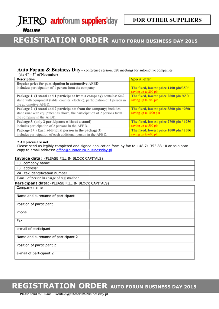 FOR OTHER SUPPLIERS REGISTRATION ORDER AUTO FORUM BUSINESS DAY 2015 Auto Forum & Business Day – conference session, b2b meetings for automotive companies (the 4th – 5th of November) Description Regular price for participation in automotive AFBD includes: participation of 1 person from the company Special offer The fixed, lowest price 1400 pln/350€ saving up to 200 pln Package 1. (1 stand and 1 participant from a company) contains: 6m2 stand with equipment (table, counter, electric), participation of 1 person in the automotive AFBD. Package 2. (1 stand and 2 participants from the company) includes: stand 6m2 with equipment as above, the participation of 2 persons from the company in the AFBD. Package 3. (only 2 participants without a stand) includes participation of 2 persons in the AFBD. Package 3+. (Each additional person in the package 3) includes participation of each additional person in the AFBD. The fixed, lowest price 2600 pln /650€ saving up to 700 pln The fixed, lowest price 3800 pln / 950€ saving up to 1000 pln The fixed, lowest price 2700 pln / 675€ saving up to 500 pln The fixed, lowest price 1000 pln / 250€ saving up to 600 pln * All prices are net Please send us legibly completed and signed application form by fax to +48 71 352 83 10 or as a scan copy to email address: [email protected] Invoice data: (PLEASE FILL IN BLOCK CAPITALS) Full company name: Full address: VAT tax identyfication number: E-mail of person in charge of registration: Participant data: (PLEASE FILL IN BLOCK CAPITALS) Company name Name and surename of participant Position of participant Phone Fax e-mail of participant Name and surename of participant 2 Position of participant 2 e-mail of participant 2 REGISTRATION ORDER Please send to: E-mail: [email protected] AUTO FORUM BUSINESS DAY 2015 FOR OTHER SUPPLIERS TECHNICAL INFORMATION Hiring an exhibition stand. The fee includes a stand (6m2) for exhibiting products and advertising materials. The standard equipment of the stand includes: a counter, chairs, table, basket, lights and 230V socket. Company name placed above the entrance to the stand (single font for all). Standard load capacity for each counter element max 40 kg. Reinforced of a table with a load capacity of max 150 kg is available for extra fee 170 pln (45 €). The display of the logo above the entrance additional cost 170 PLN net (45 €) I order the company logo for my exhibition stand (above the entrance) I am obliged to provide the logo 7 days before the event. 170 pln or 45€ I order additional reinforcement of the display table of 1m x 0.5 m 170 pln or 45€ Participation. The participation fee includes participation in the event, 4-5 November 2015, the evening banquet and all the attractions, lunches, coffee breaks, conference materials, simultaneous translation of the conference session. The fee does not include accommodation and travel costs. I accept the terms and rules of participation. Time and venue. Auto Forum Business Day will be held on 4-5 November 2015 in Haston City Hotel, Wrocław. Hotel. We have reserved a number of rooms in the Haston City Hotel. The participation fee does not include the cost of accommodation and other services provided by the hotel. Participants book rooms and make payment on their own. To benefit from a special discount please quote the password „AutoForum”, while booking a hotel room. http://www.haston.pl/kontakt Regulations. 1. I hereby confirm my order and I agree to the issue of an invoice without my signature. I also agree to receive correspondence on the Suppliers' Day / Business Day. I declare that payment will be settled within 7 days of the registration form submission, but no later than 3 working days before the event. 2. Cancellation of exhibition booth order will be charged 50% of hiring cost. Cancellation of participation in the event up to 25 of October 2015 the is 50% of costs. Absence during the event does not entitle to reimbursement for participation and for the stand. Trade talks are free of charge. They are gratuitous promotional items from the organizer. Please send us legibly completed and signed application form by fax to +48 71 352 83 10 or as a scan copy to email address: [email protected] _________________________________ Name and surname of authorised person Please send to: E-mail: [email protected] __________ date _______________ stamp and signature