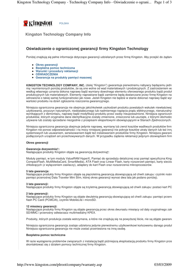 Kingston Technology Company - Technology Company Info - Oświadczenie o ograni... Page 1 of 3 POLSKA Kingston Technology Company Info Oświadczenie o ograniczonej gwarancji firmy Kingston Technology Poniżej znajdują się pełne informacje dotyczące gwarancji udzielanych przez firmę Kingston. Aby przejść do żądanej sekcji, wybie Okres gwarancji Bezpłatna pomoc techniczna Warunki i procedury reklamacji OŚWIADCZENIA Gwarancja na produkty pamięci masowej KINGSTON TECHNOLOGY COMPANY, INC. (dalej “Kingston”) gwarantuje pierwotnemu nabywcy będącemu jednocze nią i wymienionych poniżej produktów, że są one wolne od wad materiałowych i produkcyjnych. Z zastrzeżeniem warunków i ogra według własnego uznania dokona naprawy bądź wymiany dowolnego elementu oferowanego produktu bądź produktów, który zos produkcyjnych lub materiałowych. Elementy naprawiane bądź zamienne będą dostarczane przez firmę Kingston na zasadzie wym odnowione o takiej samej funkcjonalności jak nowe. Jeżeli Kingston nie będzie w stanie dokonać naprawy bądź wymiany danego wartości produktu na dzień zgłoszenia roszczenia gwarancyjnego. Niniejsza ograniczona gwarancja nie obejmuje jakichkolwiek uszkodzeń produktu powstałych wskutek niewłaściwej instalacji, wyp użytkowania, przyczyn naturalnych, niedostatecznego lub nadmiernego napięcia prądu elektrycznego, nienaturalnych warunków wynikających z demontażu, naprawy bądź modyfikacji produktu przez osoby nieupoważnione. Niniejsza ograniczona gwarancja n produktów, których oryginalne dane identyfikacyjne zostały zmienione, zniszczone lub usunięte, z którymi obchodzono si używane lub zostały sprzedane niezgodnie z przepisami eksportowymi obowiązującymi w Stanach Zjednoczonych. Niniejsza ograniczona gwarancja obejmuje jedynie naprawę, wymianę lub zwrot kosztów wadliwych produktów firmy Kingston, zg Kingston nie ponosi odpowiedzialności i na mocy niniejszej gwarancji nie pokryje kosztów utraty danych lub też innych kosztów zw systemowych lub usuwaniem, serwisowaniem bądź też instalowaniem produktów firmy Kingston. Niniejsza gwarancja nie obejmu podłączonych urządzeń ani przechowywanych danych. W przypadku żądania reklamacji jedynym obowiązkiem firmy Kingston jes Okres gwarancji Gwarancja dozywotnia†: Następujące produkty Kingston objęte są gwarancją dożywotnią†: Moduły pamięci, w tym moduły ValueRAM HyperX, Pamięć do sprzedaży detalicznej oraz pamięć specyficzna Kingston, karty pam CompactFlash, MultiMediaCard, SmartMedia), ATA Flash oraz Linear Flash, karty rozszerzeń pamięci, karty sieciowe, routery, ko chłodzących (z wyłączeniem zasilaczy), adaptery do kart Flash oraz rozszerzenia mikroprocesorów. 5 lata gwarancja: Następujące produkty firmy Kingston objęte są pięcioletnią gwarancją obowiązującą od chwili zakupu: czytniki nośników, pami pamięci przenośnej Data Traveler Mini Slim, której okres gwarancji wynosi dwa lata jak podano poniżej). 3 lata gwarancji: Następujące produkty firmy Kingston objęte są trzyletnią gwarancją obowiązującą od chwili zakupu: postaci kart PC DataPak. 2 lata gwarancji: Następujące produkty firmy Kingston są objęte dwuletnią gwarancją obowiązującą od chwili zakupu: pamięci przeno flash PC Card (PCMCIA), czytniki MobileLite i microSD. 12 miesiecy gwarancji: Następujące produkty firmy Kingston są objęte gwarancją przez okres dwunastu miesięcy od daty oryginalnego zakupu: Zestaw a SD/MMC i przenośny odtwarzacz multimedialny KPEX. Produkty, których produkcja została wstrzymana, a które nie znajdują się na powyższej liście, nie są objęte gwarancj Niniejsza ograniczona gwarancja zostaje udzielona jedynie pierwotnemu użytkownikowi końcowemu danego produktu na czas po Niniejsza ograniczona gwarancja nie może zostać przeniesiona na inną osobę. Bezpłatna pomoc techniczna W razie wystąpienia problemów związanych z instalacją bądź późniejszą eksploatacją produktu firmy Kingston przed wykonaniem skontaktować się z działem pomocy technicznej firmy Kingston. http://www.kingston.com/plroot/company/warranty.asp 03/03/2009 Kingston Technology Company - Technology Company Info - Oświadczenie o ograni... Page 2 of 3 Pomoc techniczną przez Internet można uzyskać pod adresem Kingston.com/support. Firma Kingston zapewnia klientom na całym świecie bezpłatną pomoc techniczną w języku angielskim. Kontakt bezpośredni z działem pomocy technicznej firmy Kingston w Stanach Zjednoczonych I Kanada pod numerem +1 (714) 43 435-0640. Z działem pomocy technicznej firmy Kingston Technology można się kontaktować pod numerem telefonu +44 (0) 1932 738888 lu poszczególnych krajów, umieszczonymi na stronie www.kingston.com/ukroot/company/contact.asp#national. Pomoc techniczna w w Europie pod numerem telefonu +44 (0)1932 755 210. Kontakt bezpośredni z działem pomocy technicznej firmy Kingston w Azji pod numerem: Dla dzwoniących z Australii: 1800-353-916, bezpłatny (w godzinach otwarcia); 1800-620-569, bezpłatny (24/7) Dla dzwoniących z Chin: 800-810-1972, bezpłatny Dla dzwoniących z Hongkongu: 800-900478, bezpłatny Dla dzwoniących z Indii: 1800-425-4515, bezpłatny (od poniedziałku do soboty, 9.30–18.00) Dla dzwoniących z Japonii: 00531-88-0018, bezpłatny Dla dzwoniących z Malezji: 1800-812078, bezpłatny Dla dzwoniących z Singapuru: 800-8861042, bezpłatny Dla dzwoniących z Tajwanu: 0800-666-200, bezpłatny Dla dzwoniących z Tajlandii: 001800-861-0018, bezpłatny Dla dzwoniących z innych krajów azjatyckich: +886-3-500-1715, płatny Procedury i wymagania obowiązujące w procesie reklamacji Aby skorzystać z serwisu gwarancyjnego, wadliwy produkt można przesłać do autoryzowanego przedstawiciela handlowego b zakupiono dany produkt. Przed przesłaniem produktu należy zapoznać się z zasadami dotyczącymi zwrotów produktów obowi handlowego lub dystrybutora. Zazwyczaj należy podać 