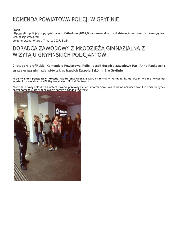 KOMENDA POWIATOWA POLICJI W GRYFINIE Źródło: http://gryfino.policja.gov.pl/zgr/aktualnosci/aktualnosci/8807,Doradca-zawodowy-z-mlodzieza-gimnazjalna-z-wizyta-u-gryfins kich-policjantow.html Wygenerowano: Wtorek, 7 marca 2017, 11:14 DORADCA ZAWODOWY Z MŁODZIEŻĄ GIMNAZJALNĄ Z WIZYTĄ U GRYFIŃSKICH POLICJANTÓW. 2 lutego w gryfińskiej Komendzie Powiatowej Policji gościł doradca zawodowy Pani Anna Pankowska wraz z grupą gimnazjalistów z klas trzecich Zespołu Szkół nr 1 w Gryfinie. Aspekty pracy policjantów, kryteria naboru oraz wszelkie warunki formalne kandydatów do służby w policji wyjaśniał asystent ds. nieletnich z KPP Gryfino st.sierż. Michał Zaniewski. Młodzież wykazywała duże zainteresowanie przekazywanymi informacjami, wrażenie na uczniach zrobił również budynek nowej Komendy, który mieli okazję bardzo dokładnie zwiedzić. Ocena: 0/5 (0) Tweetnij