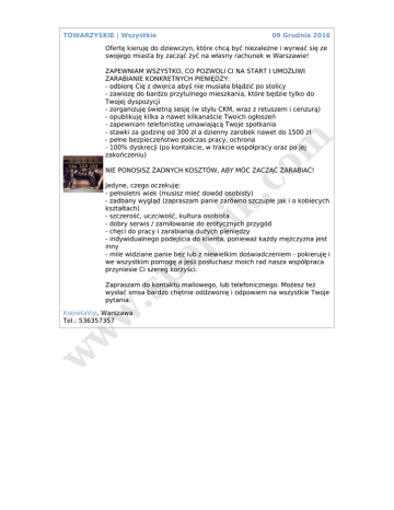 TOWARZYSKIE | Wszystkie 09 Grudnia 2016 Ofertę kieruję do dziewczyn, które chcą być niezależne i wyrwać się ze swojego miasta by zacząć żyć na własny rachunek w Warszawie! .c o m ZAPEWNIAM WSZYSTKO, CO POZWOLI CI NA START I UMOŻLIWI ZARABIANIE KONKRETNYCH PIENIĘDZY: - odbiorę Cię z dworca abyś nie musiała błądzić po stolicy - zawiozę do bardzo przytulnego mieszkania, które będzie tylko do Twojej dyspozycji - zorganizuję świetną sesję (w stylu CKM, wraz z retuszem i cenzurą) - opublikuję kilka a nawet kilkanaście Twoich ogłoszeń - zapewniam telefonistkę umawiającą Twoje spotkania - stawki za godzinę od 300 zł a dzienny zarobek nawet do 1500 zł - pełne bezpieczeństwo podczas pracy, ochrona - 100% dyskrecji (po kontakcie, w trakcie współpracy oraz po jej zakończeniu) NIE PONOSISZ ŻADNYCH KOSZTÓW, ABY MÓC ZACZĄĆ ZARABIAĆ! po jn ik Jedyne, czego oczekuję: - pełnoletni wiek (musisz mieć dowód osobisty) - zadbany wygląd (zapraszam panie zarówno szczupłe jak i o kobiecych kształtach) - szczerość, uczciwość, kultura osobista - dobry serwis / zamiłowanie do erotycznych przygód - chęci do pracy i zarabiania dużych pieniędzy - indywidualnego podejścia do klienta, ponieważ każdy mężczyzna jest inny - mile widziane panie bez lub z niewielkim doświadczeniem - pokieruję i we wszystkim pomogę a jeśli posłuchasz moich rad nasza współpraca przyniesie Ci szereg korzyści. .s Zapraszam do kontaktu mailowego, lub telefonicznego. Możesz też wysłać smsa bardzo chętnie oddzwonię i odpowiem na wszystkie Twoje pytania. w w w KobietaVip, Warszawa Tel.: 536357357