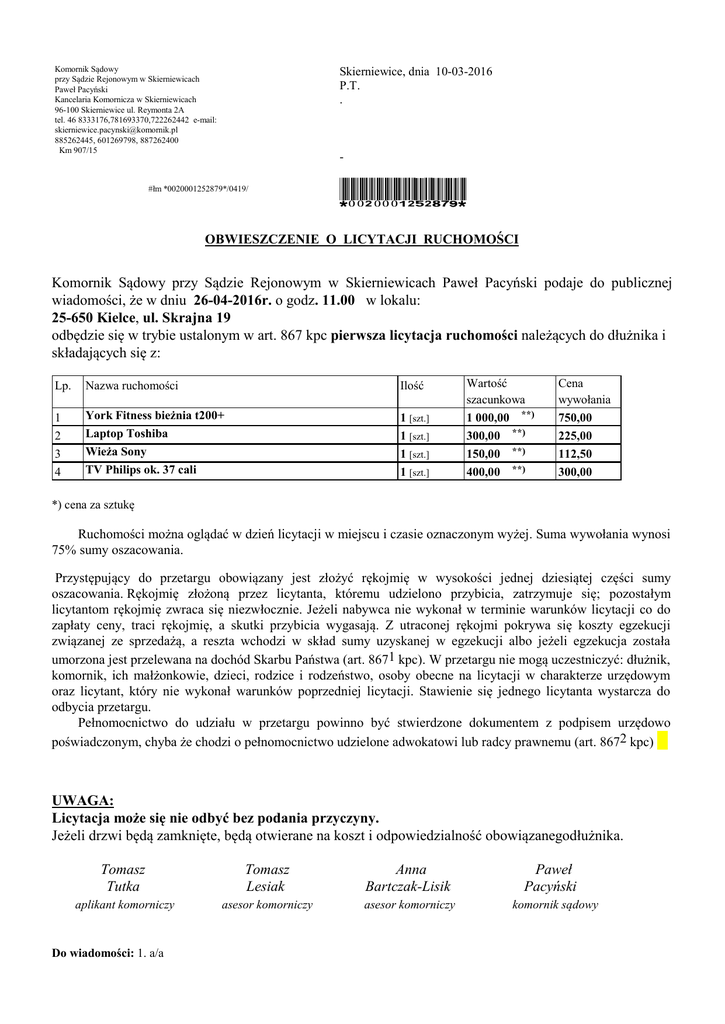 Komornik Sądowy przy Sądzie Rejonowym w Skierniewicach Paweł Pacyński Kancelaria Komornicza w Skierniewicach 96-100 Skierniewice ul. Reymonta 2A tel. 46 8333176,781693370,722262442 e-mail: [email protected] 885262445, 601269798, 887262400 Km 907/15 Skierniewice, dnia 10-03-2016 P.T. . - #łm *0020001252879*/0419/ *0020001252879* OBWIESZCZENIE O LICYTACJI RUCHOMOŚCI Komornik Sądowy przy Sądzie Rejonowym w Skierniewicach Paweł Pacyński podaje do publicznej wiadomości, że w dniu 26-04-2016r. o godz. 11.00 w lokalu: 25-650 Kielce, ul. Skrajna 19 odbędzie się w trybie ustalonym w art. 867 kpc pierwsza licytacja ruchomości należących do dłużnika i składających się z: Lp. Nazwa ruchomości Ilość 1 2 3 4 York Fitness bieżnia t200+ Laptop Toshiba Wieża Sony TV Philips ok. 37 cali 1 [szt.] 1 [szt.] 1 [szt.] 1 [szt.] Wartość szacunkowa 1 000,00 **) 300,00 **) 150,00 **) 400,00 **) Cena wywołania 750,00 225,00 112,50 300,00 *) cena za sztukę Ruchomości można oglądać w dzień licytacji w miejscu i czasie oznaczonym wyżej. Suma wywołania wynosi 75% sumy oszacowania. Przystępujący do przetargu obowiązany jest złożyć rękojmię w wysokości jednej dziesiątej części sumy oszacowania. Rękojmię złożoną przez licytanta, któremu udzielono przybicia, zatrzymuje się; pozostałym licytantom rękojmię zwraca się niezwłocznie. Jeżeli nabywca nie wykonał w terminie warunków licytacji co do zapłaty ceny, traci rękojmię, a skutki przybicia wygasają. Z utraconej rękojmi pokrywa się koszty egzekucji związanej ze sprzedażą, a reszta wchodzi w skład sumy uzyskanej w egzekucji albo jeżeli egzekucja została umorzona jest przelewana na dochód Skarbu Państwa (art. 8671 kpc). W przetargu nie mogą uczestniczyć: dłużnik, komornik, ich małżonkowie, dzieci, rodzice i rodzeństwo, osoby obecne na licytacji w charakterze urzędowym oraz licytant, który nie wykonał warunków poprzedniej licytacji. Stawienie się jednego licytanta wystarcza do odbycia przetargu. Pełnomocnictwo do udziału w przetargu powinno być stwierdzone dokumentem z podpisem urzędowo poświadczonym, chyba że chodzi o pełnomocnictwo udzielone adwokatowi lub radcy prawnemu (art. 8672 kpc) UWAGA: Licytacja może się nie odbyć bez podania przyczyny. Jeżeli drzwi będą zamknięte, będą otwierane na koszt i odpowiedzialność obowiązanegodłużnika. Tomasz Tutka Tomasz Lesiak Anna Bartczak-Lisik aplikant komorniczy asesor komorniczy asesor komorniczy Do wiadomości: 1. a/a Paweł Pacyński komornik sądowy