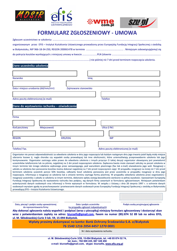 FORMULARZ ZGŁOSZENIOWY - UMOWA Zgłaszam uczestnictwo w szkoleniu: ……………………………………………………………………………………………………………………………………………………..…… organizowanym przez EFIS – Instytut Kształcenia Ustawicznego prowadzony przez Europejską Fundację Integracji Społecznej z siedzibą w Białymstoku, NIP 966-18-34-250, REGON 200061478 w terminie ……………………………….…………..……… . Niniejszym zobowiązuję(emy) się do pokrycia kosztów wynikających z niniejszej umowy w kwocie ......................PLN (słownie …………………………………………………………..……….. ..................................................................................................................) nie później niż 7 dni przed terminem rozpoczęcia szkolenia. Dane uczestnika szkolenia Nazwisko Imię Data i miejsce urodzenia (dd/mm/rrrr) Zajmowane stanowisko Adres poczty elektronicznej (e-mail) Telefon Dane do wystawienia rachunku – oświadczenie Firma Kod pocztowy Miejscowość REGON Ulica (i Nr) KRS/EDG Telefon/ Fax. NIP Adres poczty elektronicznej (e-mail) Organizator nie ponosi odpowiedzialności za odwołanie szkolenia w dniu jego rozpoczęcia lub każdym następnym dniu jego trwania jeżeli będą miały miejsce zdarzenia losowe tj. nagła choroba czy wypadek osoby prowadzącej lub inne okoliczności, które uniemożliwiają przeprowadzenie szkolenia lub jego kontynuowanie. Organizator zastrzega sobie prawo do odwołania szkolenia z innych przyczyn O takiej decyzji organizator obowiązany jest powiadomić uczestników telefonicznie lub na piśmie, najpóźniej na 2 dni przed rozpoczęciem szkolenia. Zapłacona kwota może stanowić zaliczkę na poczet szkolenia w innym terminie lub innego szkolenia wybranego przez zamawiającego, pod warunkiem pisemnego (fax lub e-mail) oświadczenia jego woli. Rezygnacji z udziału w szkoleniu bez ponoszenia kosztów można dokonać najpóźniej na 7 dni przed rozpoczęciem zajęć. W przypadku rezygnacji na mniej niż 7 dni przed terminem szkolenia uczestnik ponosi 50% kosztów, całkowity koszt szkolenia ponoszony jest przez uczestnika w przypadku rezygnacji w dniu jego rozpoczęcia. Informacja o rezygnacji ze szkolenia lub o zmianie terminu wymaga formy pisemnej. W przypadku odwołania szkolenia przez organizatora i rezygnacji uczestnika z udziału w szkoleniu w innym terminie, dokonane opłaty zostają bezzwłocznie zwrócone w pełnej wysokości. Upoważniam Europejską Fundację Integracji Społecznej do wystawienia rachunku bez podpisu, wg danych firmy zawartych w formularzu zgłoszeniowym. Niniejszym potwierdzam autentyczność danych osobowych oraz informacji o firmie wpisanych w formularzu. W związku z Ustawą z dnia 28 sierpnia 1997 r. o ochronie danych osobowych wyrażam zgodę na przechowywanie i przetwarzanie danych osobowych przez Europejską Fundację Integracji Społecznej z siedzibą w Białymstoku prowadzącą EFIS – Instytut Kształcenia Ustawicznego. ............................................................................ Data, pieczęć i podpis osoby upoważnionej do reprezentowania firmy ............................................................................. Data i podpis uczestnika (w przypadku zgłoszeń indywidualnych) .................................................................... Podpis osoby przyjmującej zgłoszenie Aby dokonać zgłoszenia należy wypełnić i podpisać (wraz z pieczątką) niniejszy formularz zgłoszeniowy i dostarczyć skan wraz z potwierdzeniem zapłaty na adres: [email protected], faxem na numer (85) 874 52 89 lub na adres EFIS, ul. M. Skłodowskiej-Curie 3 lok. 59, 15-094 Białystok. Wpłaty prosimy dokonywać na konto: Bank Ochrony Środowiska S.A. o/Białystok 76 1540 1216 2054 4457 1270 0001 Nr i data wystawienia rachunku ul. M. Skłodowskiej-Curie 3/59, 15-094 Białystok, tel. +48 85 874 52 74, tel. kom.: 782 009 225, 667 328 450 e-mail: [email protected], skype: biuroefis, www.efis.org.pl