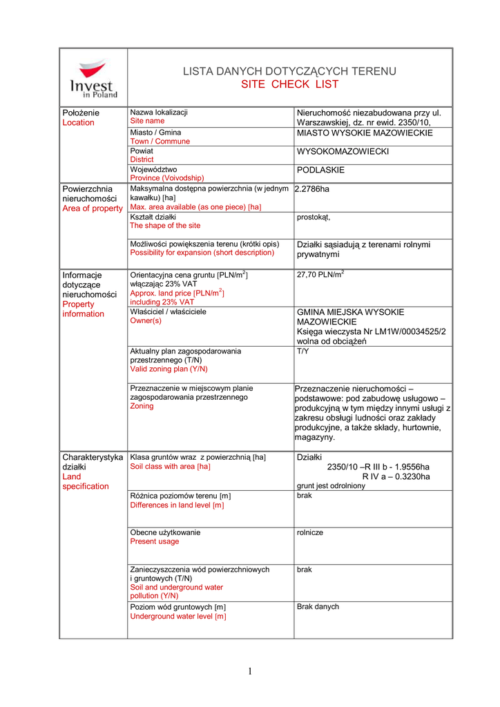 LISTA DANYCH DOTYCZĄCYCH TERENU SITE CHECK LIST Położenie Location Nazwa lokalizacji Site name Nieruchomość niezabudowana przy ul. Warszawskiej, dz. nr ewid. 2350/10, MIASTO WYSOKIE MAZOWIECKIE Miasto / Gmina Town / Commune Powiat WYSOKOMAZOWIECKI District Województwo PODLASKIE Province (Voivodship) Maksymalna dostępna powierzchnia (w jednym 2.2786ha Powierzchnia kawałku) [ha] nieruchomości Area of property Max. area available (as one piece) [ha] Kształt działki prostokąt, The shape of the site Informacje dotyczące nieruchomości Property information Możliwości powiększenia terenu (krótki opis) Possibility for expansion (short description) Działki sąsiadują z terenami rolnymi prywatnymi Orientacyjna cena gruntu [PLN/m2] włączając 23% VAT Approx. land price [PLN/m 2] including 23% VAT Właściciel / właściciele Owner(s) 27,70 PLN/m2 Aktualny plan zagospodarowania przestrzennego (T/N) Valid zoning plan (Y/N) T/Y Przeznaczenie w miejscowym planie zagospodarowania przestrzennego Zoning GMINA MIEJSKA WYSOKIE MAZOWIECKIE Księga wieczysta Nr LM1W/00034525/2 wolna od obciążeń Przeznaczenie nieruchomości – podstawowe: pod zabudowę usługowo – produkcyjną w tym między innymi usługi z zakresu obsługi ludności oraz zakłady produkcyjne, a także składy, hurtownie, magazyny. Charakterystyka Klasa gruntów wraz z powierzchnią [ha] Soil class with area [ha] działki Land specification Działki Obecne użytkowanie Present usage rolnicze Zanieczyszczenia wód powierzchniowych i gruntowych (T/N) Soil and underground water pollution (Y/N) Poziom wód gruntowych [m] Underground water level [m] brak Różnica poziomów terenu [m] Differences in land level [m] 1 2350/10 –R III b - 1.9556ha R IV a – 0.3230ha grunt jest odrolniony brak Brak danych Połączenia transportowe Transport links Czy były prowadzone badania geologiczne terenu (T/N) Were geological research done (Y/N) N/N Ryzyko wystąpienia zalań lub obsunięć terenu (T/N) Risk of flooding or land slide (Y/N) brak Przeszkody podziemne (T/N) Underground obstacles (Y/N) brak Przeszkody występujące na powierzchni terenu (T/N) Ground and overhead obstacles (Y/N) brak Istniejące ograniczenia ekologiczne (T/N) Ecological restrictions (Y/N) brak Budynki i zabudowania na terenie (T/N) Buildings / other constructions on site (Y/N) brak Droga dojazdowa do terenu (rodzaj drogi i jej szerokość) Access road to the plot (type and width of access road) Teren przylega do drogi wojewódzkiej nr 678: Zambrów-Wysokie MazowieckieBiałystok. Posiada drogę dojazdową wewnętrzną asfaltową służącą obsłudze terenów inwestycyjnych, równoległa do drogi wojew. o szer. pasa jezdni 7 m (szer. pasa drogowego 15 m) Droga krajowa Zambrów – Białowieża nr 689 w odległości 1 km od zachodniej granicy działki Autostrada / droga krajowa [km] Nearest motorway / national road [km] Porty rzeczne i morskie w odległości do 200 km brak Sea and river ports located up to 200 km Kolej [km] Railway line [km] Linia kolejowa PKP Warszawa – Białystok - 9 km stacja pasażerska i towarowa w Szepietowie w kierunku południowym W odległości 9 km w Szepietowie Bocznica kolejowa [km] Railway siding [km] Istniejąca infrastruktura Existing infrastructure Najbliższe lotnisko międzynarodowe [km] Nearest international airport [km] Port lotniczy w Warszawie ok.140 km Najbliższe miasto wojewódzkie [km] Nearest province capital [km] Białystok – 56 km Elektryczność na terenie (T/N) Electricity (Y/N) T/Y § Odległość przyłącza od granicy terenu Connection point (distance from boundary) [m] 2 Stacja transformatorowa na początku drogi wewnętrznej służącej obsłudze terenów inwestycyjnych, przy skrzyżowaniu ul. Warszawskiej i drogi na Zawrocie Nowiny -300 m § Napięcie Voltage [kV] 15kW/04kW § Dostępna moc Available capacity [MW] Na warunkach zakładu energetycznego Gaz na terenie (T/N) Gas (Y/N) N/N Odległość przyłącza od granicy działki Connection point (distance from boundary) [m] Wartość kaloryczna Calorific value [MJ/Nm3] 1000m § Średnica rury Pipe diameter [mm] Ø110mm PE § Dostępna objętość Available capacity [Nm 3/h] § § Woda na terenie (T/N) Water supply (Y/N) § § T/Y bez podziału na cele socjalne czy przemysłowe Odległość przyłącza od granicy terenu Connection point (distance from boundary) [m] Dostępna objętość Available capacity [m 3/24h] Kanalizacja na terenie (T/N) Sewage discharge (Y/N) § § Osoba przygotowująca ofertę Offer prepared by Osoby do kontaktu Contact person bezpośrednio przy terenie w drodze wewnętrznej Na warunkach zakładu gazowniczego T/Y Odległość przyłącza od granicy terenu Connection point (distance from boundary) [m] Dostępna objętość Available capacity [m3/24h] przyłącze bezpośrednio przy terenie w drodze wewnętrznej Brak danych Oczyszczalnia ścieków na terenie bądź w bezpośrednim sąsiedztwie Treatment plant (Y/N) oczyszczalnia wspólna ze Spółdzielnią Mleczarską w odl. 2 km w kierunku zachodnim Telefony (T/N) Telephone (Y/N) N/N § Uwagi Comments Brak danych Odległość przyłącza od granicy terenu Connection point (distance from boundary) [m] 1000m Działki znajdują się w granicach miasta. Od strony południowej przylega do drogi wojewódzkiej :Zambrów - Wysokie Mazowieckie - Białystok nr 678 . Posiada asfaltową drogę dojazdową wewnętrzną służącą do obsługi terenów o szer. jezdni 7m. Od strony północnej i wschodniej graniczy z terenami użytkowanymi rolniczo Barbara Szeląg, podinspektor, tel.086-2752451, e-mail : [email protected] Jarosław Siekierko – Burmistrz Miasta, tel.086-2752592, tel. komórkowy 502646130, e-mail: [email protected] 3