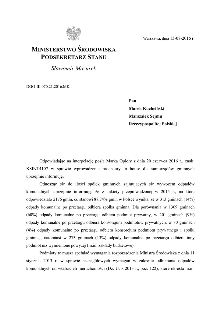 Warszawa, dnia 13-07-2016 r. MINISTERSTWO ŚRODOWISKA PODSEKRETARZ STANU Sławomir Mazurek DGO-III.070.21.2016.MK Pan Marek Kuchciński Marszałek Sejmu Rzeczypospolitej Polskiej Odpowiadając na interpelację posła Marka Opioły z dnia 20 czerwca 2016 r., znak: K8INT4107 w sprawie wprowadzenia procedury in house dla samorządów gminnych uprzejmie informuję. Odnosząc się do ilości spółek gminnych zajmujących się wywozem odpadów komunalnych uprzejmie informuję, że z ankiety przeprowadzonej w 2015 r., na którą odpowiedziało 2176 gmin, co stanowi 87,74% gmin w Polsce wynika, że w 313 gminach (14%) odpady komunalne po przetargu odbiera spółka gminna. Dla porównania w 1309 gminach (60%) odpady komunalne po przetargu odbiera podmiot prywatny, w 201 gminach (9%) odpady komunalne po przetargu odbiera konsorcjum podmiotów prywatnych, w 80 gminach (4%) odpady komunalne po przetargu odbiera konsorcjum podmiotu prywatnego i spółki gminnej, natomiast w 273 gminach (13%) odpady komunalne po przetargu odbiera inny podmiot niż wymienione powyżej (m.in. zakłady budżetowe). Podmioty te muszą spełniać wymagania rozporządzenia Ministra Środowiska z dnia 11 stycznia 2013 r. w sprawie szczegółowych wymagań w zakresie odbierania odpadów komunalnych od właścicieli nieruchomości (Dz. U. z 2013 r., poz. 122), które określa m.in. wymagane wyposażenie umożliwiające odbieranie odpadów komunalnych od właścicieli nieruchomości. Zgodnie z ustawą z dnia 13 września 1996 r. o utrzymaniu czystości i porządku w gminach (Dz. U. z 2016 r., poz. 250) podmiot odbierający odpady komunalne (bez względu czy jest to spółka gminna czy podmiot prywatny) ma obowiązek przekazywania selektywnie zebranych odpadów komunalnych bezpośrednio lub za pośrednictwem innego zbierającego odpady do instalacji odzysku odpadów, zgodnie z hierarchią sposobów postępowania z odpadami, o której mowa w art. 17 ustawy z dnia 14 grudnia 2012 r. o odpadach, natomiast zmieszanych odpadów komunalnych oraz odpadów zielonych bezpośrednio do regionalnej instalacji do przetwarzania odpadów komunalnych. Ponadto, dopuszcza się przekazywanie zmieszanych odpadów komunalnych do ponadregionalnej instalacji do przetwarzania odpadów komunalnych, o której mowa w art. 35 ust. 6a ustawy z dnia 14 grudnia 2012 r. o odpadach. W zakresie pytania dotyczącego powstania systemu nadzoru i kontroli nad działaniami spółki gminnej uprzejmie informuję, że ustawa o utrzymaniu czystości i porządku w gminach zawiera również przepisy dotyczące kontroli i sankcji za nieprzestrzeganie wymagań określonych tą ustawą w stosunku do wszystkich podmiotów, w tym również w stosunku do gminnych jednostek organizacyjnych. O ile w stosunku do przedsiębiorców sprawowanie kontroli i przestrzegania stosowania przepisów ustawy z dnia 13 września 1996 r. o utrzymaniu czystości i porządku w gminach należy do kompetencji wójta, burmistrza lub prezydenta miasta, to w stosunku do gmin i gminnych jednostek organizacyjnych kontrola przestrzegania przepisów tej ustawy należy do kompetencji Inspekcji Ochrony Środowiska (uprawnienia te mieszczą się w ramach ogólnych kompetencji, o których mowa w art. 2 ust. 1a ustawy z dnia 20 lipca 1991 r. o Inspekcji Ochrony Środowiska - Dz. U. z 2013 r. poz. 686, z późn. zm.). Zgodnie z art. 9k ustawy o utrzymaniu czystości i porządku w gminach wojewódzki inspektor ochrony środowiska posiada uprawnienia do zakazu wykonywania przez gminną jednostkę organizacyjną działalności w zakresie odbierania odpadów komunalnych w przypadku m.in. nie spełniania wymagań określonych dla podmiotu odbierającego odpady komunalne, nie osiągania poziomów recyklingu, przygotowania do ponownego użycia i odzysku innymi metodami oraz ograniczenia masy odpadów komunalnych ulegających biodegradacji przekazywanych do składowania. Natomiast art. 9y ww. ustawy określa kary pieniężne, którym podlega gminna jednostka organizacyjna w przypadku odbierania odpadów komunalnych pomimo zakazu wykonywania działalności, mieszania selektywnie zebranych odpadów, w tym ze zmieszanymi odpadami komunalnymi, nie osiągania poziomów recyklingu oraz przekazywania nierzetelnych lub po terminie sprawozdań, o których mowa w art. 9n ustawy. Oznacza to, że spółka gminna wykonująca zadania z zakresu gospodarki odpadami komunalnymi na terenie gminy jest objęta systemem kontroli i nadzoru. Odnosząc się do kwestii certyfikatu ISO 14001 i certyfikatu ISO 9001 uprzejmie informuję, że Ministerstwo Środowiska nie jest w posiadaniu danych dotyczących liczby spółek gminnych, które takie certyfikaty posiadają. Ponadto informuję, że są to systemy dobrowolne i spółka gminna nie ma obowiązku posiadać takich certyfikatów. Z poważaniem Sławomir Mazurek Podsekretarz Stanu Ministerstwo Środowiska / – podpisany cyfrowo/ Do wiadomości: Departament Spraw Parlamentarnych oraz Obsługi Rad, Zespołów i Pełnomocników w KPRM
