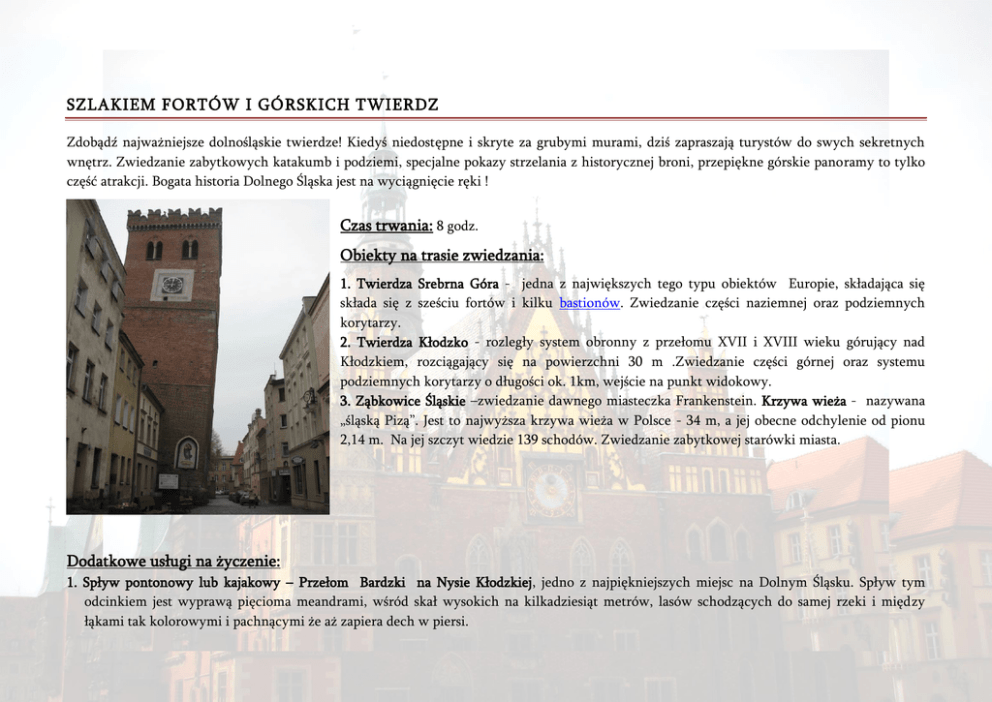SZLAKIEM FORTÓW I GÓRSKICH TWIERDZ Zdobądź najważniejsze dolnośląskie twierdze! Kiedyś niedostępne i skryte za grubymi murami, dziś zapraszają turystów do swych sekretnych wnętrz. Zwiedzanie zabytkowych katakumb i podziemi, specjalne pokazy strzelania z historycznej broni, przepiękne górskie panoramy to tylko część atrakcji. Bogata historia Dolnego Śląska jest na wyciągnięcie ręki ! Czas trwania: 8 godz. Obiekty na trasie zwiedzania: 1. Twierdza Srebrna Góra - jedna z największych tego typu obiektów Europie, składająca się składa się z sześciu fortów i kilku bastionów. Zwiedzanie części naziemnej oraz podziemnych korytarzy. 2. Twierdza Kłodzko - rozległy system obronny z przełomu XVII i XVIII wieku górujący nad Kłodzkiem, rozciągający się na powierzchni 30 m .Zwiedzanie części górnej oraz systemu podziemnych korytarzy o długości ok. 1km, wejście na punkt widokowy. 3. Ząbkowice Śląskie –zwiedzanie dawnego miasteczka Frankenstein. Krzywa wieża - nazywana „śląską Pizą”. Jest to najwyższa krzywa wieża w Polsce - 34 m, a jej obecne odchylenie od pionu 2,14 m. Na jej szczyt wiedzie 139 schodów. Zwiedzanie zabytkowej starówki miasta. Dodatkowe usługi na życzenie: 1. Spływ pontonowy lub kajakowy – Przełom Bardzki na Nysie Kłodzkiej, jedno z najpiękniejszych miejsc na Dolnym Śląsku. Spływ tym odcinkiem jest wyprawą pięcioma meandrami, wśród skał wysokich na kilkadziesiąt metrów, lasów schodzących do samej rzeki i między łąkami tak kolorowymi i pachnącymi że aż zapiera dech w piersi.