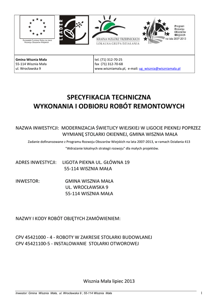 Gmina Wisznia Mała 55-114 Wisznia Mała ul. Wrocławska 9 tel. (71) 312-70-25 fax (71) 312-70-68 www.wiszniamala.pl, e-mail: [email protected] SPECYFIKACJA TECHNICZNA WYKONANIA I ODBIORU ROBÓT REMONTOWYCH NAZWA INWESTYCJI: MODERNIZACJA ŚWIETLICY WIEJSKIEJ W LIGOCIE PIEKNEJ POPRZEZ WYMIANĘ STOLARKI OKIENNEJ, GMINA WISZNIA MAŁA Zadanie dofinansowane z Programu Rozwoju Obszarów Wiejskich na lata 2007-2013, w ramach Działania 413 "Wdrażanie lokalnych strategii rozwoju" dla małych projektów. ADRES INWESTYCJI: INWESTOR: LIGOTA PIEKNA UL. GŁÓWNA 19 55-114 WISZNIA MAŁA GMINA WISZNIA MAŁA UL. WROCŁAWSKA 9 55-114 WISZNIA MAŁA NAZWY I KODY ROBÓT OBJĘTYCH ZAMÓWIENIEM: CPV 45421000 - 4 - ROBOTY W ZAKRESIE STOLARKI BUDOWLANEJ CPV 45421100-5 - INSTALOWANIE STOLARKI OTWOROWEJ Wisznia Mała lipiec 2013 Inwestor: Gmina Wisznia Mała, ul. Wrocławska 9 ; 55-114 Wisznia Mała 1 SPIS TREŚCI 1. WSTEP ...................................................................................................................................................... 3 1.1 Przedmiot ST ......................................................................................................................................... 3 1.2 Zakres stosowania ST ................................................................................ …………………………………………. 3 1.3 Zakres robót objętych ST ........................................................................... ………………………………………… 3 1.4 Określenia podstawowe ............................................................................. ………………………………………… 3 1.5 Ogólne wymagania dotyczące robót ........................................................... ……………………………………….. 3 2. MATERIALY .................................................................................................................................................4 3. SPRZET ........................................................................................................ ...............................................6 4. TRANSPORT ............................................................................................................................................... 7 5. WYKONANIE ROBÓT ..................................................................................................... …………………………. 7 6. KONTROLA JAKOSCI ROBÓT ...................................................................................... ……………………………..11 7. OBMIAR ROBÓT ............................................................................................................ …………………………..12 8. ODBIÓR ROBÓT ......................................................................................................... …………………………… 12 9. PODSTAWA PLATNOSCI ...............................................................................................................................13 10. PRZEPISY ZWIAZANE .............................................................................................. ……………………………… 13 Najważniejsze oznaczenia i skróty: ST – Specyfikacja Techniczna SST – Szczegółowa Specyfikacja Techniczna ITB – Instytut Techniki Budowlanej PZJ – Program Zabezpieczenia Jakości Inwestor: Gmina Wisznia Mała, ul. Wrocławska 9 ; 55-114 Wisznia Mała 2 1. WSTĘP 1.1 Przedmiot SST Przedmiotem niniejszej szczegółowej specyfikacji technicznej (SST) są wymagania dotyczące wykonania i odbioru robót polegających na wymianie stolarki otworowej okiennej - w ramach robót wykonywanych na obiektach objętych przedmiotem zamierzenia inwestycyjnego pn: „Modernizacja świetlicy wiejskiej w Ligocie Pięknej poprzez wymianę stolarki okiennej, gmina Wisznia Mała”. Wykonanie wymiany istniejących okien jest konieczne z uwagi na duże straty ciepła co podnosi koszty eksploatacji. Specyfikacja techniczna jest stosowana jako dokument przetargowy przy zleceniu i realizacji robót objętych zamówieniem. Jej przedmiotem są wymagania dotyczące wykonania i odbioru robót. 1.2 Zakres stosowania SST Specyfikacja niniejsza jest stosowana jako dokument przy zlecaniu i wykonaniu robót określonych powyżej. Odstępstwa od wymagań podanych w niniejszej specyfikacji mogą mieć miejsce tylko w przypadkach małych prostych robót i konstrukcji drugorzędnych o niewielkim znaczeniu, dla których istnieje pewność, ze podstawowe wymagania będą spełnione przy zastosowaniu metod wykonania na podstawie doświadczenia i przy przestrzeganiu zasad sztuki budowlanej. 1.3 Zakres robót objętych SST Roboty, których dotyczy specyfikacja, obejmują wszystkie czynności umożliwiające i mające na celu wykonanie wymiany stolarki otworowej okiennej. Ustalenia zawarte w niniejszej Specyfikacji dotyczą zasad prowadzenia robót polegających na zabudowie otworów w ścianach zewnętrznych z gotowych wyrobów stolarskich. Zakres prac dotyczy wymiany stolarki okiennej w budynku świetlicy w Ligocie Pięknej przy ul. Głównej 19. 1.3.1 Szczegółowy zakres prac budowlanych obejmuje: 1. Ręczne wykucie z muru ościeżnic okiennych; 2. Ręczne wykucie z muru parapetów okiennych; 3. Wywóz okien i pozostałych odpadów budowlanych i przekazanie ich do utylizacji po dokonaniu recyklingu; 4. Wykonanie nowych okien o parametrach określonych w niniejszym załączniku do SIWZ ; 5. Okucia obwiedniowe, umożliwiające mikrowentylację oraz otwieranie rozwierno –uchylne; 6. Osadzenie nowych parapetów; 7. Uzupełnienie tynków pod parapetami; 8. Obrobienie ościeży po demontażu starych okien; 9. Uzupełnienie tynków na ościeżach i przylegających ścianach, wraz z wykonaniem gładzi gipsowej z gipsu szpachlowego dwuwarstwowo; 10. Malowanie farbą emulsyjną tynków wewnętrznych i zewnętrznych oście