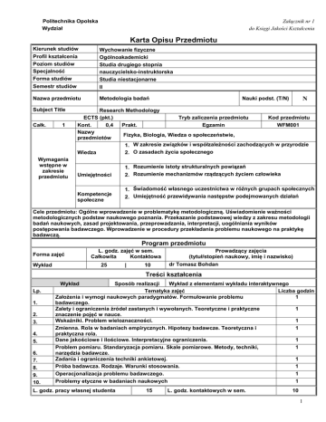 Politechnika Opolska Wydział Załącznik nr 1 do Księgi Jakości Kształcenia Karta Opisu Przedmiotu Kierunek studiów Profil kształcenia Poziom studiów Specjalność Forma studiów Wychowanie fizyczne Ogólnoakademicki Studia drugiego stopnia nauczycielsko-instruktorska Studia niestacjonarne Semestr studiów II Nazwa przedmiotu Metodologia badań Subject Title Całk. 1 Wymagania wstępne w zakresie przedmiotu Nauki podst. (T/N) N Research Methodology ECTS (pkt.) Tryb zaliczenia przedmiotu Kod przedmiotu Kont. 0,4 Prakt. Egzamin WFM001 Nazwy Fizyka, Biologia, Wiedza o społeczeństwie, przedmiotów 1. W zakresie związków i współzależności zachodzących w przyrodzie Wiedza 2. O zasadach życia społecznego Umiejętności Kompetencje społeczne 1. Rozumienie istoty strukturalnych powiązań 2. Rozumienie mechanizmów rządzących życiem człowieka 1. Świadomość własnego uczestnictwa w różnych grupach społecznych 2. Umiejętność przewidywania następstw podejmowanych działań Cele przedmiotu: Ogólne wprowadzenie w problematykę metodologiczną. Uświadomienie ważności metodologicznych podstaw naukowego poznania. Przekazanie podstawowej wiedzy z zakresu metodologii badań naukowych, zasad projektowania, przeprowadzania, interpretacji, uogólniania wyników postępowania badawczego. Wprowadzenie w procedury przekładania problemu naukowego na praktykę badawczą. Program przedmiotu Forma zajęć Wykład L. godz. zajęć w sem. Całkowita Kontaktowa 25 | 10 Prowadzący zajęcia (tytuł/stopień naukowy, imię i nazwisko) dr Tomasz Bohdan Treści kształcenia Wykład Lp. 1. 2. 3. 4. 5. 6. 7. 8. 9. 10. Sposób realizacji Wykład z elementami wykładu interaktywnego Tematyka zajęć Liczba godzin Założenia i wymogi naukowych paradygmatów. Formułowanie problemu 1 badawczego. Zalety i ograniczenia źródeł zastanych i wywołanych. Teoretyczne i praktyczne 1 znaczenie pojęć w nauce. Wskaźniki. Problem wieloznaczności. 1 Zmienna. Rola w badaniach empirycznych. Hipotezy badawcze. Teoretyczna i 1 praktyczna rola. Dane jakościowe i ilościowe. Interpretacyjne ograniczenia. 1 Problem pomiaru. Standaryzacja pomiaru. Skale pomiarowe. Metody, techniki, 1 narzędzia badawcze. Zadania i ograniczenia techniki ankietowej. 1 Próba badawcza. Rodzaje. Warunki stosowania. 1 Operacjonalizacja problemu badawczego. 1 Problemy etyczne w badaniach naukowych 1 L. godz. pracy własnej studenta 15 L. godz. kontaktowych w sem. 10 1 Sposoby sprawdzenia zamierzonych efektów kształcenia Egzamin w formie testu Wiedza Efekty kształcenia dla przedmiotu - po zakończonym cyklu kształcenia Umiejętności Kompetencje społeczne K_W09 Zna metodologię badawczą stosowaną w naukach o kulturze fizycznej i posiada wiedzę dotyczącą badań 1. eksperymentalnych z wykorzystaniem nowoczesnych technologii. Zna schemat i zasady procesu badawczego. K_W20 Tłumaczy pojęcia dotyczące ochrony własności 2. intelektualnych i rozumie zasady zarządzania ich zasobami. K_U18 Wykazuje umiejętność samodzielnego uczenia się i doskonalenia własnego warsztatu pracy z wykorzystaniem 1. nowoczesnych środków, materiałów i metod pozyskiwania, organizowania i przetwarzania informacji K_K08 Posiada umiejętność słuchania i empatycznego rozumienia. Wykazuje zdolności wrażliwego obserwatora i 1. posiada zdolności sprawnego i twórczego rozwiązania sytuacji problemowych Metody dydaktyczne: Wykład interaktywny Forma i warunki zaliczenia przedmiotu: Egzamin w formie testu (uzyskanie co najmniej 50% punktów) Literatura podstawowa: [1] Babbie E. ,(2003), Badania społęczne w praktyce, Warszawa. [2] Frankfort-Nachmias Ch., Nachmias D., (2001) Metody badawcze w naukach społecznych, Poznań. [3] Juszczyk S., (2001), Metodologia badań w naukach społecznych, Katowice. [4] Nowak S., (1985), Metodologia badań społecznych, W-wa. [5] Pieter J., (1967), Ogólna metodologia pracy naukowej, Wrocław. [6] Sztumski J.,(1984), Wstęp do metod i technik badań społecznych, W-wa. Literatura uzupełniająca: [1] Apanowicz J., (2003),. Metodologia nauk. Toruń. ______________ * niewłaściwe przekreślić ………………………………………………….. ………………………………………………………. (kierownik jednostki organizacyjnej/bezpośredni przełożony: pieczęć/podpis (Dziekan Wydziału pieczęć/podpis) 2