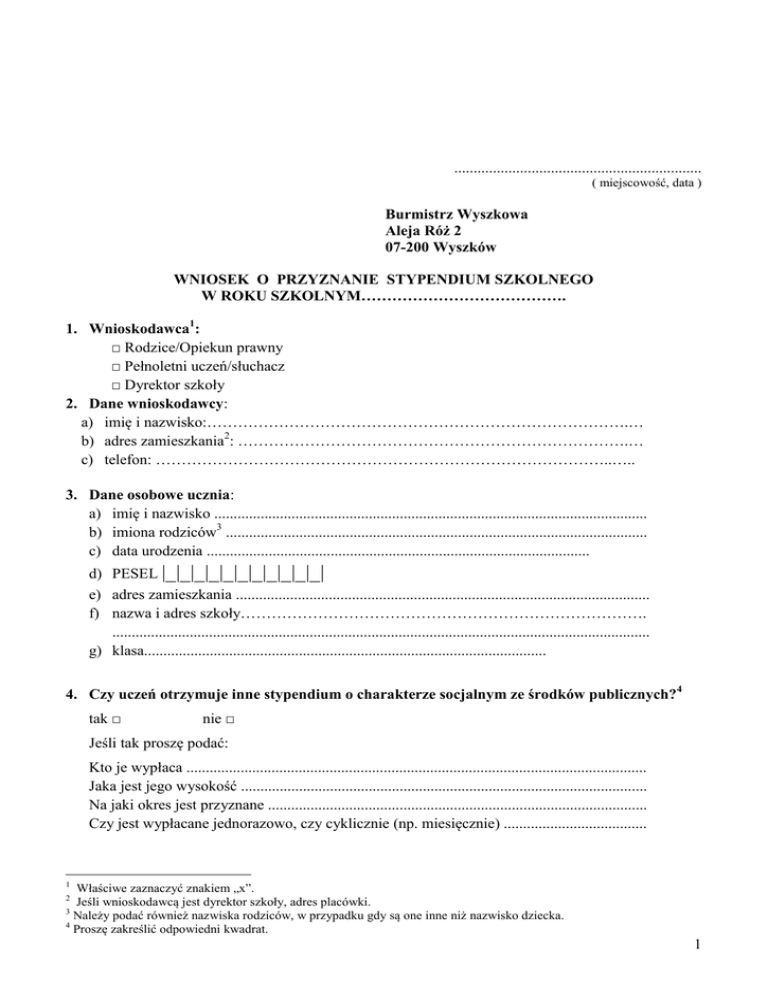 ................................................................ ( miejscowość, data ) Burmistrz Wyszkowa Aleja Róż 2 07-200 Wyszków WNIOSEK O PRZYZNANIE STYPENDIUM SZKOLNEGO W ROKU SZKOLNYM…………………………………. 1. Wnioskodawca1: □ Rodzice/Opiekun prawny □ Pełnoletni uczeń/słuchacz □ Dyrektor szkoły 2. Dane wnioskodawcy: a) imię i nazwisko:……………………………………………………………………….… b) adres zamieszkania2: ………………………………………………………………….… c) telefon: ……………………………………………………………………………..….. 3. Dane osobowe ucznia: a) imię i nazwisko ................................................................................................................ b) imiona rodziców3 ............................................................................................................. c) data urodzenia ................................................................................................... d) PESEL |_|_|_|_|_|_|_|_|_|_|_| e) adres zamieszkania ........................................................................................................... f) nazwa i adres szkoły……………………………………………………………………. ........................................................................................................................................... g) klasa........................................................................................................ 4. Czy uczeń otrzymuje inne stypendium o charakterze socjalnym ze środków publicznych?4 tak □ nie □ Jeśli tak proszę podać: Kto je wypłaca ....................................................................................................................... Jaka jest jego wysokość ......................................................................................................... Na jaki okres jest przyznane .................................................................................................. Czy jest wypłacane jednorazowo, czy cyklicznie (np. miesięcznie) ..................................... 1 Właściwe zaznaczyć znakiem „x”. Jeśli wnioskodawcą jest dyrektor szkoły, adres placówki. 3 Należy podać również nazwiska rodziców, w przypadku gdy są one inne niż nazwisko dziecka. 4 Proszę zakreślić odpowiedni kwadrat. 2 1 5. Pożądana forma świadczenia pomocy materialnej5: 1) całkowite lub częściowe pokrycie kosztów udziału w zajęciach edukacyjnych (np. pokrycie kosztu wyjazdu na wycieczkę szkolną o charakterze edukacyjnym, zieloną szkołę, zakup biletu do kina, teatru lub muzeum), w tym wyrównawczych, wykraczających poza zajęcia organizowane w szkole w ramach planu nauczania, a także zajęciach edukacyjnych organizowanych poza szkołą; (podać rodzaj zajęć) .............................................................. oraz ich organizatora (nazwa i adres): ………………………….……………………………. 2) pomoc rzeczowa o charakterze edukacyjnym, w tym w szczególności: a) zakup podręczników, wydawnictw o charakterze encyklopedycznym, słowników, atlasów, lektur szkolnych, tablic matematycznych, fizycznych i chemicznych, tornistra, plecaka lub torby szkolnej, artykułów szkolnych (np. piórniki, zeszyty, okładki na książki i zeszyty, bloki, flamastry, kredki, pędzle, farby, klej, papier kolorowy, bibuła, brystol, kalkulatory, ołówki, długopisy, pióra, nożyczki, taśma klejąca, korektory, przybory geometryczne, plastelina, modelina, itp.); b) zakup komputerowych programów edukacyjnych; c) zakup stroju gimnastycznego, w którego skład wchodzą: bluza sportowa, dres, spodnie sportowe, spodenki sportowe, koszulka, strój kąpielowy, kąpielówki, klapki, okulary pływackie, obuwie typu sportowego, itp.; d) zakup mundurka szkolnego, stroju galowego wymaganego przez szkołę; e) zakup komputera (PC, laptopa, notebooka), oprogramowania systemowego, urządzeń peryferyjnych (np. monitor, drukarka, klawiatura, myszka, urządzenie wielofunkcyjne), nośniki danych (pendrive, płyty CD,DVD, zewnętrzne karty pamięci do komputera), papier do drukarki, tusze/tonery do drukarki; f) zakup ubrania ochronnego na praktyki ( wymagane potwierdzenie przez szkołę); g) zakup przyborów do nauki zawodu lub odbycia praktyk- niezbędnych w procesie edukacji (wymagane potwierdzenie przez szkołę); h) całkowite lub częściowe pokrycie innych kosztów związanych z pobieraniem nauki w szkole (np. ubezpieczenia ucznia, składki na radę rodziców); 3) pokrycie kosztów związanych z pobieraniem nauki - przez uczniów szkół ponadgimnazjalnych oraz słuchaczy kolegiów, o których mowa w § 2 pkt 3 lit. b poza miejscem zamieszkania, a w szczególności: a) pokrycie kosztów zakwaterowania (internat, bursa, kwatera prywatna), b) pokrycie kosztów dojazdu do szkoły środkami komunikacji zbiorowej. 5 Proszę podkreślić wybrane pozycje. 2 6. Czy w rodzinie występuje: - bezrobocie tak □ nie □ - niepełnosprawność tak □ nie □ - ciężka lub długotrwała choroba tak □ nie □ - wielodzietność tak □ nie □ - brak umiejętności wypełniania funkcji opiekuńczo-wychowawczych tak □ nie □ - alkoholizm tak □ nie □ - narkomania tak □ nie □ - rodzina jest niepełna tak □ nie □ - wystąpiło zdarzenie losowe tak □ nie □ 7. Uzasadnienie przyznania świadczenia pomocy materialnej6 .................................................................................................................................................................... .................................................................................................................................................................... ...............................................................................................................