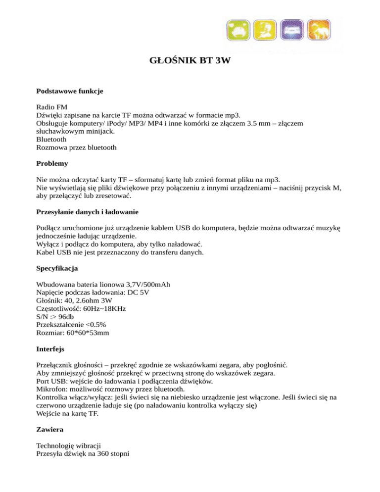 GŁOŚNIK BT 3W Podstawowe funkcje Radio FM Dźwięki zapisane na karcie TF można odtwarzać w formacie mp3. Obsługuje komputery/ iPody/ MP3/ MP4 i inne komórki ze złączem 3.5 mm – złączem słuchawkowym minijack. Bluetooth Rozmowa przez bluetooth Problemy Nie można odczytać karty TF – sformatuj kartę lub zmień format pliku na mp3. Nie wyświetlają się pliki dźwiękowe przy połączeniu z innymi urządzeniami – naciśnij przycisk M, aby przełączyć lub zresetować. Przesyłanie danych i ładowanie Podłącz uruchomione już urządzenie kablem USB do komputera, będzie można odtwarzać muzykę jednocześnie ładując urządzenie. Wyłącz i podłącz do komputera, aby tylko naładować. Kabel USB nie jest przeznaczony do transferu danych. Specyfikacja Wbudowana bateria lionowa 3,7V/500mAh Napięcie podczas ładowania: DC 5V Głośnik: 40, 2.6ohm 3W Częstotliwość: 60Hz~18KHz S/N :> 96db Przekształcenie <0.5% Rozmiar: 60*60*53mm Interfejs Przełącznik głośności – przekręć zgodnie ze wskazówkami zegara, aby pogłośnić. Aby zmniejszyć głośność przekręć w przeciwną stronę do wskazówek zegara. Port USB: wejście do ładowania i podłączenia dźwięków. Mikrofon: możliwość rozmowy przez bluetooth. Kontrolka włącz/wyłącz: jeśli świeci się na niebiesko urządzenie jest włączone. Jeśli świeci się na czerwono urządzenie ładuje się (po naładowaniu kontrolka wyłączy się) Wejście na kartę TF. Zawiera Technologię wibracji Przesyła dźwięk na 360 stopni Uwaga Trzymać w miejscu niedostępnym dla dzieci. Nie uderzaj w urządzenie. Trzymaj z dala od: ognia, wody, wysokich i niskich temperatur. Nie blokuj siatki głośnika. Nie otwieraj głośników samodzielnie. Podłącz za pomocą USB, aby znaleźć stację. Bluetooth/TF/FM/ Głośnik INSTRUKCJA Naciśnij Naciśnij Naciśnij Naciśnij Naciśnij Naciśnij , aby przejść do następnej piosenki. i przytrzymaj, aby pogłośnić. , aby wrócić do poprzedniej piosenki. i przytrzymaj, aby ściszyć. , aby włączyć pauzę lub rozpocząć odtwarzanie. , aby przełączyć między Bluetooth/TF/FM/Rozmową przez Bluetooth Urządzenia elektryczne i elektroniczne zawierają materiały, komponenty i substancje, które mogą być niebezpieczne dla zdrowia i środowiska, jeśli ze zużytymi materiałami (wyrzucanymi urządzenia elektrycznymi i elektronicznymi) nie postępuje się właściwie. Urządzenia elektryczne i elektroniczne są zaznaczone przekreślonym symbolem pojemnika na śmieci, patrz poniżej. Ten symbol oznacza, że urządzenia elektryczne i elektroniczne nie powinny być wyrzucane razem z innymi odpadami domowymi, lecz powinny być wyrzucane oddzielnie. We wszystkich miastach powstały punkty zbiórki, gdzie można oddać bezpłatnie urządzenia elektryczne i elektroniczne do stanowisk recyklingu bądź innych miejsc zbiorki, albo urządzenia i baterie mogą być odebrane z domu. Dodatkowe informacje znajdują się w wydziale technicznym urzędu miasta.