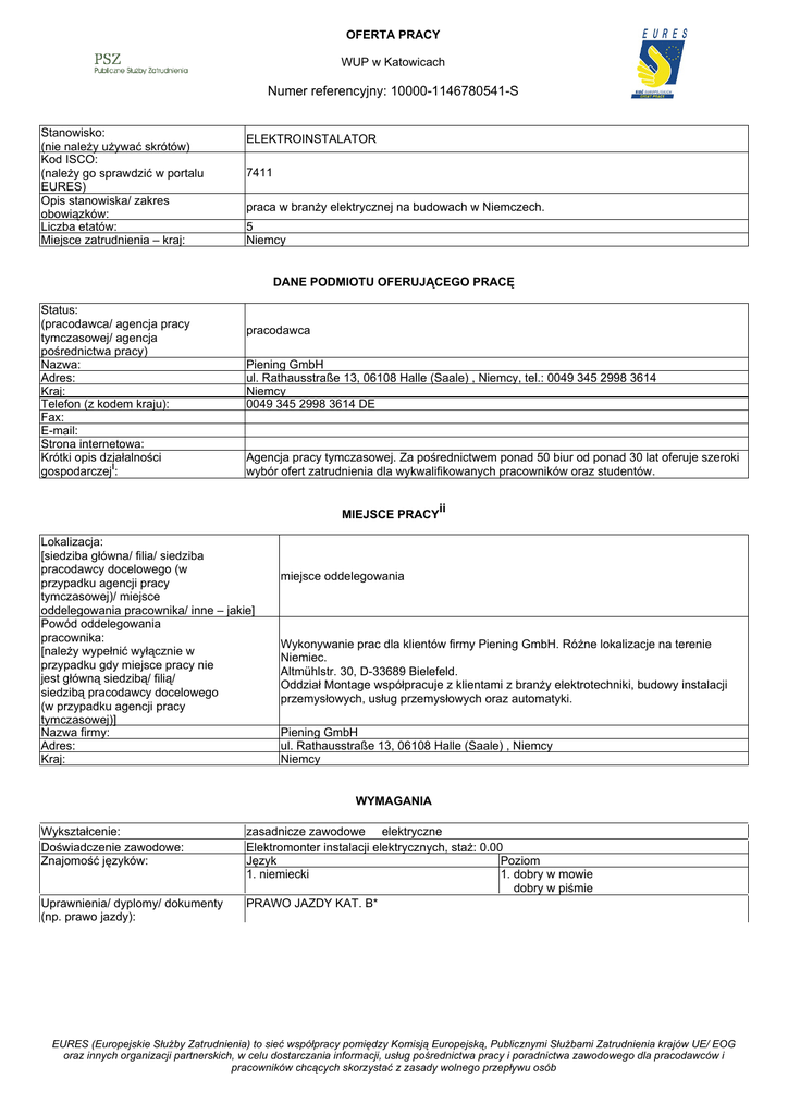 OFERTA PRACY WUP w Katowicach Numer referencyjny: 10000-1146780541-S Stanowisko: (nie należy używać skrótów) Kod ISCO: (należy go sprawdzić w portalu EURES) Opis stanowiska/ zakres obowiązków: Liczba etatów: Miejsce zatrudnienia – kraj: ELEKTROINSTALATOR 7411 praca w branży elektrycznej na budowach w Niemczech. 5 Niemcy DANE PODMIOTU OFERUJĄCEGO PRACĘ Status: (pracodawca/ agencja pracy tymczasowej/ agencja pośrednictwa pracy) Nazwa: Adres: Kraj: Telefon (z kodem kraju): Fax: E-mail: Strona internetowa: Krótki opis działalności gospodarczeji: pracodawca Piening GmbH ul. Rathausstraße 13, 06108 Halle (Saale) , Niemcy, tel.: 0049 345 2998 3614 Niemcy 0049 345 2998 3614 DE Agencja pracy tymczasowej. Za pośrednictwem ponad 50 biur od ponad 30 lat oferuje szeroki wybór ofert zatrudnienia dla wykwalifikowanych pracowników oraz studentów. MIEJSCE PRACYii Lokalizacja: [siedziba główna/ filia/ siedziba pracodawcy docelowego (w przypadku agencji pracy tymczasowej)/ miejsce oddelegowania pracownika/ inne – jakie] Powód oddelegowania pracownika: [należy wypełnić wyłącznie w przypadku gdy miejsce pracy nie jest główną siedzibą/ filią/ siedzibą pracodawcy docelowego (w przypadku agencji pracy tymczasowej)] Nazwa firmy: Adres: Kraj: miejsce oddelegowania Wykonywanie prac dla klientów firmy Piening GmbH. Różne lokalizacje na terenie Niemiec. Altmühlstr. 30, D-33689 Bielefeld. Oddział Montage współpracuje z klientami z branży elektrotechniki, budowy instalacji przemysłowych, usług przemysłowych oraz automatyki. Piening GmbH ul. Rathausstraße 13, 06108 Halle (Saale) , Niemcy Niemcy WYMAGANIA Wykształcenie: Doświadczenie zawodowe: Znajomość języków: Uprawnienia/ dyplomy/ dokumenty (np. prawo jazdy): zasadnicze zawodowe elektryczne Elektromonter instalacji elektrycznych, staż: 0.00 Język Poziom 1. niemiecki 1. dobry w mowie dobry w piśmie PRAWO JAZDY KAT. B* EURES (Europejskie Służby Zatrudnienia) to sieć współpracy pomiędzy Komisją Europejską, Publicznymi Służbami Zatrudnienia krajów UE/ EOG oraz innych organizacji partnerskich, w celu dostarczania informacji, usług pośrednictwa pracy i poradnictwa zawodowego dla pracodawców i pracowników chcących skorzystać z zasady wolnego przepływu osób Inne istotne wymagania: Wymagane wykształcenie kierunkowe w zawodzie montera urządzeń elektrycznych/ elektryka. Mile widziane doświadczenie zawodowe. Pracodawca dopuszcza kandydatów bez doświadczenia zawodowego. Pożądana znajomość języka niemieckiego, ale nie jest to warunek konieczny. Pracodawca ma możliwość zaoferowania wybranym kandydatom kursu języka niemieckiego w Polsce. Wymagane aktualne uprawnienia SEP do 1 kV lub wyższe. Prawo jazdy kat. B – mile widziane. Mile widziany własny samochód w celu dojazdu do miejsca wykonywania pracy. Dokumenty potwierdzające kwalifikacje. Gotowość do podróży służbowych na terenie Niemiec. Elastyczność, motywacja, rzetelność. WYNAGRODZENIE I WARUNKI ZATRUDNIENIA Wysokość pensji brutto: Wysokość pensji netto: Waluta, w jakiej wypłacana jest pensja: Rodzaj stawki wynagrodzenia: (godzinowa/ tygodniowa/ miesięczna/ roczna/ inna) Premie: Dodatkowe świadczenia (zakwaterowanie, wyżywienie, koszty związane ze zmianą miejsca zamieszkania, koszty podróży itp.): 11,51 Euro Czasowy ze stawką godzinową Wynagrodzenie zgodne z taryfikatorami iGZ / DGB (Izba branżowa zrzeszająca agencje pracy tymczasowej w Niemczech / Niemieckie Zrzeszenie Związków Zawodowych) stosownie do posiadanych kwalifikacji oraz nieopodatkowana dieta za dzień roboczy. Możliwe dodatki za pracę w nadgodzinach, w nocy, w niedziele i święta. Możliwa praca na zmiany. Piening GmbH Nazwa firmy, z którą zostanie podpisana umowa: Rodzaj umowy: (umowa o pracę, umowa zlecenia, wolontariat, praktyka zawodowa/ staż, umowa o pracę praca zdalna, agencja pracy tymczasowej, inne): Wymiar czasu pracy pełny etat (praca na pełen etat/ część etatu): Czas trwania umowy: nieokreślony (nieokreślony/ określony) Liczba godzin tygodniowo: Zmiany i praca w dni wolne: Data rozpoczęcia: Inne informacje: Data wygaśnięcia umowy (w przypadku umowy na czas określony): 40,00 Możliwa praca na zmiany. 2017-02-01 Pracodawca oferuje pomoc w: - znalezieniu zakwaterowania, załatwieniu formalności związanych z pobytem i podjęciem pracy. - organizacji przelotów lub wynajmu samochodu podczas wyjazdów służbowych. - zabezpiecza bezpłatnie ubranie robocze, narzędzia oraz środki ochrony osobistej. - organizacji wspólnego przejazdu do miejsca wykonywania pracy. SPOSÓB SKŁADANIA WNIOSKU Wymagane dokumenty (list motywacyjny, CV itp.): Język, w którym muszą być sporządzone przedkładane dokumenty: Do kogo należy wysłać dokumenty: (do pracodawcy/ doradcy EURES) Gdzie należy wysłać dokumenty: (adres, adres e-mail, nr faksu z kodem kraju itp.) Dane teleadresowe doradcy EURES lub przedstawiciela pracodawcy: (nazwisko, adres, telefon, fax, e-mail itp.) CV + skan uprawnień SEP. niemiecki polski do doradcy EURES z WUP e-mail Do doradcy EURES w Wojewódzkim Urzędzie Pracy w Katowicach na adres e-mail: Małgorzata Gościniak [email protected] 032/757-33-91 Przedstawiciel pracodawcy: Pani Alicja Pióro-Sariczki [email protected] EURES (Europejskie Służby Zatrudnienia) to sieć współpracy pomiędzy Komisją Europejską, Publicznymi Służbami Zatrudnienia krajów UE/ EOG oraz innych organizacji partnerskich, w celu dostarczania informacji, usług pośrednictwa pracy i poradnictwa zawodowego dla pracodawców i pracowników chcących skorzystać z zasady wolnego przepływu osób DODATKOWE INFORMACJE Spotkania rekrutacyjne: Data: 26.01 (Wrocław) i 27.01 (Jelenia Góra) Godzina: 10.00 Miejsce: DWUP Wrocław, al. Armii Krajowej 54, sala konferencyjna III piętro pokój nr 306A. PUP Jelenia Góra, ul. Podchorążych 15, sala 23 (parter). Agencja Pracy Tymczasowej Piening GmbH Montage oświadczyła, że prowadzi d