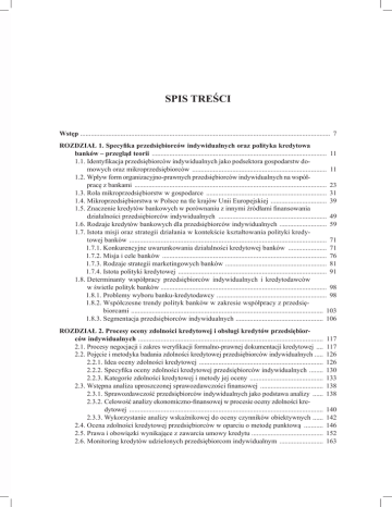 SPIS TREŚCI Wstęp ................................................................................................................................................ 7 ROZDZIAŁ 1. Specyfika przedsiębiorców indywidualnych oraz polityka kredytowa banków – przegląd teorii ..................................................................................................... 11 1.1. Identyfikacja przedsiębiorców indywidualnych jako podsektora gospodarstw domowych oraz mikroprzedsiębiorców .............................................................................. 11 1.2. Wpływ form organizacyjno-prawnych przedsiębiorców indywidualnych na współpracę z bankami ............................................................................................................... 23 1.3. Rola mikroprzedsiębiorstw w gospodarce ...................................................................... 31 1.4. Mikroprzedsiębiorstwa w Polsce na tle krajów Unii Europejskiej ................................. 39 1.5. Znaczenie kredytów bankowych w porównaniu z innymi źródłami finansowania działalności przedsiębiorców indywidualnych ............................................................... 49 1.6. R odzaje kredytów bankowych dla przedsiębiorców indywidualnych ............................ 59 1.7. Istota misji oraz strategii działania w kontekście kształtowania polityki kredytowej banków .................................................................................................................. 71 1.7.1. Konkurencyjne uwarunkowania działalności kredytowej banków ....................... 71 1.7.2. Misja i cele banków ............................................................................................... 76 1.7.3. Rodzaje strategii marketingowych banków ........................................................... 81 1.7.4. Istota polityki kredytowej ...................................................................................... 91 1.8. D eterminanty współpracy przedsiębiorców indywidualnych i kredytodawców w świetle polityk banków ............................................................................................... 98 1.8.1. Problemy wyboru banku-kredytodawcy ................................................................ 98 1.8.2. Współczesne trendy polityk banków w zakresie współpracy z przedsiębiorcami ............................................................................................................... 103 1.8.3. Segmentacja przedsiębiorców indywidualnych ................................................... 106 ROZDZIAŁ 2. Procesy oceny zdolności kredytowej i obsługi kredytów przedsiębiorców indywidualnych ........................................................................................................... 2.1. Procesy negocjacji i zakres weryfikacji formalno-prawnej dokumentacji kredytowej ..... 2.2. Pojęcie i metodyka badania zdolności kredytowej przedsiębiorców indywidualnych ..... 2.2.1. Idea oceny zdolności kredytowej ........................................................................ 2.2.2. Specyfika oceny zdolności kredytowej przedsiębiorców indywidualnych ......... 2.2.3. Kategorie zdolności kredytowej i metody jej oceny ........................................... 2.3. Wstępna analiza uproszczonej sprawozdawczości finansowej ..................................... 2.3.1. Sprawozdawczość przedsiębiorców indywidualnych jako podstawa analizy ....... 2.3.2. Celowość analizy ekonomiczno-finansowej w procesie oceny zdolności kredytowej ................................................................................................................ 2.3.3. Wykorzystanie analizy wskaźnikowej do oceny czynników obiektywnych ....... 2.4. Ocena zdolności kredytowej przedsiębiorców w oparciu o metodę punktową ............ 2.5. Prawa i obowiązki wynikające z zawarcia umowy kredytu ......................................... 2.6. Monitoring kredytów udzielonych przedsiębiorcom indywidualnym .......................... 117 117 126 126 130 133 138 138 140 142 146 152 163 6 2.7. Identyfikacja barier kredytowych .................................................................................. 2.7.1. Zakres barier ograniczających powstawanie i rozwój przedsiębiorstw .............. 2.7.2. Bariery związane z uzyskaniem kredytów przez mikroprzedsiębiorstwa ........... 2.7.3. Przyczyny ograniczeń kredytowych w opiniach banków ................................... 2.8. Specyfika ryzyka kredytowania przedsiębiorców indywidualnych .............................. 2.8.1. Istota ryzyka kredytowego .................................................................................. 2.8.2. Rodzaje i źródła ryzyka kredytowania przedsiębiorców .................................... 2.8.3. Konsekwencje kredytowania podmiotów rozpoczynających oraz rozwijających działalność gospodarczą .............................................................................. 2.9. Preferencje banków i przedsiębiorców indywidualnych w zakresie doboru zabezpieczeń spłaty kredytów ................................................................................................. ROZDZIAŁ 3. Analiza polityki kredytowania przedsiębiorców indywidualnych w świetle badań ................................................................................................................... 3.1. Uwarunkowania popytu i podaży kredytów ................................................................. 3.1.1. Zapotrzebowanie przedsiębiorców indywidualnych na kredyty ......................... 3.1.2. Czynniki kształtujące podaż kredytów ................................................................ 3.2. Struktura zadłużenia przedsiębiorców indywidualnych ............................................... 3.2.1. Kredyty oferowane przez banki przedsiębiorcom indywidualnym .................... 3.2.2. Stru