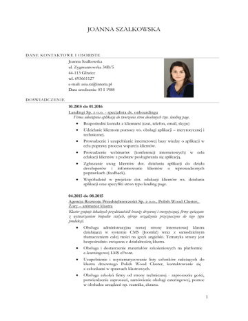 JOANNA SZALKOWSKA DANE KONTAKTOWE I OSOBISTE Joanna Szalkowska ul. Zygmuntowska 34B/5 44-113 Gliwice tel. 693661127 e-mail: [email protected] Data urodzenia: 03 I 1988 DOŚWIADCZENIE 10.2015 do 01.2016 Landingi Sp. z o.o. - specjalista ds. onboardingu Firma udostępnia aplikację do tworzenia stron docelowych tzw. landing page. Bezpośredni kontakt z klientami (czat, telefon, email, skype) Udzielanie klientom pomocy ws. obsługi aplikacji – merytorycznej i technicznej. Prowadzenie i uzupełnianie internetowej bazy wiedzy o aplikacji w celu poprawy procesu wsparcia klientów. Prowadzenie webinarów (konferencji internetowych) w celu edukacji klientów z podstaw posługiwania się aplikacją. Zgłaszanie uwag klientów dot. działania aplikacji do działu developerów i informowanie klientów o wprowadzonych poprawkach (feedback). Współudział w projekcie dot. edukacji klientów ws. działania aplikacji oraz specyfiki stron typu landing page. 04.2015 do 08.2015 Agencja Rozwoju Przedsiębiorczości Sp. z o.o., Polish Wood Cluster, Żory – animator klastra Klaster grupuje lokalnych przedstawicieli branży drzewnej i energetycznej, firmy związane z wytwarzaniem biopaliw stałych, oferuje urządzenia przeznaczone do tego typu produkcji. Obsługa administracyjna nowej strony internetowej klastra działającej w systemie CMS (Joomla!) wraz z samodzielnym tłumaczeniem całej treści na język angielski. Tematyka strony jest bezpośrednio związana z działalnością klastra. Obsługa i dostarczenie materiałów szkoleniowych na platformie e-learningowej LMS eFront. Uzupełnienie i usystematyzowanie listy członków należących do klastra drzewnego Polish Wood Cluster, kontaktowanie się z członkami w sprawach klastrowych. Obsługa szkoleń firmy od strony technicznej - zaproszenie gości, potwierdzenie zaproszeń, zamówienie obsługi cateringowej, pomoc w obsłudze urządzeń np. rzutnika, ekranu. 1 JOANNA SZALKOWSKA Czuwanie nad obiegiem dokumentów firmowych (porozumienie o przystąpieniu do klastra). 10.2009 do 07.2013 oraz od 10.2013 do 03.2015 Miesięcznik „Europerspektywy”, Katowice – redaktor/edytor Tematyka miesięcznika koncentruje się na lokalnym samorządzie województwa śląskiego, przedsiębiorczości i gospodarce. Pisanie artykułów, redakcja i edycja tekstu – tekstów zleconych oraz własnych. Tworzenie tekstów reklamowych ABL i BTL. Wyszukiwanie informacji z danego zakresu tematycznego (m.in. energetyka, górnictwo, przedsiębiorstwa wodno-kanalizacyjne, CSR, PR, działalność samorządów lokalnych). Przygotowanie pytań do wywiadów. Prowadzenie dokumentacji redakcyjnej (ogłoszenia redakcji, media plan, cenniki, listy gratulacyjne itd.). Współtworzenie wydań specjalnych – przygotowywanych na potrzeby redakcji, a także na indywidualne zlecenie klienta. Tłumaczenie wskazanych partii tekstu na język angielski. Udział w wydarzeniach branżowych takich jak konferencje, kongresy, targi. Kontakt z reklamodawcami oraz dbałość pomyślną finalizację projektów reklamowych, przy stałej współpracy z klientem. 01.07.2013 do 16.09.2013 Kopex SA – praktykantka w Dziale Komunikacji Wewnętrznej i CSR Jeden z dwóch największych dostawców urządzeń i maszyn dla górnictwa na polskim rynku. Tworzenie newsletterów kierowanych do pracowników Grupy Kopex. Treści koncentrowały się na informowaniu o najnowszych osiągnięciach grupy (sprzedaż, nowe inwestycje, przedsięwzięcia) oraz wydarzeniach integracyjnych (wycieczki, akcje charytatywne). Stworzenie treści broszury informacyjnej dotyczącej szeroko zakrojonego programu szkoleniowego Grupy Kopex. Uczestnictwo w procesach wdrażania platformy społecznobiznesowej IBM w Grupie. Odpowiedzialność za terminowy obieg dokumentacji działowej, głównie faktur oraz przygotowywanie ich do rozliczenia księgowego według wytycznych firmy. Współorganizacja konferencji prasowych działu DKWiCSR od strony technicznej – zaproszenie gości, potwierdzenie zaproszeń, zamówienie obsługi cateringowej. 09.2009-10.2009 Wydawnictwo Naukowe Śląsk, Katowice – praktyka zawodowa 2 JOANNA SZALKOWSKA Wydawnictwo współpracuje z uczelniami wyższymi z całego kraju m.in. Politechniką Śląską, Uniwersytetem Śląskim, Akademią Góniczo-Hutniczą w Krakowie. Zapoznamie się z podstawowymi znakami korektorskimi, zasadami redakcji, edycji i korekty. Korekta książki pt. „Turniej Garbusów. Problematyka tożsamości w twórczości Witolda Gombrowicza i Czesława Miłosza” przygotowanej do druku – przedsięwzięcie zakończyło się pomyślnie. WYKSZTAŁCENIE 2015 do nadal Wyższa Szkoła Biznesu w Dąbrowie Górniczej, studia inżynierskie na kierunku Informatyka. 2012-2013 Uniwersytet Ekonomiczny w Katowicach, studia podyplomowe na kierunku Public Relations - nowoczesna komunikacja w praktyce. 2010-2012 Uniwersytet Śląski w Katowicach, ukończone studia na kierunku filologia polska, specjalizacja literaturoznawcza. 2007-2010 Uniwersytet Śląski w Katowicach, ukończone studia na kierunku filologia polska, specjalizacja edytorstwo i redakcja tekstów. UMIEJĘTNOŚCI Znajomość języka angielskiego na poziomie zaawansowanym – uzyskany certyfikat CAE na poziomie C1; Podstawowa znajomość obsługi pakietu MS Office (w tym dobra znajomość programu Word oraz Excel); Podstawowa znajomość CMS; Podstawowa znajomość obsługi programu Adobe Photoshop; Prawo jazdy kat. B. ZAINTERESOWANIA Czytanie książek (wszelkiego rodzaju); Malarstwo cyfrowe (Digital Painting); Amatorska wspinaczka górska. Wyrażam zgodę na przetwarzanie moich danych osobowych dla potrzeb niezbędnych do realizacji procesu rekrutacji (zgodnie z Ustawą z dnia 29.08.1997 roku o Ochronie Danych Osobowych; tekst jednolity: Dz. U. z 2002r. Nr 101, poz. 926 ze zm.). 3