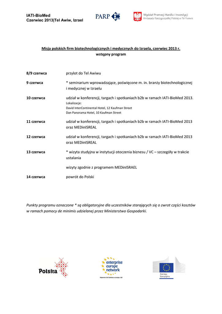 IATI-BioMed Czerwiec 2013|Tel Awiw, Izrael Misja polskich firm biotechnologicznych i medycznych do Izraela, czerwiec 2013 r. wstępny program 8/9 czerwca przylot do Tel Awiwu 9 czerwca * seminarium wprowadzające, poświęcone m. in. branży biotechnologicznej i medycznej w Izraelu 10 czerwca udział w konferencji, targach i spotkaniach b2b w ramach IATI-BioMed 2013. Lokalizacje: David InterContinental Hotel, 12 Kaufman Street Dan Panorama Hotel, 10 Kaufman Street 11 czerwca udział w konferencji, targach i spotkaniach b2b w ramach IATI-BioMed 2013 oraz MEDinISREAL 12 czerwca udział w konferencji, targach i spotkaniach b2b w ramach IATI-BioMed 2013 oraz MEDinISREAL 13 czerwca * wizyta studyjna w instytucji otoczenia biznesu / VC – szczegóły w trakcie ustalania wizyty zgodnie z programem MEDinISRAEL 14 czerwca powrót do Polski Punkty programu oznaczone * są obligatoryjne dla uczestników starających się o zwrot części kosztów w ramach pomocy de minimis udzielanej przez Ministerstwo Gospodarki.