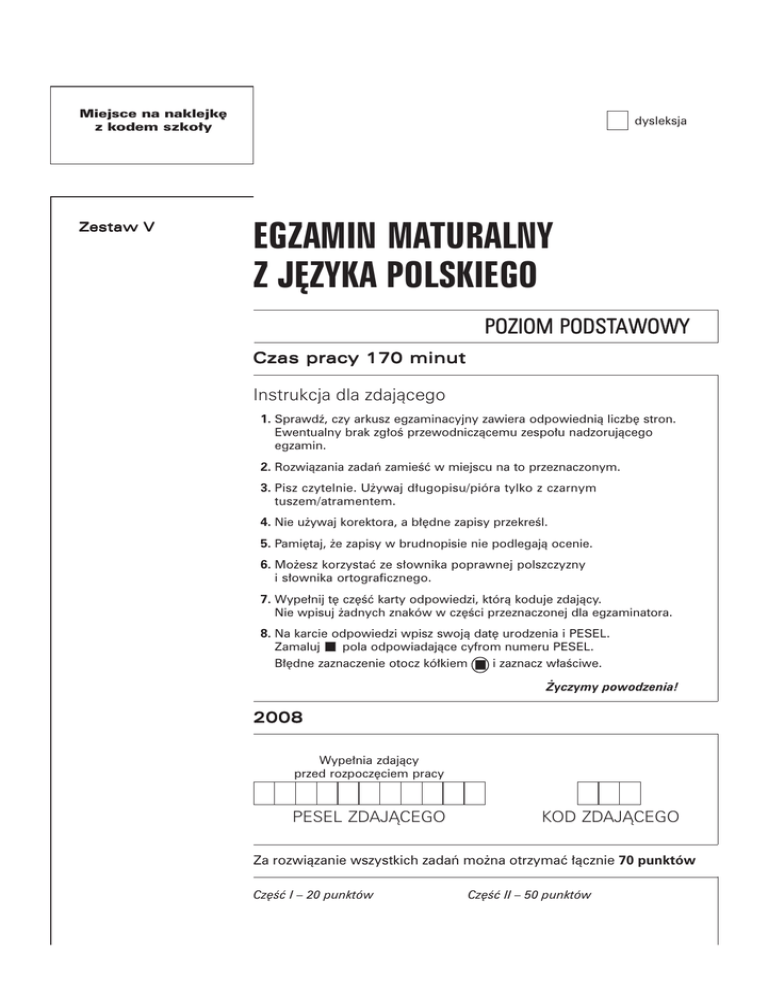 E G Z A M I N M AT U R A L N Y Z J Ę Z Y K A P O L S K I E G O Miejsce na naklejkę z kodem szkoły Zestaw V dysleksja EGZAMIN MATURALNY Z JĘZYKA POLSKIEGO POZIOM PODST A WOWY PODSTA Czas pracy 170 minut Instrukcja dla zdającego 1. Sprawdź, czy arkusz egzaminacyjny zawiera odpowiednią liczbę stron. Ewentualny brak zgłoś przewodniczącemu zespołu nadzorującego egzamin. 2. Rozwiązania zadań zamieść w miejscu na to przeznaczonym. 3. Pisz czytelnie. Używaj długopisu/pióra tylko z czarnym tuszem/atramentem. 4. Nie używaj korektora, a błędne zapisy przekreśl. 5. Pamiętaj, że zapisy w brudnopisie nie podlegają ocenie. 6. Możesz korzystać ze słownika poprawnej polszczyzny i słownika ortograficznego. 7. Wypełnij tę część karty odpowiedzi, którą koduje zdający. Nie wpisuj żadnych znaków w części przeznaczonej dla egzaminatora. 8. Na karcie odpowiedzi wpisz swoją datę urodzenia i PESEL. Zamaluj pola odpowiadające cyfrom numeru PESEL. Błędne zaznaczenie otocz kółkiem i zaznacz właściwe. Życzymy powodzenia! 2008 Wypełnia zdający przed rozpoczęciem pracy PESEL ZDAJĄCEGO KOD ZDAJĄCEGO Za rozwiązanie wszystkich zadań można otrzymać łącznie 70 punktów Część I – 20 punktów Część II – 50 punktów 195 E G Z A M I N M AT U R A L N Y Z J Ę Z Y K A P O L S K I E G O POZIOM PODST AWOWY PODSTA Zestaw V Część I – rozumienie czytanego tekstu Przeczytaj uważnie tekst, a następnie wykonaj zadania umieszczone pod nim. Odpowiadaj tylko na podstawie tekstu i tylko własnymi słowami – chyba że w zadaniu polecono inaczej. Udzielaj tylu odpowiedzi, o ile jesteś proszona/y. Tłumacz – postać XXI wieku 1. 2. 3. 4. 5. 6. 7. 196 Kiedy otrzymałem propozycję przygotowania i wygłoszenia tego wykładu, ogarnęły mnie wątpliwości i obawy. Nie jestem bowiem zawodowym tłumaczem i nie mam w tej dziedzinie ani doświadczenia, ani dorobku. [...] Jeżeli jednak ośmielam się wystąpić tu przed Państwem, to aby powiedzieć, że jesteśmy w tej chwili, w tej właśnie chwili, świadkami narodzin nowej roli i nowego miejsca tłumaczki i tłumacza w świecie, w kulturze i w literaturze współczesnej. [...] Tradycyjnie miejsce tłumacza w hierarchii literackiej było odległe, a tłumacze często – nieznani, ich nazwiska pomijane lub ograniczone do inicjałów czy zastępowane pseudonimami. [...] Ten stan zaczął zmieniać się na lepsze w ostatnich dekadach minionego stulecia, a już w końcowych latach XX wieku zaczyna ulegać radykalnej i pomyślnej zmianie w rezultacie kilku występujących jednocześnie czynników: – po pierwsze – kończy się zimna wojna, która na pół wieku zamroziła sytuację na świecie, utrudniając albo nawet uniemożliwiając stosunki między krajami i kulturami, w tym – między językami. Otóż po jej zakończeniu świat stał się bardziej otwarty, bardziej demokratyczny. Zwiększyła się szansa wzajemnego zbliżenia i poznania, dialogu, rozmowy, wymiany zdań i opinii. Wszyscy jednak szybko zorientowali się, że ta szansa nie będzie wykorzystana bez obecności i pośrednictwa kogoś, kto przetłumaczy słowa i myśli jednego języka na drugi, inny – a więc bez tłumaczy. Obecność tłumacza [...] staje się warunkiem istnienia i współżycia wspólnoty ludzkiej – rodziny człowieczej; – drugi czynnik – otóż to wspomniane wyżej nowe otwarcie świata pozwoliło lepiej zobaczyć i odczuć jego różnorodność i złożoność, a zwłaszcza – jego wielokulturowość (a tym samym i wielojęzyczność). Oczywiście od dawna, od czasów biblijnych, od czasów wieży Babel, wiedziano o tym i borykano się z tym problemem. [...] Dane są oszałamiające – na początku XX wieku mieliśmy ponad sześć tysięcy języków na świecie, ponad dwa tysiące w samej tylko Afryce. [...] To zdumiewające pomieszanie języków nie jest jednak – według Biblii – symbolem bogactwa wyobraźni człowieka, lecz zesłaną na niego karą, rodzajem uwięzienia, które go izoluje i ogranicza. [...] Nieznajomość języka może stać się źródłem lęku, strachu, wrogości, a w następstwie – wręcz wojny. Ileż zresztą w historii było konfliktów i wojen językowych, ileż tragedii, ofiar i zniszczeń! Ale i odwrotnie – znać język Innego to szansa, aby się z nim porozumieć, nawiązać rozmowę, dialog i współpracę. [...] A teraz, współcześnie, dzisiaj, temu otwarciu świata, większemu udostępnieniu świata, oraz owej budzącej się powszechnie świadomości jego wielokulturowości, a tym samym i jego wielojęzyczności, towarzyszy wielka rewolucja komunikacyjna, przewrót elektroniczny stwarzający szansę szybkiego i bardziej powszechnego zbliżenia, kontaktu międzyludzkiego. [...] Szczególna w tym wszystkim jest rola tłumacza tekstów, tłumacza literatury, jako że nasza cywilizacja, mimo wielkiego znaczenia obrazu i dźwięku, jest cywilizacją tekstu, słowa pisanego i utrwalonego drukiem. Jest truizmem, że planeta, na której żyjemy, znajduje się w procesie przyspieszonej i głębokiej przemiany, a temu prawu przyspieszenia ulega także świat języka. Bardzo dużo języków, setki, nawet tysiące, nigdy i nigdzie niezapisanych, zniknęło i nadal znika, gdyż ten fenomen zagłady trwa w dalszym ciągu, jako że wymierają nosiciele tych języków – plemiona i klany. Dotyczy to głównie strefy klimatów gorących, tropikalnych. [...] Tak jak w wielu innych dziedzinach, również i przez świat języków przepływają dwa przeciwstawne nurty. Z jednej strony jest to nurt unifikacji, uniwersalizacji, zmierzający do tego, aby coraz więcej ludzi mówiło coraz mniejszą liczbą języków. W tym nurcie najbardziej dziś dynamicznymi są angielski, chiński i hiszpański. Widać tu – notabene – najlepiej, jak siła gospodarcza wpływa na pozycję i znaczenie języka. Nurt przeciwny zmierza do utrzymania, umocnienia i rozwoju języków poszczególnych narodowości, etni