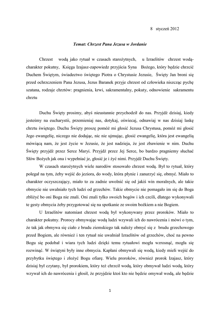 8 styczeń 2012 Temat: Chrzest Pana Jezusa w Jordanie Chrzest wodą jako rytuał w czasach starożytnych, u Izraelitów chrzest wodą- charakter pokutny, Księga Izajasz-zapowiedz przyjścia Syna Bożego, który będzie chrzcić Duchem Świętym, świadectwo świętego Piotra o Chrystusie Jezusie, Święty Jan broni się przed ochrzczeniem Pana Jezusa, Jezus Baranek przyje chrzest od człowieka niszcząc pychę szatana, rodzaje chrztów: pragnienia, krwi, sakramentalny, pokuty, odnowienie sakramentu chrztu Duchu Święty prosimy, abyś nieustannie przychodził do nas. Przyjdź dzisiaj, kiedy jesteśmy na eucharystii, przemieniaj nas, dotykaj, oświecaj, odnawiaj w nas dzisiaj laskę chrztu świętego. Duchu Święty proszę pomóż mi głosić Jezusa Chrystusa, pomóż mi głosić Jego ewangelię, niczego nie dodając, nic nie ujmując, głosić ewangelię, która jest ewangelią mówiącą nam, że jest życie w Jezusie, że jest nadzieja, że jest zbawienie w nim. Duchu Święty przyjdź przez Serce Maryi. Przyjdź przez Jej Serce, bo bardzo pragniemy słuchać Słów Bożych jak ona i wypełniać je, głosić je i żyć nimi. Przyjdź Duchu Święty. W czasach starożytnych wiele narodów stosowało chrzest wodą. Był to rytuał, który polegał na tym, żeby wejść do jeziora, do wody, która płynie i zanurzyć się, obmyć. Miało to charakter oczyszczający, miało to za zadnie uwolnić się od jakiś win moralnych, ale takie obmycie nie uwalniało tych ludzi od grzechów. Takie obmycie nie pomagało im się do Boga zbliżyć bo oni Boga nie znali. Oni znali tylko swoich bogów i ich czcili, dlatego wykonywali te gesty obmycia żeby przygotować się na spotkanie ze swoim bożkiem a nie Bogiem. U Izraelitów natomiast chrzest wodą był wykonywany przez proroków. Miało to charakter pokutny. Prorocy obmywając wodą ludzi wzywali ich do nawrócenia i mówi o tym, że tak jak obmywa się ciało z brudu ziemskiego tak należy obmyć się z brudu grzechowego przed Bogiem, ale również i ten rytuał nie uwalniał Izraelitów od grzechów, choć na pewno Bogu się podobał i wiara tych ludzi dzięki temu rytuałowi mogła wzrosnąć, mogła się rozwinąć. W świątyni były inne obmycia. Kapłani obmywali się wodą, kiedy mieli wejść do przybytku świętego i złożyć Bogu ofiarę. Wielu proroków, również prorok Izajasz, który dzisiaj był czytany, był prorokiem, który też chrzcił wodą, który obmywał ludzi wodą, który wzywał ich do nawrócenia i głosił, że przyjdzie ktoś kto nie będzie omywał wodą, ale będzie 1 chrzcił Duchem Świętym i Ogniem. To nie będzie już chrzest z tego świata, ale chrzest niebieski. Dzisiaj Izajasz przytacza słowa Boga, które usłyszał od Niego samego. To już nie są słowa Izajasza, ale słowo Boga. Prorok Izajasz mówi o tym co od Boga usłyszał o Mesjaszu, o Synu Bożym. Dzisiejsze słowa z Księgi Izajasza są więc słowami Boga Ojca, który mówi o tym, że pośle na świat Syna Bożego, który będzie Jego umiłowanym, wybranym, który będzie otwierał oczy niewidomym, który będzie uwalniał ludzi z więzów, ale nie z więzów polegających na tym żeby wejść do więżenia i uwolnić danego człowieka, który był kiedyś złoczyńcą, ale z więzów zła, więzów grzechu. Bóg mówi o tym z radością o Swoim Synu, na którego połozy Duchu Świętego, który będzie namaszczony Duchem Świętym, ochrzczony Duchem Świętym, aby mógł On z kolei chrzcić Duchem Świętym. Drugie czytanie jest z kolei świadectwem świętego Piotra. Święty Piotr daje świadectwo o Chrystusie Jezusie, którego widział, który był dla niego Nauczycielem, Panem, Mistrzem, Mesjaszem, Synem Bożym, którego wyznał pod Cezareą Filpową: Ty jesteś Mesjasz, Syn Boży, posłany przez Ojca, ogłoszony przez Izajasza. Święty Piotr mówi o tym, że Jezus potwierdza, że był namaszczony Duchem Świętym i mocą, i dzięki temu, że miał taką moc Ducha Świętego od Ojca mógł dobrze czynić. I uwalniał z władzy i mocy szatana, bo Syn Boży przyszedł po to, aby zgładzić grzechy i zniszczyć dzieła diabla, czyli śmierć, czyli choroby, czyli cierpienia, czyli rozpacz. Dzisiejsza ewangelia, choć krótka, jest ewangelią pełną miłości. Jan Chrzciciel z wielką pokorą przyznaje się do tego, ze nie jest godzien schylić się i rozwiązać rzemyka u sandała Mesjasza, Syna Bożego, Jezusa Chrystusa, a w tamtych czasach niewolnicy rozwiązywali rzemyki u sandałów swoich panów. Pan przychodził z jakiś spraw ważnych załatwianych w mieście do domu i natychmiast przychodził niewolnik rozwiązywał rzemyki u sandałów. Rozwiązywał sandały, przynosił wodę i myl nogi swojemu panu, które były brudne, zabrudzone, żeby pan mógł być w domu czysty, żeby pan mógł swobodnie się poruszać w domu. I święty Jan Chrzciciel mówi, że on nie jest godzien być niewolnikiem Mesjasza. Nie jest godzien być niewolnikiem Jezusa, a co dopiero sługą czy synem. Nie jest godzien pochylać się przed Panem. Nie jest godzien wykonywać gestów takich, które mógł by się wydawać dla kogoś niewolniczymi, upokarzającymi. On mówi, że nie jest godzien nawet tego robić choćby nawet chciał się upokorzyć przed Mesjaszem, ale mówi w swojej pokorze, że nawet tego nie jest wstanie i nie może zrobić, bo tak wielki jest Ten, który idzie po nim, bo wielki jest Chrzciciel, który idzie po nim, Jezus. Mówi się Jan Chrzciciel, ale powinno się także mówić Jezus Chrzciciel, bo Jan tylko posługiwał się wodą, a Jezus chrzci Duchem 2 Świętem i Ogniem. Święty Jan mówi, że on jest głosem wołającego, czyli jest kimś większym niż prorok, niż Eliasz, ale mniejszym od Mesjasza. Święty Jan bronił się przed ochrzczeniem Pana Jezusa. W innej ewangelii jest mowa o tym, że mówi do Jezus: Jezu, Panie, ja nie jestem godzien żeby Cie ochrzcić. Powstrzymywał Go, mówił: To ja powinienem przyjąć chrzes