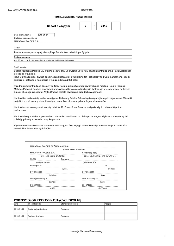MAKARONY POLSKIE S.A. RB 2 2015 KOMISJA NADZORU FINANSOWEGO Raport bieżący nr 2 / 2015 2015-01-27 Data sporządzenia: Skróc ona nazwa emitenta MAKARONY POLSKIE S.A. Temat Zawarcie umowy znaczącej z firmą Raya Distribution z siedzibą w Egipcie Podstawa prawna Art. 56 ust. 1 pkt 2 Ustawy o oferc ie - informac je bieżąc e i okresowe Treść raportu: Spółka Makarony Polskie SA, informuje, że w dniu 26 stycznia 2015 roku zawarła kontrakt z firmą Raya Distribution z siedzibą w Egipcie. Raya Distribution jest dywizją spożywczą należącą do Raya Holding for Technology and Communications, spółki publicznej, notowanej na giełdzie w Kairze od maja 2005 roku. Przedmiotem kontraktu są dostawy do firmy Raya makaronów produkowanych pod markami Spółki (Sorenti i Makrony Polskie). Zgodnie z zapisami umowy firma Raya prowadzić będzie dystrybucję ww. produktów na terenie Egiptu, Bliskiego Wschodu i Afryki. Umowa została zawarta na zasadach wyłączności. Kontrakt ten jest częścią realizowanej przez Makarony Polskie SA strategii ekspansji na rynki zagraniczne. Warunki na jakich został zawarty nie odbiegają od warunków stosowanych dla tego rodzaju umów. Kontrakt został zawarty na okres pięciu lat. W 2015 roku firma Raya zobowiązała się do odbioru 3 tys. ton makaronów. Kontrakt objęty został ubezpieczeniem należności handlowych udzielonym jednego z większych ubezpieczycieli działających w tym zakresie na rynku polskim. Kryterium uznania kontraktu za umowę znaczącą jest fakt, że jego szacunkowa łączna wartość przekracza 10% wartości kapitałów własnych Spółki. MAKARONY POLSKIE SPÓŁKA AKCYJNA (pełna nazwa emitenta) MAKARONY POLSKIE S.A. Spożywc zy (spo) (skróc ona nazwa emitenta) 35-082 (sektor wg. klasyfikac ji GPW w W-wie) Rzeszów (kod poc ztowy) (miejscowość) Podkarpac ka 15 (ulica) (numer) 017 8753010 017 8753011 (telefon) (fax) [email protected] www.makarony.pl (e-mail) (www) 8133278856 691674708 (NIP) (REGON) PODPISY OSÓB REPREZENTUJĄCYCH SPÓŁKĘ Data Imię i Nazwisko Stanowisko/Funkc ja 2015-01-27 Beata Majewska-Karp Prokurent 2015-01-27 Grażyna Kozielec Prokurent Podpis Komisja Nadzoru Finansowego 1