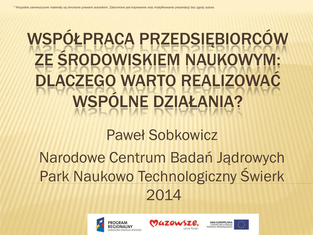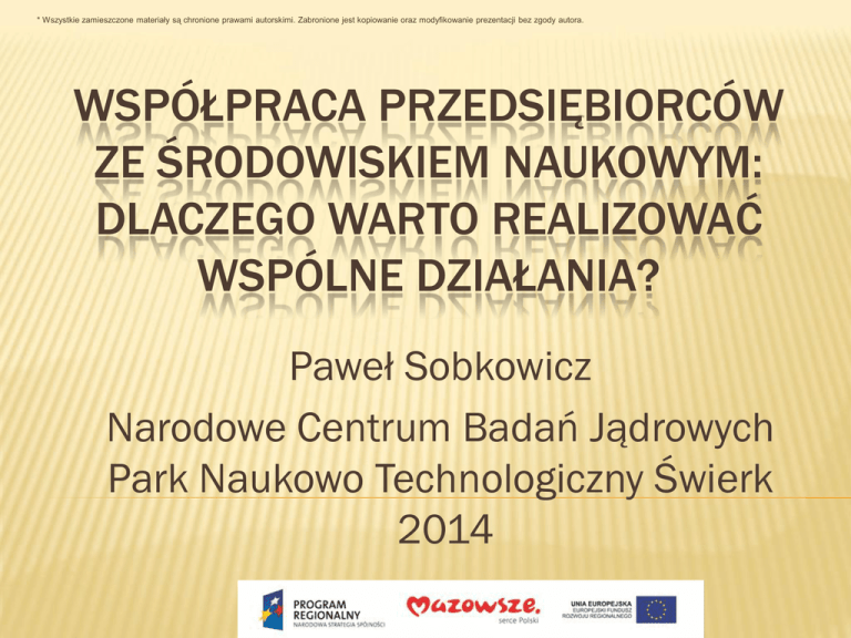 * Wszystkie zamieszczone materiały są chronione prawami autorskimi. Zabronione jest kopiowanie oraz modyfikowanie prezentacji bez zgody autora. WSPÓŁPRACA PRZEDSIĘBIORCÓW ZE ŚRODOWISKIEM NAUKOWYM: DLACZEGO WARTO REALIZOWAĆ WSPÓLNE DZIAŁANIA? Paweł Sobkowicz Narodowe Centrum Badań Jądrowych Park Naukowo Technologiczny Świerk 2014 DLACZEGO WARTO? CÓŻ TO ZA PYTANIE? Kochać nie warto, lubić nie warto, Znaleźć nie warto i zgubić nie warto. Przysiąc nie warto, wierzyć nie warto, Chodzić nie warto i leżeć nie warto. Pieścić nie warto, łowić nie warto, Stracić nie warto, zarobić nie warto. Sprzedać nie warto i kupić nie warto Jedno co warto, to upić się warto. Siedzieć i płakać, i śpiewać to warto. Marian Hemar, 1934 2 WŁAŚCIWE PYTANIA CO? /co ma być przedmiotem współpracy?/ PO CO? /co obie strony chcą osiągnąć?/ JAK? /jak chcemy to osiągnąć?/ ZA ILE? / jakich korzyści oczekują obie strony?/ NA KIEDY? CZYJE TO BĘDZIE? / do kogo należeć będą wyniki, co komu wolno z nimi zrobić?/ 3 WSPÓLNY JĘZYK Odpowiedź na te pytania wymaga znalezienia wspólnego języka między przedsiębiorca a naukowcem. Czasem (rzadko!) taki język znajdują sami: albo naukowiec rozumie przedsiębiorcę, albo przedsiębiorca – naukowca. Najczęściej jednak potrzebni są tłumacze – przykładem mogą być parki naukowo technologiczne. 4 KILKA KWESTII SZCZEGÓŁOWYCH RYZYKO Obie strony muszą rozumieć i właściwie oceniać ryzyko porażki, wbudowane w sam proces poznawania naukowego i powstawania innowacji. OTWARTOŚĆ DZIAŁAŃ Obie strony muszą – zawczasu – przygotować „plan B”, na wypadek porażki głównego planu. Czasem korzyści „poboczne” są bardziej znaczące niż te „podstawowe” 5 KILKA KWESTII SZCZEGÓŁOWYCH BADANIA ZAMIAWIANE a WSPÓLNE POSZUKIWANIA Trzeba rozróżnić pomiędzy współpracą w rozwiązaniu konkretnego (już zidentyfikowanego) problemu przedsiębiorcy, a poszukiwaniem naprawdę innowacyjnych technologii czy produktów, To pierwsze – powoli – w Polsce się rozwija. To drugie nawet nie raczkuje. A to właśnie tam jest największy potencjał. 6 KILKA KWESTII SZCZEGÓŁOWYCH OCZEKIWANIA Przedsiębiorca: szybkie rezultaty, sprawdzone i powtarzalne, produkcja seryjna („pewna kasa, dziś”) Naukowiec: utrzymanie zespołu (jak najdłużej), nowe tematy (publikacje, awanse), prototypy. OCHRONA IP Temat rzeka: kto, co i gdzie ma chronić, kto, co o jak może publikować – konieczne są uzgodnienia zawczasu! 7 DLACZEGO WARTO? 8 DLACZEGO WARTO? 9 JAK TO ZROBIĆ? Państwo musi myśleć i planować długoterminowo Przedsiębiorcy i naukowcy (przy udziale „tłumaczy”) muszą rozmawiać ze sobą Trzeba rozumieć i akceptować ryzyka (jak to jest, że w Polsce 100% projektów B+R kończy się sukcesem?) I wreszcie: NIE Z KAŻDYM WARTO, NIE WSZYSTKO WARTO 10