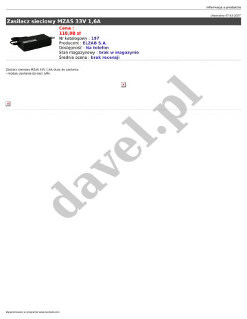 Informacje o produkcie Utworzono 07-03-2017 Zasilacz sieciowy MZAS 33V 1,6A Cena : 118,08 zł Nr katalogowy : 197 Producent : ELZAB S.A. Dostępność : Na telefon Stan magazynowy : brak w magazynie Średnia ocena : brak recenzji da ve l .p l Zasilacz sieciowy MZAS 33V 1,6A służy do zasilania: - modułu zasilania do sieci LAN. Wygenerowano w programie www.oscGold.com