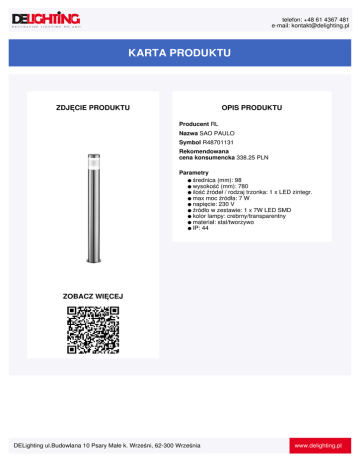 telefon: +48 61 4367 481 e-mail: [email protected] KARTA PRODUKTU ZDJĘCIE PRODUKTU OPIS PRODUKTU Producent RL Nazwa SAO PAULO Symbol R48701131 Rekomendowana cena konsumencka 338.25 PLN Parametry ● średnica (mm): 98 ● wysokość (mm): 780 ● ilość źródeł / rodzaj trzonka: 1 x LED zintegr. ● max moc źródła: 7 W ● napięcie: 230 V ● źródło w zestawie: 1 x 7W LED SMD ● kolor lampy: crebrny/transparentny ● materiał: stal/tworzywo ● IP: 44 ZOBACZ WIĘCEJ DELighting ul.Budowlana 10 Psary Małe k. Wrześni, 62-300 Września www.delighting.pl