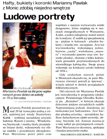 Hafty, bukiety i koronki Marianny Pawlak z Monic zdobią niejedno wnętrze Ludowe portrety ariannę Pawlak poznałam ponad 20 lat temu jako jedną z córek, sędziwej już wtedy Stanisławy Kubik - wybitnej sieradzkiej artystki ludowej. Razem z siostrą - Władysławą Szymczak i matką tkały przepiękne lniane derki, wykonywały tez różne ozdoby i przedmioty obrzędowe. Pani Marianna przez jakiś czas M wspólnie z mężem wytwarzała wózki dyngusowe, które znajdują się w muzeach etnograficznych w Warszawie, Łodzi, a jeden zakupiony został nawet do Londynu. Z ozdób jej specjalnością są - piękne w kolorach - płaskie bukiety i wianki tzw. szczępiate. Jest też wycinankarką wykonującą jednobarwne „cacka", wielobarne „mazury" i wycinanki pasowe oraz tzw. koronki płaskie, złożone z kilku kolorowych gwiazdek przytwierdzonych do niewielkiego kabłączka. Swoje prace wykonuje na konkursy sztuki ludowej od 1954 r. Gdy szukałam starych pieśni w Monicach okazało się, że pani Marianna również potrafi je śpiewać wzięła udział w dwóch przeglądach folklorystycznych. Od czterech lat Marianna Pawlak jest instruktorką w programie edukacyjnym Powiatowego Ośrodka Kultury pn. „Krzesiwo", w którym ukazuje dzieciom piękno sieradzkich ozdób. Najważniejszą jednak dziedziną jej twórczości jest hafciarstwo. Jest bardzo płodną artystką - sieradzkim haftem fartuchowym zdobi serwetki, obrusy, bieżniki itd. Zawsze można je u niej nabyć po przystępnych cenach. Pani Marianna to skromna, spokojna i bardzo pracowito osoba. MAI.GORZATA DZIUROWICZ - KASZUBA