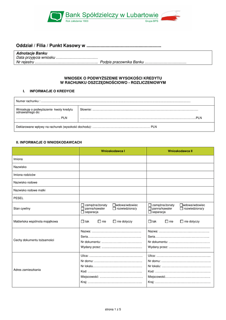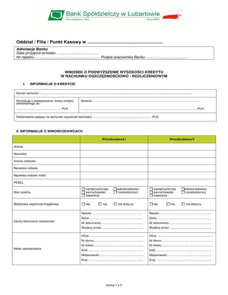 Oddział / Filia / Punkt Kasowy w ........................................................... Adnotacje Banku Data przyjęcia wniosku …………………………… Nr rejestru ………………………………………….. Podpis pracownika Banku …………………………… WNIOSEK O PODWYŻSZENIE WYSOKOŚCI KREDYTU W RACHUNKU OSZCZĘDNOŚCIOWO - ROZLICZENIOWYM I. INFORMACJE O KREDYCIE Numer rachunku : ................................................................................................................................................................................. Wnioskuję o podwyższenie kwoty kredytu odnawialnego do: Słownie: ……………………………..…………………….……………………………………… …………….………………………. PLN ………………….………………………………..……………………………………………….PLN Deklarowane wpływy na rachunek (wysokość dochodu): ………………………………………………… PLN II. INFORMACJE O WNIOSKODAWCACH Wnioskodawca I Wnioskodawca II Imiona Nazwisko Imiona rodziców Nazwisko rodowe Nazwisko rodowe matki PESEL Stan cywilny zamężna/żonaty panna/kawaler separacja Małżeńska wspólnota majątkowa tak Cechy dokumentu tożsamości Adres zamieszkania nie wdowa/wdowiec rozwiedziona/y nie dotyczy zamężna/żonaty panna/kawaler separacja tak nie wdowa/wdowiec rozwiedziona/y nie dotyczy Nazwa: …………………………………………. Nazwa: ………………………….………………. Seria…………………………………………….. Seria…………………………….……………….. Nr dokumentu: ……………….………………… Nr dokumentu: …………….…….……………… Wydany przez: ................................................ Wydany przez: ................................................. Ulica: ………………………….…………………. Ulica: ……………………………………………... Nr domu: ………………….…………………….. Nr domu: …………………………………………. Nr lokalu………………….……………………… Nr lokalu: …………………….…………………… Kod: ……………………………………………... Kod: …………………………….………………… Miejscowość: …………………….……………… Miejscowość………………….………………….. Kraj: ……………………………………………... Kraj: ………………………….…………………… strona 1 z 5 Wnioskodawca I Adres do korespondencji (jeżeli jest inny niż adres zamieszkania) Nr telefonu (do wyboru) Wnioskodawca II Ulica……...………………………….…………… Ulica……...…………………….….……………… Nr domu: ……...………………………………… Nr domu: ……...…………………….…………… Nr lokalu: ……...……………...………………… Nr lokalu: ……...…………….…………………… Kod……...………….……….…………………… Kod……...………..…………….………………… Miejscowość: ……...…………………………… Miejscowość: …………....……………………… Kraj: ……...……………………………………… Kraj: ……...…………….………………………… stacjonarny: …………………………….………… stacjonarny: ……………………………………… komórkowy: ………………………….………….. komórkowy: ……………………….……………… E-mail: Wykształcenie wyższe magisterskie licencjat/inżynier średnie zasadnicze zawodowe podstawowe/gimnazjalne wyższe magisterskie licencjat/inżynier średnie zasadnicze zawodowe podstawowe/gimnazjalne Wykonywany zawód III. INFORMACJE O DOCHODACH I WYDATKACH Wnioskodawca I Wnioskodawca II Całkowity staż pracy (w latach) Okres zatrudnienia u obecnego pracodawcy/czas prowadzenia obecnej dział. gospodarczej (w latach) Informacje o pracodawcy (nazwa, adres) Stanowisko Miesięczny dochód netto: Źródła dochodu właściciel firmy wyższa kadra zarządzająca średnia kadra zarządzająca urzędnik specjalista pracownik inne ..................................... PLN, w tym: umowa o pracę: .................................... emerytura: ............................................ renta: .................................................... zasiłek przedemerytalny: ...................... wolne zawody: ...................................... działalność gospodarcza: ..................... działalność rolnicza: ............................. umowa cywilno-prawna: ....................... umowa najmu: ...................................... umowa o pracę na czas określony do…….................: ............................... odsetki z aktywów finansowych: ............................................................. dywidendy: ........................................... inne: ...................................................... Liczba osób w gosp. (w tym dzieci) Wydatki stałe gospodarstwa domowego (np.: czynsz, fundusz remontowy, opłaty za wodę, RTV, energię elektryczną, gaz, ogrzewanie, telefon/y, utrzymanie samochodu/ów, podatki, ubezpieczenia osobiste i majątkowe, koszty utrzymania rodziny, inne). Wnioskodawca I i Wnioskodawca II należą do tego samego gospodarstwa domowego strona 2 z 5 właściciel firmy wyższa kadra zarządzająca średnia kadra zarządzająca urzędnik specjalista pracownik inne ..................................... PLN, w tym: umowa o pracę: ........................................ emerytura: ................................................ renta: ........................................................ zasiłek przedemerytalny: .....................