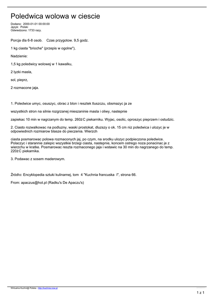 Poledwica wolowa w ciescie Dodano: 2000-01-01 00:00:00 Język: Polski Odwiedzono: 1733 razy. Porcja dla 6-8 osob. Czas przygotow. 9,5 godz. 1 kg ciasta "brioche" (przepis w ogolne"), Nadzienie: 1,5 kg poledwicy wolowej w 1 kawalku, 2 lyzki masla, sol, pieprz, 2 rozmacone jaja. 1. Poledwice umyc, osuszyc, obrac z blon i resztek tluszczu, obsmazyc ja ze wszystkich stron na silnie rozgrzanej mieszaninie masla i oliwy, nastepnie zapiekac 10 min w nagrzanym do temp. 260żC piekarniku. Wyjac, osolic, oproszyc pieprzem i ostudzic. 2. Ciasto rozwalkowac na podluzny, waski prostokat, dluzszy o ok. 15 cm niz poledwica i ulozyc je w odpowiednich rozmiarow blasze do pieczenia. Wierzch ciasta posmarowac polowa rozmaconych jaj, po czym, na srodku ulozyc podpieczona poledwice. Polaczyc i starannie zalepic wszystkie brzegi ciasta, nastepnie, koncem ostrego noza ponacinac je z wierzchu w kratke. Posmarowac reszta rozmaconego jaja i wstawic na 30 min do nagrzanego do temp. 220żC piekarnika. 3. Podawac z sosem maderowym. Źródło: Encyklopedia sztuki kulinarnej, tom 4 "Kuchnia francuska I", strona 66. From: [email protected] (Radku's De Apaczu's) Wirtualna Kuchni@ Polska - http://kuchnia.now.pl przepis nr 6174, plik wygenerowano 2017.03.07 11:23 1z1
