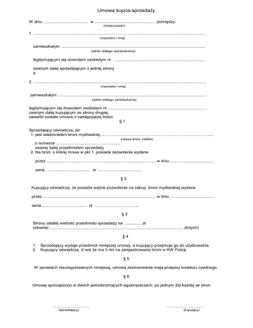 Umowa kupna-sprzedaŜy W dniu ...................................... w .................................................... pomiędzy: (miejscowość) 1. .................................................................................................................................................. (nazwisko i imię) zamieszkałym ........................................................................................................................... (adres stałego zamieszkania) legitymującym się dowodem osobistym nr .............................................................................. zwanym dalej sprzedającym z jednej strony a 2. ................................................................................................................................................... (nazwisko i imię) zamieszkałym ............................................................................................................................... (adres stałego zamieszkania) legitymującym się dowodem osobistym nr..................................................................................... zwanym dalej kupującym ze strony drugiej, zawarta została umowa o następującej treści: §1 Sprzedający oświadcza, Ŝe: 1. jest właścicielem broni myśliwskiej................................................................................................. (nazwa broni, kaliber) o numerze ....................................................... zwanej dalej przedmiotem sprzedaŜy 2. Na broń, o której mowa w pkt 1, posiada zezwolenie wydane przez ............................................................................................. w dniu ...................................... seria ...................................... nr ...................................... §2 Kupujący oświadcza, Ŝe posiada waŜne pozwolenie na zakup broni myśliwskiej,wydane przez ................................................................................................ w dniu ...................................... seria ...................................... nr ...................................... §3 Strony ustaliły wartość przedmiotu sprzedaŜy na ................zł (słownie:.................................................................................................................. złotych) §4 1. Sprzedający wydaje przedmiot niniejszej umowy, a kupujący przejmuje go do uŜytkowania. 2. Kupujący oświadcza, iŜ wie Ŝe ma 5 dni na zarejestrowanie broni w KW Policji. §5 W sprawach nieuregulowanych niniejszą, umową zastosowanie mają przepisy kodeksu cywilnego. §6 Umowę sporządzono w dwóch jednobrzmiących egzemplarzach, po jednym dla kaŜdej ze stron. ...................................... (sprzedający) ...................................... (kupujący)