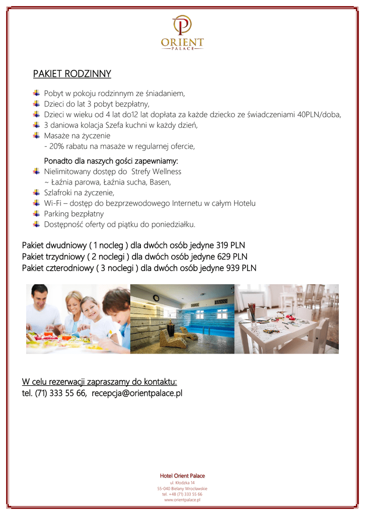 PAKIET RODZINNY Pobyt w pokoju rodzinnym ze śniadaniem, Dzieci do lat 3 pobyt bezpłatny, Dzieci w wieku od 4 lat do12 lat dopłata za każde dziecko ze świadczeniami 40PLN/doba, 3 daniowa kolacja Szefa kuchni w każdy dzień, Masaże na życzenie - 20% rabatu na masaże w regularnej ofercie, Ponadto dla naszych gości zapewniamy: Nielimitowany dostęp do Strefy Wellness ~ Łaźnia parowa, Łaźnia sucha, Basen, Szlafroki na życzenie, Wi-Fi – dostęp do bezprzewodowego Internetu w całym Hotelu Parking bezpłatny Dostępność oferty od piątku do poniedziałku. Pakiet dwudniowy ( 1 nocleg ) dla dwóch osób jedyne 319 PLN Pakiet trzydniowy ( 2 noclegi ) dla dwóch osób jedyne 629 PLN Pakiet czterodniowy ( 3 noclegi ) dla dwóch osób jedyne 939 PLN W celu rezerwacji zapraszamy do kontaktu: tel. (71) 333 55 66, [email protected] Hotel Orient Palace ul. Kłodzka 14 55-040 Bielany Wrocławskie tel. +48 (71) 333 55 66 www.orientpalace.pl