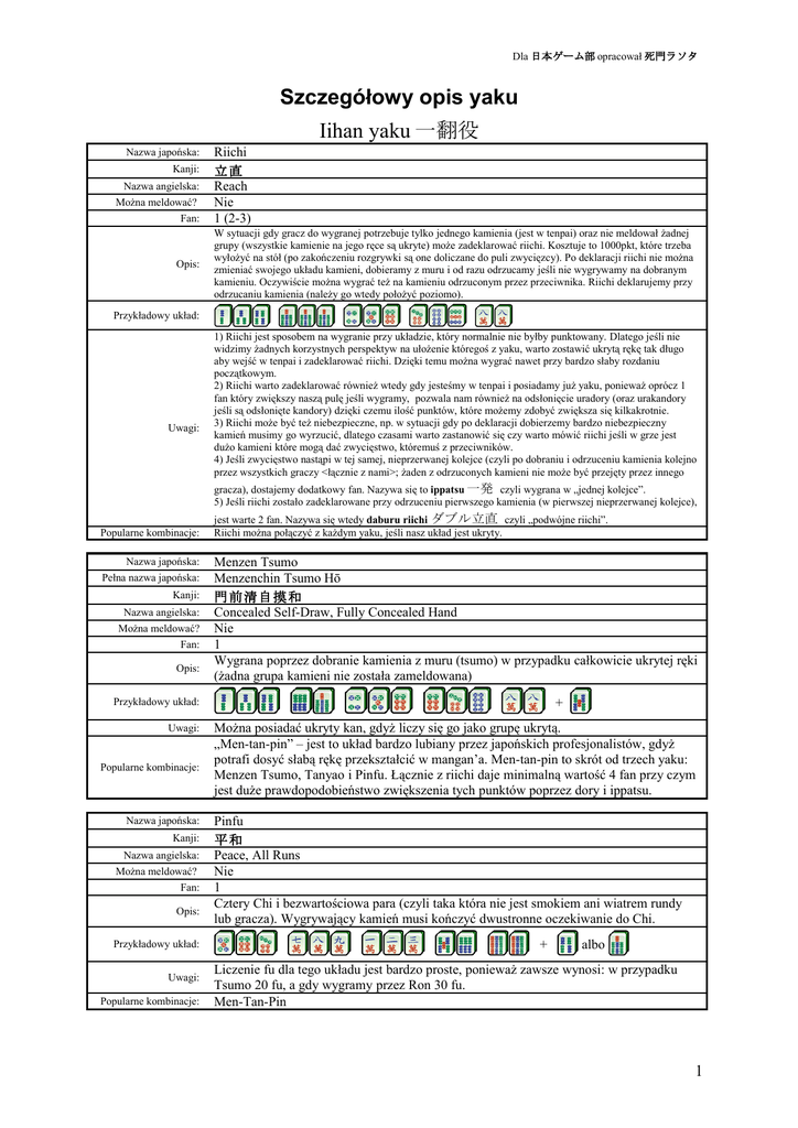 Dla 日本ゲーム部 opracował 死門ラソタ Szczegółowy opis yaku Iihan yaku 一翻役 Nazwa japońska: Kanji: Nazwa angielska: Można meldować? Fan: Opis: Riichi 立直 Reach Nie 1 (2-3) W sytuacji gdy gracz do wygranej potrzebuje tylko jednego kamienia (jest w tenpai) oraz nie meldował żadnej grupy (wszystkie kamienie na jego ręce są ukryte) może zadeklarować riichi. Kosztuje to 1000pkt, które trzeba wyłożyć na stół (po zakończeniu rozgrywki są one doliczane do puli zwycięzcy). Po deklaracji riichi nie można zmieniać swojego układu kamieni, dobieramy z muru i od razu odrzucamy jeśli nie wygrywamy na dobranym kamieniu. Oczywiście można wygrać też na kamieniu odrzuconym przez przeciwnika. Riichi deklarujemy przy odrzucaniu kamienia (należy go wtedy położyć poziomo). Przykładowy układ: Uwagi: 1) Riichi jest sposobem na wygranie przy układzie, który normalnie nie byłby punktowany. Dlatego jeśli nie widzimy żadnych korzystnych perspektyw na ułożenie któregoś z yaku, warto zostawić ukrytą rękę tak długo aby wejść w tenpai i zadeklarować riichi. Dzięki temu można wygrać nawet przy bardzo słaby rozdaniu początkowym. 2) Riichi warto zadeklarować również wtedy gdy jesteśmy w tenpai i posiadamy już yaku, ponieważ oprócz 1 fan który zwiększy naszą pulę jeśli wygramy, pozwala nam również na odsłonięcie uradory (oraz urakandory jeśli są odsłonięte kandory) dzięki czemu ilość punktów, które możemy zdobyć zwiększa się kilkakrotnie. 3) Riichi może być też niebezpieczne, np. w sytuacji gdy po deklaracji dobierzemy bardzo niebezpieczny kamień musimy go wyrzucić, dlatego czasami warto zastanowić się czy warto mówić riichi jeśli w grze jest dużo kamieni które mogą dać zwycięstwo, któremuś z przeciwników. 4) Jeśli zwycięstwo nastąpi w tej samej, nieprzerwanej kolejce (czyli po dobraniu i odrzuceniu kamienia kolejno przez wszystkich graczy <łącznie z nami>; żaden z odrzuconych kamieni nie może być przejęty przez innego gracza), dostajemy dodatkowy fan. Nazywa się to ippatsu 一発 czyli wygrana w „jednej kolejce”. 5) Jeśli riichi zostało zadeklarowane przy odrzuceniu pierwszego kamienia (w pierwszej nieprzerwanej kolejce), Popularne kombinacje: Nazwa japońska: Pełna nazwa japońska: Kanji: Nazwa angielska: Można meldować? Fan: Opis: jest warte 2 fan. Nazywa się wtedy daburu riichi ダブル立直 czyli „podwójne riichi”. Riichi można połączyć z każdym yaku, jeśli nasz układ jest ukryty. Menzen Tsumo Menzenchin Tsumo Hō 門 前清自摸和 Concealed Self-Draw, Fully Concealed Hand Nie 1 Wygrana poprzez dobranie kamienia z muru (tsumo) w przypadku całkowicie ukrytej ręki (żadna grupa kamieni nie została zameldowana) + Przykładowy układ: Uwagi: Popularne kombinacje: Nazwa japońska: Kanji: Nazwa angielska: Można meldować? Fan: Opis: Przykładowy układ: Uwagi: Popularne kombinacje: Można posiadać ukryty kan, gdyż liczy się go jako grupę ukrytą. „Men-tan-pin” – jest to układ bardzo lubiany przez japońskich profesjonalistów, gdyż potrafi dosyć słabą rękę przekształcić w mangan’a. Men-tan-pin to skrót od trzech yaku: Menzen Tsumo, Tanyao i Pinfu. Łącznie z riichi daje minimalną wartość 4 fan przy czym jest duże prawdopodobieństwo zwiększenia tych punktów poprzez dory i ippatsu. Pinfu 平和 Peace, All Runs Nie 1 Cztery Chi i bezwartościowa para (czyli taka która nie jest smokiem ani wiatrem rundy lub gracza). Wygrywający kamień musi kończyć dwustronne oczekiwanie do Chi. + albo Liczenie fu dla tego układu jest bardzo proste, ponieważ zawsze wynosi: w przypadku Tsumo 20 fu, a gdy wygramy przez Ron 30 fu. Men-Tan-Pin 1 Dla 日本ゲーム部 opracował 死門ラソタ Nazwa japońska: Kanji: Nazwa angielska: Nazwa polska: Można meldować? Fan: Opis: Iipeikō 一 盃口 Pure Double Chow, Double-Run Dwa takie same Chi Nie 1 Dwa takie same Chi z jednej rodziny. Przykładowy układ: Uwagi: Popularne kombinacje: Nazwa japońska: Pełna nazwa japońska: Kanji: Nazwa angielska: Nazwa polska: Można meldować? Fan: Opis: Inne kamienie mogą tworzyć dowolne grupy jednak wszystkie musza być ukryte. Iipeikō + Pinfu, Iipeikō + Tanyao Tanyao Tanyaochū 断 幺九 All Simples, Inside Hand, Two thru Eight Same Zwykłe Tak 1 Wszystkie grupy oraz para składają się z kamieni zwykłych (chunchanpai). Przykładowy układ: Uwagi: Popularne kombinacje: Nazwa japońska: Kanji: Nazwa angielska: Można meldować? Fan: Opis: Nazwę tego układu można przetłumaczyć jako „Bez Yaochūpai” (czyli kamieni skrajnych i specjalnych) Men-Tan-Pin Fanpai, Yakuhai 翻牌 Value Tiles Tak 1 Pon/Kan ze smoków, wiatru gracza lub wiatru rundy. Przykładowy układ: Uwagi: Nazwa japońska: Pełna nazwa japońska: Kanji: Nazwa angielska: Można meldować? Fan: Opis: Uwagi: Gracz, który jest wiatrem wschodnim w pierwszej rundzie lub południowym w drugiej rundzie za Pon ze swojego wiatru otrzymuje 2 fan. Rinshan Rinshan Kaihō 嶺 上開花 After a Kong, King’s Tile Draw Tak 1 Wygrana przy dobraniu kamienia z martwego muru (po zadeklarowaniu Kan). 1) Liczy się jako Tsumo, lecz jeśli Kan został zrobiony z kamienia odrzuconego przez innego gracza (a nie dobranego przez nas samych) to punkty nie są wypłacane przez wszystkich, lecz właśnie tego jednego gracza. 2) Nawet jeśli kamień, który dobieramy z martwego muru znajduje się w naszej puli odrzuconych (furiten) to zwycięstwo jest uznane. 2 Dla 日本ゲーム部 opracował 死門ラソタ Nazwa japońska: Kanji: Nazwa angielska: Można meldować? Fan: Opis: Uwagi: Nazwa japońska: Pełna nazwa japońska: Kanji: Nazwa angielska: Można meldować? Fan: Opis: Uwagi: Nazwa japońska: Pełna nazwa japońska: Kanji: Nazwa angielska: Można meldować? Fan: Opis: Uwagi: Chan Kan 槍槓 Robbing a Kong, Add-a-Quad Win Tak 1 Wygrana w momencie gdy któryś z graczy ulepsza zameldowany Pon w Kan kamieniem, k
