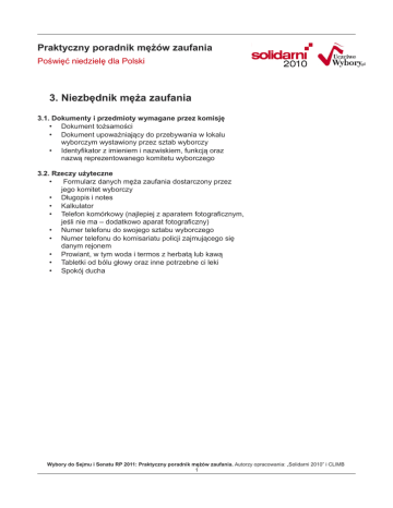 Praktyczny poradnik mężów zaufania Poświęć niedzielę dla Polski 3. Niezbędnik męża zaufania 3.1. Dokumenty i przedmioty wymagane przez komisję • Dokument tożsamości • Dokument upoważniający do przebywania w lokalu wyborczym wystawiony przez sztab wyborczy • Identyfikator z imieniem i nazwiskiem, funkcją oraz nazwą reprezentowanego komitetu wyborczego 3.2. Rzeczy użyteczne • Formularz danych męża zaufania dostarczony przez jego komitet wyborczy • Długopis i notes • Kalkulator • Telefon komórkowy (najlepiej z aparatem fotograficznym, jeśli nie ma – dodatkowo aparat fotograficzny) • Numer telefonu do swojego sztabu wyborczego • Numer telefonu do komisariatu policji zajmującego się danym rejonem • Prowiant, w tym woda i termos z herbatą lub kawą • Tabletki od bólu głowy oraz inne potrzebne ci leki • Spokój ducha Wybory do Sejmu i Senatu RP 2011: Praktyczny poradnik mężów zaufania. Autorzy opracowania: „Solidarni 2010” i CLIMB 1