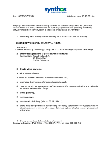 l.dz. 287/TZ/DW/2014 Oświęcim, dnia 16.10.2014 r. Dotyczy: zaproszenie do złożenia oferty cenowej na dostawę urządzenia dla „Instalacji doświadczalnej w skali półtechnicznej do syntezy półproduktów do produkcji substancji aktywnych środków ochrony roślin o zdolności produkcyjnej ok. 150 t/rok” 1. Zwracamy się z prośbą o złożenie oferty techniczno - cenowej na dostawę: ZBIORNIKÓW CHLORKU SULFURYLU (2 SZT.) w oparciu o: • Zakres techniczny stanowiący Załącznik nr 2 do niniejszego zapytania ofertowego. 2. Strony zaangażowane w postępowanie ofertowe: Zamawiający: firma Synthos S.A. Ul. Chemików 1 32-600 Oświęcim 3. Oferta winna zawierać: a) pełną nazwę oferenta, b) adres lub siedzibę oferenta, numer telefonu oraz NIP, c) informacje techniczne o oferowanych urządzeniach, d) cenę w rozbiciu na: cena poszczególnych elementów (w przypadku kiedy urządzenia są jednym z elementów oferty) e) okres gwarancji, f) termin dostawy, g) termin ważności oferty (min. do 30.11.2014 r. ), h) oferta musi być podpisana przez osobę lub osoby uprawnione do występowania w obrocie prawnym w imieniu oferenta, podpis musi być czytelny lub opisany pieczęciami imiennymi, 4. Osoby uprawnione do kontaktów z oferentami: Sprawy techniczne - Piotr Paleń – Tel. 33 847 47 75, tel. kom. 665 360 147 5.Ofertę – należy złożyć w terminie do 30.10.2014r. do godz. 16:00 w formie elektronicznej na adres [email protected] lub w zamkniętej kopercie na adres: Synthos S.A., przy ul. Chemików 1, 32-600 Oświęcim, Dział Zakupów Technicznych budynek E-119, pokój nr 17 z napisem: L.dz. 287/TZ/DW/2014 oferta – ,, ZBIORNIKI CHLORKU SULFURYLU ” nie otwierać 6. Postępowanie ofertowe prowadzone będzie wg procedur własnych Zamawiającego. 7. Po rozpatrzeniu ofert o decyzji Zamawiającego oferenci zostaną powiadomieni pisemnie. 8. Umowa zostanie zawarta z wybranym kontrahentem. 9. Koszt przygotowania oferty ponosi wyłącznie oferent. 10. Zamawiającemu przysługuje prawo do swobodnego wyboru oferty. 11. Z tytułu nieuwzględnienia ofert, oferentom nie przysługują żadne roszczenia przeciwko Zamawiającemu. 12. W razie nieuwzględnienia żadnej z ofert, Zamawiający zastrzega sobie możliwość negocjacji z wybranym oferentem. 13. Kryteria oceny ofert: • • • 50 % - cena 40 % - termin realizacji 10 % - gwarancja i warunki serwisowania 14. Dopuszcza się złożenie ofert na urządzenia używane. Prosimy o potwierdzenie gotowości do złożenia oferty cenowej telefonicznie 33/847 22 08 lub e-mail [email protected] Załączniki: - załącznik nr 1 - warunki handlowe - załącznik nr 2 – zakres techniczny Załącznik nr 1 Warunki handlowe dot. zapytania ofertowego nr 287/TZ/DW/2014 l.dz. 1. 2. 3. Wymagania Synthos SA Numer oferty ( wypełnić ) Oferta ważna do dnia ( wypełnić ) Cena Waluta Uwagi/zmiany wprowadzone przez Wykonawcę 30.11.2014 PLN/EUR/USD 4. Termin płatności faktur 5. 6. Sugerowane 60 dni od dnia wpływu faktury do zamawiającego (faktura wystawiona na podstawie podpisanego protokołu odbioru) Gwarancja ( wypełnić ) Termin realizacji 7.. 7 tygodni od daty otrzymania informacji o zamówieniu Załącznik nr 2 do zapytania ofertowego nr 287/TZ/DW/2014 Zbiornik chlorku sulfurylu (2 sztuki) typ aparatu Zbiornik pojemność V= 1 m3 materiał konstrukcyjny stal węglowa emaliowana izolacja bez izolacji parametry dopuszczalne PS = -1/+6 bar TS = -25/+200ºC króćce wyposażenie i wymagania dodatkowe inne na górnej dennicy: DN 100 (4 sztuki), DN 150 (1 sztuka), DN 200 (1 sztuka), DN 450 (z otwieraną pokrywą), na dolnej dennicy: DN 100 (spustowy) 1. Zawór spustowy manualny DN100 wykładany PTFE 2. Dokumentacja techniczna umożliwiająca odbiór przez Urząd Dozoru Technicznego Dopuszcza się składanie ofert na urządzenia używane, po renowacji (z dokumentacją techniczną umożliwiającą odbiór przez Urząd Dozoru Technicznego)
