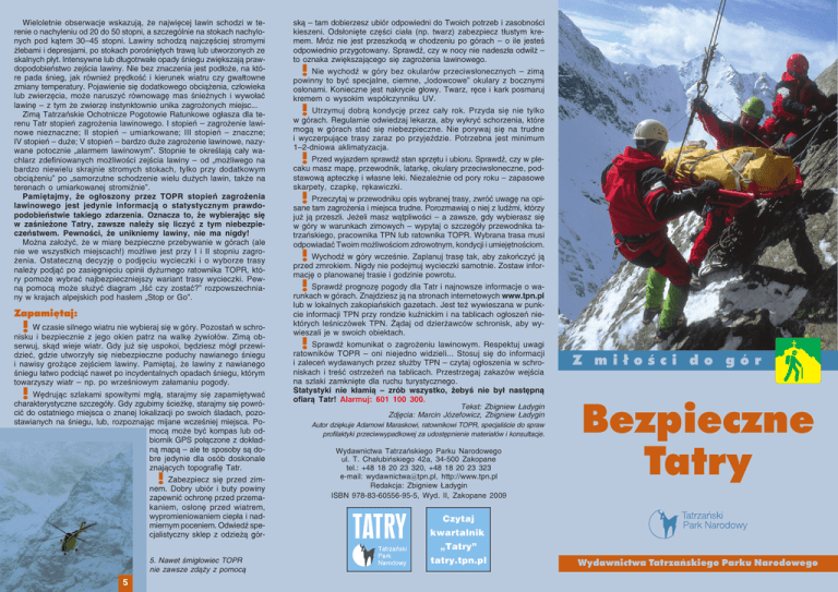 Wieloletnie obserwacje wskazują, że najwięcej lawin schodzi w te− renie o nachyleniu od 20 do 50 stopni, a szczególnie na stokach nachylo− nych pod kątem 30–45 stopni. Lawiny schodzą najczęściej stromymi żlebami i depresjami, po stokach porośniętych trawą lub utworzonych ze skalnych płyt. Intensywne lub długotrwałe opady śniegu zwiększają praw− dopodobieństwo zejścia lawiny. Nie bez znaczenia jest podłoże, na któ− re pada śnieg, jak również prędkość i kierunek wiatru czy gwałtowne zmiany temperatury. Pojawienie się dodatkowego obciążenia, człowieka lub zwierzęcia, może naruszyć równowagę mas śnieżnych i wywołać lawinę – z tym że zwierzę instynktownie unika zagrożonych miejsc... Zimą Tatrzańskie Ochotnicze Pogotowie Ratunkowe ogłasza dla te− renu Tatr stopień zagrożenia lawinowego. I stopień – zagrożenie lawi− nowe nieznaczne; II stopień – umiarkowane; III stopień – znaczne; IV stopień – duże; V stopień – bardzo duże zagrożenie lawinowe, nazy− wane potocznie „alarmem lawinowym”. Stopnie te określają cały wa− chlarz zdefiniowanych możliwości zejścia lawiny – od „możliwego na bardzo niewielu skrajnie stromych stokach, tylko przy dodatkowym obciążeniu” po „samorzutne schodzenie wielu dużych lawin, także na terenach o umiarkowanej stromiźnie”. Pamiętajmy, że ogłoszony przez TOPR stopień zagrożenia lawinowego jest jedynie informacją o statystycznym prawdo− podobieństwie takiego zdarzenia. Oznacza to, że wybierając się w zaśnieżone Tatry, zawsze należy się liczyć z tym niebezpie− czeństwem. Pewności, że unikniemy lawiny, nie ma nigdy! Można założyć, że w miarę bezpieczne przebywanie w górach (ale nie we wszystkich miejscach!) możliwe jest przy I i II stopniu zagro− żenia. Ostateczną decyzję o podjęciu wycieczki i o wyborze trasy należy podjąć po zasięgnięciu opinii dyżurnego ratownika TOPR, któ− ry pomoże wybrać najbezpieczniejszy wariant trasy wycieczki. Pew− ną pomocą może służyć diagram „Iść czy zostać?” rozpowszechnia− ny w krajach alpejskich pod hasłem „Stop or Go”. ską – tam dobierzesz ubiór odpowiedni do Twoich potrzeb i zasobności kieszeni. Odsłonięte części ciała (np. twarz) zabezpiecz tłustym kre− mem. Mróz nie jest przeszkodą w chodzeniu po górach – o ile jesteś odpowiednio przygotowany. Sprawdź, czy w nocy nie nadeszła odwilż – to oznaka zwiększającego się zagrożenia lawinowego. ! Nie wychodź w góry bez okularów przeciwsłonecznych – zimą powinny to być specjalne, ciemne, „lodowcowe” okulary z bocznymi osłonami. Konieczne jest nakrycie głowy. Twarz, ręce i kark posmaruj kremem o wysokim współczynniku UV. ! Utrzymuj dobrą kondycję przez cały rok. Przyda się nie tylko w górach. Regularnie odwiedzaj lekarza, aby wykryć schorzenia, które mogą w górach stać się niebezpieczne. Nie porywaj się na trudne i wyczerpujące trasy zaraz po przyjeździe. Potrzebna jest minimum 1–2−dniowa aklimatyzacja. ! Przed wyjazdem sprawdź stan sprzętu i ubioru. Sprawdź, czy w ple− caku masz mapę, przewodnik, latarkę, okulary przeciwsłoneczne, pod− stawową apteczkę i własne leki. Niezależnie od pory roku – zapasowe skarpety, czapkę, rękawiczki. ! Przeczytaj w przewodniku opis wybranej trasy, zwróć uwagę na opi− sane tam zagrożenia i miejsca trudne. Porozmawiaj o niej z ludźmi, którzy już ją przeszli. Jeżeli masz wątpliwości – a zawsze, gdy wybierasz się w góry w warunkach zimowych – wypytaj o szczegóły przewodnika ta− trzańskiego, pracownika TPN lub ratownika TOPR. Wybrana trasa musi odpowiadać Twoim możliwościom zdrowotnym, kondycji i umiejętnościom. ! Wychodź w góry wcześnie. Zaplanuj trasę tak, aby zakończyć ją przed zmrokiem. Nigdy nie podejmuj wycieczki samotnie. Zostaw infor− mację o planowanej trasie i godzinie powrotu. ! ! Sprawdź prognozę pogody dla Tatr i najnowsze informacje o wa− runkach w górach. Znajdziesz ją na stronach internetowych www.tpn.pl lub w lokalnych zakopiańskich gazetach. Jest też wywieszana w punk− cie informacji TPN przy rondzie kuźnickim i na tablicach ogłoszeń nie− których leśniczówek TPN. Żądaj od dzierżawców schronisk, aby wy− wieszali je w swoich obiektach. ! Sprawdź komunikat o zagrożeniu lawinowym. Respektuj uwagi ratowników TOPR – oni niejedno widzieli... Stosuj się do informacji i zaleceń wydawanych przez służby TPN – czytaj ogłoszenia w schro− niskach i treść ostrzeżeń na tablicach. Przestrzegaj zakazów wejścia na szlaki zamknięte dla ruchu turystycznego. Statystyki nie kłamią – zrób wszystko, żebyś nie był następną ofiarą Tatr! Alarmuj: 601 100 300. Zapamiętaj: W czasie silnego wiatru nie wybieraj się w góry. Pozostań w schro− nisku i bezpiecznie z jego okien patrz na walkę żywiołów. Zimą ob− serwuj, skąd wieje wiatr. Gdy już się uspokoi, będziesz mógł przewi− dzieć, gdzie utworzyły się niebezpieczne poduchy nawianego śniegu i nawisy grożące zejściem lawiny. Pamiętaj, że lawiny z nawianego śniegu łatwo podciąć nawet po incydentalnych opadach śniegu, którym towarzyszy wiatr – np. po wrześniowym załamaniu pogody. Wędrując szlakami spowitymi mgłą, starajmy się zapamiętywać charakterystyczne szczegóły. Gdy zgubimy ścieżkę, starajmy się powró− cić do ostatniego miejsca o znanej lokalizacji po swoich śladach, pozo− stawianych na śniegu, lub, rozpoznając mijane wcześniej miejsca. Po− mocą może być kompas lub od− biornik GPS połączone z dokład− ną mapą – ale te sposoby są do− bre jedynie dla osób doskonale znających topografię Tatr. ! Zabezpiecz się przed zim− nem. Dobry ubiór i buty powiny zapewnić ochronę przed przema− kaniem, osłonę przed wiatrem, wypromieniowaniem ciepła i nad− miernym poceniem. Odwiedź spe− cjalistyczny s