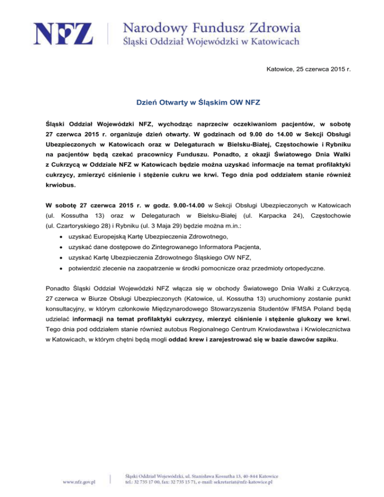Katowice, 25 czerwca 2015 r. Dzień Otwarty w Śląskim OW NFZ Śląski Oddział Wojewódzki NFZ, wychodząc naprzeciw oczekiwaniom pacjentów, w sobotę 27 czerwca 2015 r. organizuje dzień otwarty. W godzinach od 9.00 do 14.00 w Sekcji Obsługi Ubezpieczonych w Katowicach oraz w Delegaturach w Bielsku-Białej, Częstochowie i Rybniku na pacjentów będą czekać pracownicy Funduszu. Ponadto, z okazji Światowego Dnia Walki z Cukrzycą w Oddziale NFZ w Katowicach będzie można uzyskać informacje na temat profilaktyki cukrzycy, zmierzyć ciśnienie i stężenie cukru we krwi. Tego dnia pod oddziałem stanie również krwiobus. W sobotę 27 czerwca 2015 r. w godz. 9.00-14.00 w Sekcji Obsługi Ubezpieczonych w Katowicach (ul. Kossutha 13) oraz w Delegaturach w Bielsku-Białej (ul. Karpacka 24), Częstochowie (ul. Czartoryskiego 28) i Rybniku (ul. 3 Maja 29) będzie można m.in.:  uzyskać Europejską Kartę Ubezpieczenia Zdrowotnego,  uzyskać dane dostępowe do Zintegrowanego Informatora Pacjenta,  uzyskać Kartę Ubezpieczenia Zdrowotnego Śląskiego OW NFZ,  potwierdzić zlecenie na zaopatrzenie w środki pomocnicze oraz przedmioty ortopedyczne. Ponadto Śląski Oddział Wojewódzki NFZ włącza się w obchody Światowego Dnia Walki z Cukrzycą. 27 czerwca w Biurze Obsługi Ubezpieczonych (Katowice, ul. Kossutha 13) uruchomiony zostanie punkt konsultacyjny, w którym członkowie Międzynarodowego Stowarzyszenia Studentów IFMSA Poland będą udzielać informacji na temat profilaktyki cukrzycy, mierzyć ciśnienie i stężenie glukozy we krwi. Tego dnia pod oddziałem stanie również autobus Regionalnego Centrum Krwiodawstwa i Krwiolecznictwa w Katowicach, w którym chętni będą mogli oddać krew i zarejestrować się w bazie dawców szpiku.