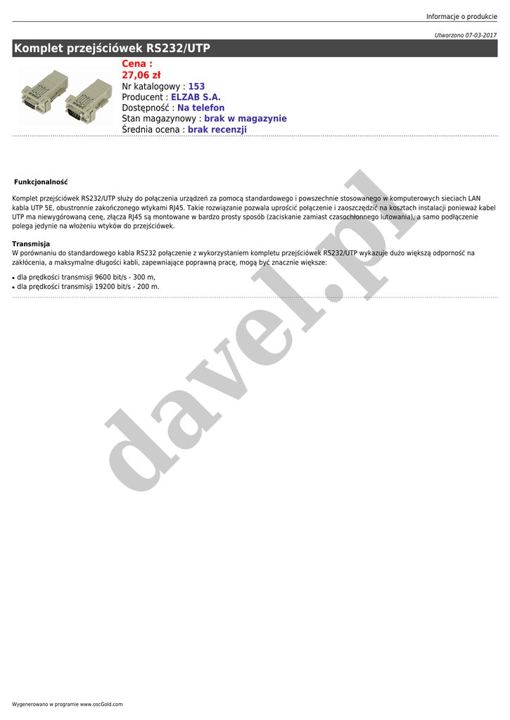 Informacje o produkcie Utworzono 07-03-2017 Komplet przejściówek RS232/UTP Cena : 27,06 zł Nr katalogowy : 153 Producent : ELZAB S.A. Dostępność : Na telefon Stan magazynowy : brak w magazynie Średnia ocena : brak recenzji Funkcjonalność l Komplet przejściówek RS232/UTP służy do połączenia urządzeń za pomocą standardowego i powszechnie stosowanego w komputerowych sieciach LAN kabla UTP 5E, obustronnie zakończonego wtykami RJ45. Takie rozwiązanie pozwala uprościć połączenie i zaoszczędzić na kosztach instalacji ponieważ kabel UTP ma niewygórowaną cenę, złącza RJ45 są montowane w bardzo prosty sposób (zaciskanie zamiast czasochłonnego lutowania), a samo podłączenie polega jedynie na włożeniu wtyków do przejściówek. ● dla prędkości transmisji 9600 bit/s - 300 m, dla prędkości transmisji 19200 bit/s - 200 m. da ve l ● .p Transmisja W porównaniu do standardowego kabla RS232 połączenie z wykorzystaniem kompletu przejściówek RS232/UTP wykazuje dużo większą odporność na zakłócenia, a maksymalne długości kabli, zapewniające poprawną pracę, mogą być znacznie większe: Wygenerowano w programie www.oscGold.com