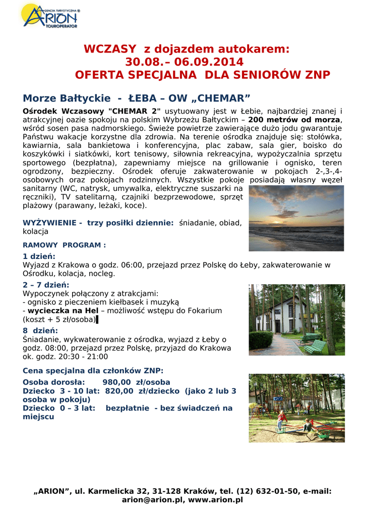 WCZASY z dojazdem autokarem: 30.08.– 06.09.2014 OFERTA SPECJALNA DLA SENIORÓW ZNP Morze Bałtyckie - ŁEBA – OW „CHEMAR” Ośrodek Wczasowy "CHEMAR 2" usytuowany jest w Łebie, najbardziej znanej i atrakcyjnej oazie spokoju na polskim Wybrzeżu Bałtyckim – 200 metrów od morza, wśród sosen pasa nadmorskiego. Świeże powietrze zawierające dużo jodu gwarantuje Państwu wakacje korzystne dla zdrowia. Na terenie ośrodka znajduje się: stołówka, kawiarnia, sala bankietowa i konferencyjna, plac zabaw, sala gier, boisko do koszykówki i siatkówki, kort tenisowy, siłownia rekreacyjna, wypożyczalnia sprzętu sportowego (bezpłatna), zapewniamy miejsce na grillowanie i ognisko, teren ogrodzony, bezpieczny. Ośrodek oferuje zakwaterowanie w pokojach 2-,3-,4osobowych oraz pokojach rodzinnych. Wszystkie pokoje posiadają własny węzeł sanitarny (WC, natrysk, umywalka, elektryczne suszarki na ręczniki), TV satelitarną, czajniki bezprzewodowe, sprzęt plażowy (parawany, leżaki, koce). WYŻYWIENIE - trzy posiłki dziennie: śniadanie, obiad, kolacja RAMOWY PROGRAM : 1 dzień: Wyjazd z Krakowa o godz. 06:00, przejazd przez Polskę do Łeby, zakwaterowanie w Ośrodku, kolacja, nocleg. 2 – 7 dzień: Wypoczynek połączony z atrakcjami: - ognisko z pieczeniem kiełbasek i muzyką - wycieczka na Hel – możliwość wstępu do Fokarium (koszt + 5 zł/osoba) 8 dzień: Śniadanie, wykwaterowanie z ośrodka, wyjazd z Łeby o godz. 08:00, przejazd przez Polskę, przyjazd do Krakowa ok. godz. 20:30 - 21:00 Cena specjalna dla członków ZNP: Osoba dorosła: 980,00 zł/osoba Dziecko 3 - 10 lat: 820,00 zł/dziecko (jako 2 lub 3 osoba w pokoju) Dziecko 0 – 3 lat: bezpłatnie - bez świadczeń na miejscu „ARION”, ul. Karmelicka 32, 31-128 Kraków, tel. (12) 632-01-50, e-mail: [email protected], www.arion.pl WCZASY z dojazdem autokarem: 30.08.– 06.09.2014 OFERTA SPECJALNA DLA SENIORÓW ZNP CENA ZAWIERA: - przejazd autokarem klasy LUX z Krakowa - opłaty drogowe na trasie przejazdu - zakwaterowanie - 7 noclegów w pokojach z łazienkami - opłatę klimatyczną - 7 śniadań w formie bufetu - 7 obiadów serwowanych - 7 kolacji serwowanych - atrakcje i wycieczki według programu - sprzęt plażowy - ubezpieczenie NNW do 5000 zł - podatek VAT WAŻNE INFORMACJE: • cena nie zawiera świadczeń nie wymienionych w ofercie. „ARION”, ul. Karmelicka 32, 31-128 Kraków, tel. (12) 632-01-50, e-mail: [email protected], www.arion.pl