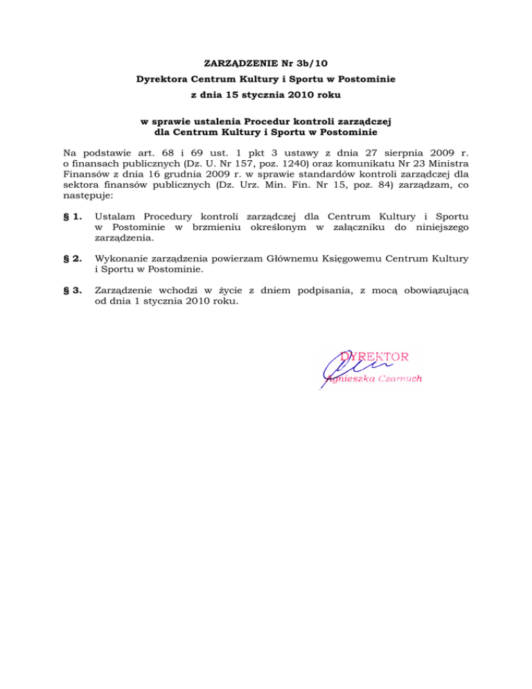ZARZĄDZENIE Nr 3b/10 Dyrektora Centrum Kultury i Sportu w