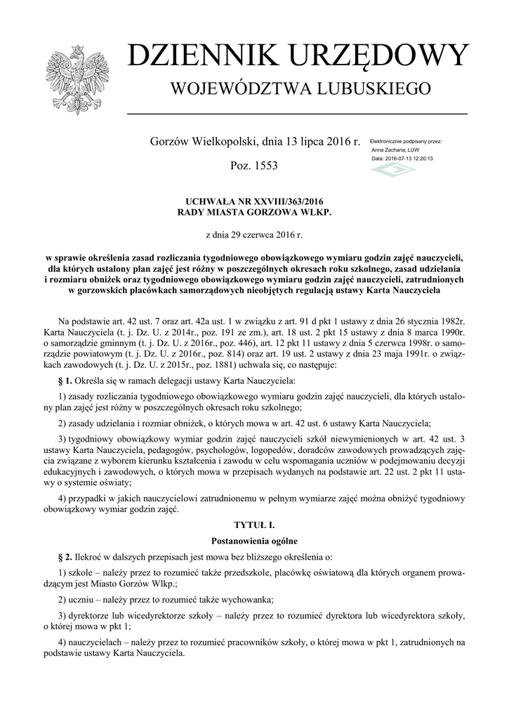 DZIENNIK URZĘDOWY WOJEWÓDZTWA LUBUSKIEGO Gorzów Wielkopolski, dnia 13 lipca 2016 r. Elektronicznie podpisany przez: Anna Zacharia; LUW Poz. 1553 Data: 2016-07-13 12:20:13 UCHWAŁA NR XXVIII/363/2016 RADY MIASTA GORZOWA WLKP. z dnia 29 czerwca 2016 r. w sprawie określenia zasad rozliczania tygodniowego obowiązkowego wymiaru godzin zajęć nauczycieli, dla których ustalony plan zajęć jest różny w poszczególnych okresach roku szkolnego, zasad udzielania i rozmiaru obniżek oraz tygodniowego obowiązkowego wymiaru godzin zajęć nauczycieli, zatrudnionych w gorzowskich placówkach samorządowych nieobjętych regulacją ustawy Karta Nauczyciela Na podstawie art. 42 ust. 7 oraz art. 42a ust. 1 w związku z art. 91 d pkt 1 ustawy z dnia 26 stycznia 1982r. Karta Nauczyciela (t. j. Dz. U. z 2014r., poz. 191 ze zm.), art. 18 ust. 2 pkt 15 ustawy z dnia 8 marca 1990r. o samorządzie gminnym (t. j. Dz. U. z 2016r., poz. 446), art. 12 pkt 11 ustawy z dnia 5 czerwca 1998r. o samorządzie powiatowym (t. j. Dz. U. z 2016r., poz. 814) oraz art. 19 ust. 2 ustawy z dnia 23 maja 1991r. o związkach zawodowych (t. j. Dz. U. z 2015r., poz. 1881) uchwala się, co następuje: § 1. Określa się w ramach delegacji ustawy Karta Nauczyciela: 1) zasady rozliczania tygodniowego obowiązkowego wymiaru godzin zajęć nauczycieli, dla których ustalony plan zajęć jest różny w poszczególnych okresach roku szkolnego; 2) zasady udzielania i rozmiar obniżek, o których mowa w art. 42 ust. 6 ustawy Karta Nauczyciela; 3) tygodniowy obowiązkowy wymiar godzin zajęć nauczycieli szkół niewymienionych w art. 42 ust. 3 ustawy Karta Nauczyciela, pedagogów, psychologów, logopedów, doradców zawodowych prowadzących zajęcia związane z wyborem kierunku kształcenia i zawodu w celu wspomagania uczniów w podejmowaniu decyzji edukacyjnych i zawodowych, o których mowa w przepisach wydanych na podstawie art. 22 ust. 2 pkt 11 ustawy o systemie oświaty; 4) przypadki w jakich nauczycielowi zatrudnionemu w pełnym wymiarze zajęć można obniżyć tygodniowy obowiązkowy wymiar godzin zajęć. TYTUŁ I. Postanowienia ogólne § 2. Ilekroć w dalszych przepisach jest mowa bez bliższego określenia o: 1) szkole – należy przez to rozumieć także przedszkole, placówkę oświatową dla których organem prowadzącym jest Miasto Gorzów Wlkp.; 2) uczniu – należy przez to rozumieć także wychowanka; 3) dyrektorze lub wicedyrektorze szkoły – należy przez to rozumieć dyrektora lub wicedyrektora szkoły, o której mowa w pkt 1; 4) nauczycielach – należy przez to rozumieć pracowników szkoły, o której mowa w pkt 1, zatrudnionych na podstawie ustawy Karta Nauczyciela. Dziennik Urzędowy Województwa Lubuskiego –2– Poz. 1553 TYTUŁ II. Zasady rozliczania tygodniowego, obowiązkowego wymiaru godzin zajęć nauczycieli, dla których ustalony plan zajęć jest różny w poszczególnych okresach roku szkolnego § 3. 1. Nauczyciele zatrudnieni w pełnym wymiarze zajęć, dla których ustalony plan zajęć w pewnych okresach roku szkolnego nie wyczerpuje obowiązkowego tygodniowego wymiaru godzin zajęć dydaktycznych, zgodnie z art. 42 ust. 5b Karty Nauczyciela zobowiązani są do realizowania w innych okresach danego roku szkolnego, odpowiednio większej liczby godzin tak, aby średni wymiar zajęć nauczyciela w ciągu całego roku szkolnego odpowiadał obowiązkowemu wymiarowi zajęć. 2. Praca wykonywana przez nauczycieli, o których mowa w ust. 1, zgodnie z tak ustalonym planem zajęć, w okresach realizacji zwiększonego wymiaru godzin zajęć nie jest pracą wykonywaną w godzinach ponadwymiarowych. 3. Okresem rozliczeniowym czasu pracy nauczycieli, o których mowa w ust. 1 jest rok szkolny. § 4. 1. Liczbę godzin ponadwymiarowych ustala się jako różnicę pomiędzy roczną liczbą godzin zajęć przydzieloną nauczycielowi w planie organizacyjnym na dany rok szkolny, a roczną liczbą godzin wynikającą z realizacji obowiązkowego tygodniowego wymiaru godzin zajęć. 2. Dla nauczycieli zatrudnionych w niepełnym wymiarze zajęć, realizujących różny wymiar zajęć w poszczególnych okresach roku szkolnego, w umowie o pracę należy określić średni wymiar godzin zajęć dla całego okresu zatrudnienia. § 5. W przypadku rozwiązania z nauczycielem stosunku pracy przed upływem roku szkolnego, dla którego został ustalony różny plan zajęć, rozliczenie z przydzielonych w planie organizacyjnym godzin zajęć następuje z datą ustania stosunku pracy, z tym że za wszystkie przepracowane miesiące, bez względu na wymiar zrealizowanych zajęć, przysługuje nauczycielowi prawo do wynagrodzenia zasadniczego za obowiązkowy, tygodniowy wymiar godzin zajęć, a także za przepracowane w tym czasie godziny ponadwymiarowe. § 6. 1. Rozliczenie tygodniowego obowiązkowego wymiaru godzin zajęć nauczycieli, o których mowa w § 3 ust. 1 oraz godzin ponadwymiarowych przeprowadza się wg następującej procedury: 1) tworzy się harmonogram realizacji zajęć zaplanowanych w roku szkolnym obejmujący wszystkie tygodnie nauki, w oparciu o plan organizacyjny na dany rok szkolny; 2) dla każdego tygodnia ujętego w harmonogramie wyznacza się planowaną dla nauczyciela liczbę godzin oraz różnicę pomiędzy zaplanowaną liczbą godzin, a tygodniowym obowiązkowym wymiarem godzin zajęć; różnice te mogą przyjmować wartości dodatnie i ujemne; 3) wyznacza się liczbę godzin brakujących do wypracowania tygodniowego obowiązkowego wymiaru godzin zajęć w skali roku szkolnego (liczba GBR), poprzez zsumowanie różnic w tych tygodniach, w których przyjęły one wartości ujemne; 4) poczynając od pierwszego tygodnia nauki, w którym różnica pomiędzy liczbą zrealizowanych godzin, a tygodniowym obowiązkowym wymiarem godzin zajęć przyjmuje wartość dodatnią, odejmuje się tę różnicę od liczby GBR; 5) w kolejnych tygodniach procedurę powtarza się do momentu, aż liczba GBR osiągnie wa