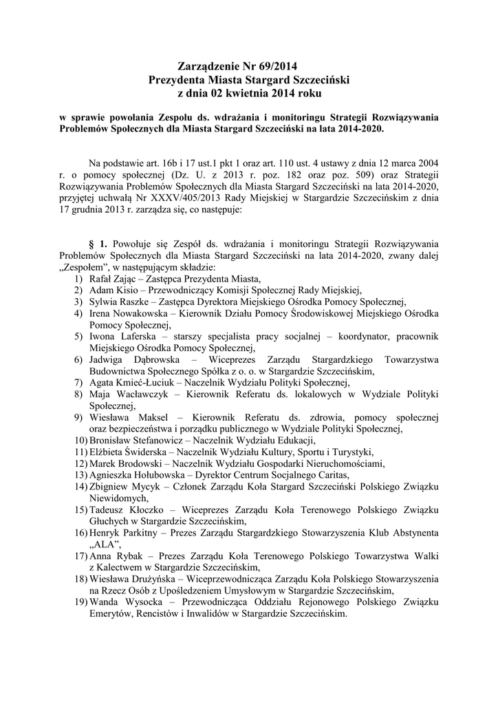 Zarządzenie Nr 69/2014 Prezydenta Miasta Stargard Szczeciński z dnia 02 kwietnia 2014 roku w sprawie powołania Zespołu ds. wdrażania i monitoringu Strategii Rozwiązywania Problemów Społecznych dla Miasta Stargard Szczeciński na lata 2014-2020. Na podstawie art. 16b i 17 ust.1 pkt 1 oraz art. 110 ust. 4 ustawy z dnia 12 marca 2004 r. o pomocy społecznej (Dz. U. z 2013 r. poz. 182 oraz poz. 509) oraz Strategii Rozwiązywania Problemów Społecznych dla Miasta Stargard Szczeciński na lata 2014-2020, przyjętej uchwałą Nr XXXV/405/2013 Rady Miejskiej w Stargardzie Szczecińskim z dnia 17 grudnia 2013 r. zarządza się, co następuje: § 1. Powołuje się Zespół ds. wdrażania i monitoringu Strategii Rozwiązywania Problemów Społecznych dla Miasta Stargard Szczeciński na lata 2014-2020, zwany dalej „Zespołem”, w następującym składzie: 1) Rafał Zając – Zastępca Prezydenta Miasta, 2) Adam Kisio – Przewodniczący Komisji Społecznej Rady Miejskiej, 3) Sylwia Raszke – Zastępca Dyrektora Miejskiego Ośrodka Pomocy Społecznej, 4) Irena Nowakowska – Kierownik Działu Pomocy Środowiskowej Miejskiego Ośrodka Pomocy Społecznej, 5) Iwona Laferska – starszy specjalista pracy socjalnej – koordynator, pracownik Miejskiego Ośrodka Pomocy Społecznej, 6) Jadwiga Dąbrowska – Wiceprezes Zarządu Stargardzkiego Towarzystwa Budownictwa Społecznego Spółka z o. o. w Stargardzie Szczecińskim, 7) Agata Kmieć-Łuciuk – Naczelnik Wydziału Polityki Społecznej, 8) Maja Wacławczyk – Kierownik Referatu ds. lokalowych w Wydziale Polityki Społecznej, 9) Wiesława Maksel – Kierownik Referatu ds. zdrowia, pomocy społecznej oraz bezpieczeństwa i porządku publicznego w Wydziale Polityki Społecznej, 10) Bronisław Stefanowicz – Naczelnik Wydziału Edukacji, 11) Elżbieta Świderska – Naczelnik Wydziału Kultury, Sportu i Turystyki, 12) Marek Brodowski – Naczelnik Wydziału Gospodarki Nieruchomościami, 13) Agnieszka Hołubowska – Dyrektor Centrum Socjalnego Caritas, 14) Zbigniew Mycyk – Członek Zarządu Koła Stargard Szczeciński Polskiego Związku Niewidomych, 15) Tadeusz Kłoczko – Wiceprezes Zarządu Koła Terenowego Polskiego Związku Głuchych w Stargardzie Szczecińskim, 16) Henryk Parkitny – Prezes Zarządu Stargardzkiego Stowarzyszenia Klub Abstynenta „ALA”, 17) Anna Rybak – Prezes Zarządu Koła Terenowego Polskiego Towarzystwa Walki z Kalectwem w Stargardzie Szczecińskim, 18) Wiesława Drużyńska – Wiceprzewodnicząca Zarządu Koła Polskiego Stowarzyszenia na Rzecz Osób z Upośledzeniem Umysłowym w Stargardzie Szczecińskim, 19) Wanda Wysocka – Przewodnicząca Oddziału Rejonowego Polskiego Związku Emerytów, Rencistów i Inwalidów w Stargardzie Szczecińskim. § 2. 1. Pracami Zespołu kieruje Przewodniczący, którym ustanawia się Zastępcę Prezydenta Miasta Rafała Zająca. 2. Pod nieobecność Przewodniczącego pracami Zespołu kieruje inny członek Zespołu, wskazany przez Przewodniczącego. 3. Zespół podejmuje decyzje w trybie głosowania jawnego, zwykłą większością głosów. 4. Przewodniczący może zapraszać do udziału w pracach Zespołu z prawem głosu osoby spoza Zespołu, w szczególności przedstawicieli organizacji pozarządowych i instytucji zajmujących się rozwiązywaniem problemów społecznych. 5. Obsługę Zespołu zapewnia Wydział Polityki Społecznej. § 3. Zespół powinien zbierać się przynajmniej raz w roku w celu oceny poziomu realizacji przyjętych w Strategii Rozwiązywania Problemów Społecznych dla Miasta Stargard Szczeciński na lata 2014-2020 – zwanej dalej „Strategią”, celów i kierunków działań oraz jej aktualizacji. § 4. 1. Wydział Polityki Społecznej we współpracy z Miejskim Ośrodkiem Pomocy Społecznej w terminie do 30 kwietnia każdego roku przygotowuje informację z realizacji Strategii – za rok poprzedni. 2. Informacja, o której mowa w ust. 1, w terminie do 15 maja przedkładana jest Zespołowi, który dokonuje oceny stopnia realizacji Strategii. 3. Zespół, za pośrednictwem Wydziału Polityki Społecznej, do końca maja przedstawia Prezydentowi Miasta sprawozdanie z realizacji Strategii celem przedłożenia Radzie Miejskiej. § 5. Wykonanie Zarządzenia powierza się Naczelnikowi Wydziału Polityki Społecznej i Dyrektorowi Miejskiego Ośrodka Pomocy Społecznej. § 6. Zarządzenie wchodzi w życie z dniem podpisania. Prezydent Miasta Sławomir Pajor UZASADNIENIE W myśl art. 16b ust. 1 i art. 17 ust. 1 pkt 1 ustawy z dnia 12 marca 2004 r. o pomocy społecznej (Dz. U. z 2013 r. poz. 182 ze zm.) – do zadań własnych gminy należy opracowanie i realizacja strategii rozwiązywania problemów społecznych. Natomiast zgodnie z art. 110 ust. 4 ww. ustawy, ośrodek pomocy społecznej koordynuje realizację przedmiotowej strategii. Strategia Rozwiązywania Problemów Społecznych dla Miasta Stargard Szczeciński na lata 2014-2020 (zwana dalej „Strategią”) została przyjęta przez Radę Miejską w Stargardzie Szczecińskim uchwałą Nr XXXV/405/2013 z dnia 17 grudnia 2013 roku. Przyjęty w Strategii system jej wdrażania i monitoringu przewiduje powołanie przez Prezydenta Miasta Stargard Szczeciński Zespołu ds. wdrażania i monitoringu realizacji Strategii. Dlatego też proponuje się powołanie Zespołu w przedstawionym w zarządzeniu składzie, uwzględniającym reprezentację różnych instytucji i organizacji zajmujących się polityką społeczną. Biorąc pod uwagę powyższe, przyjęcie niniejszego zarządzenia uważam za zasadne. Sprawę prowadzi: