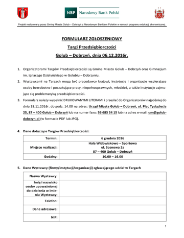 Projekt realizowany przez Gminę Miasta Golub – Dobrzyń z Narodowym Bankiem Polskim w ramach programu edukacji ekonomicznej. FORMULARZ ZGŁOSZENIOWY Targi Przedsiębiorczości Golub – Dobrzyń, dnia 06.12.2016r. 1. Organizatorami Targów Przedsiębiorczości są Gmina Miasto Golub – Dobrzyń oraz Gimnazjum im. Ignacego Działyńskiego w Golubiu – Dobrzyniu. 2. Wystawcami na Targach mogą być pracodawcy krajowi, instytucje i organizacje wspierające osoby bezrobotne i poszukujące pracy, niepełnosprawnych, młodzież, a także instytucje zajmujące się problematyką przedsiębiorczości. 3. Formularz należy wypełnić DRUKOWANYMI LITERAMI i przesłać do Organizatorów najpóźniej do dnia 18.11.2016r. do godz. 14.00 na adres: Urząd Miasta Golub – Dobrzyń, ul. Plac Tysiąclecia 25, 87 – 400 Golub – Dobrzyń lub na numer faxu: 56 683 54 15 lub na adres e-mail: [email protected] (w formacie PDF lub JPG). 4. Dane dotyczące Targów Przedsiębiorczości: Termin: Miejsce realizacji: Godziny: 6 grudnia 2016 Hala Widowiskowo – Sportowa ul. Sosnowa 2a 87 – 400 Golub – Dobrzyń 10.00 – 16.00 5. Dane Wystawcy (firmy/instytucji/organizacji) zgłaszającego udział w Targach Nazwa Wystawcy: Imię i nazwisko osoby upoważnionej do działania w imieniu Wystawcy: Telefon: Dane adresowe: NIP: 1 Projekt realizowany przez Gminę Miasta Golub – Dobrzyń z Narodowym Bankiem Polskim w ramach programu edukacji ekonomicznej. REGON: Osoba do kontaktu: Nr telefonu: Adres e – mail: Przedmiot działalności/Branża: Imię i nazwisko Nr telefonu Adres e – mail Dane osób reprezentujących Wystawcę w czasie targów: Wystawca wypełniając FORMULARZ ZGŁOSZENIOWY zgodnie z ustawą z dnia 29 sierpnia 1997 r. o ochronie danych osobowych (Dz. U. z 2016r. poz. 922) wyraża zgodę na przetwarzanie wszystkich podanych danych osobowych Wystawcy na potrzeby organizacji Targów Przedsiębiorczości, a także akceptuje postanowienia REGULAMINU UCZESTNICTWA WYSTAWCÓW W TARGACH PRZEDSIĘBIORCZOŚCI i potwierdza swój udział w Targach. ……………………………………………………………… (miejscowość i data) …………………………………………………………… (podpis i pieczęć Wystawcy) 2